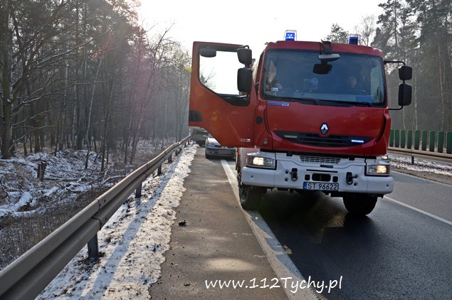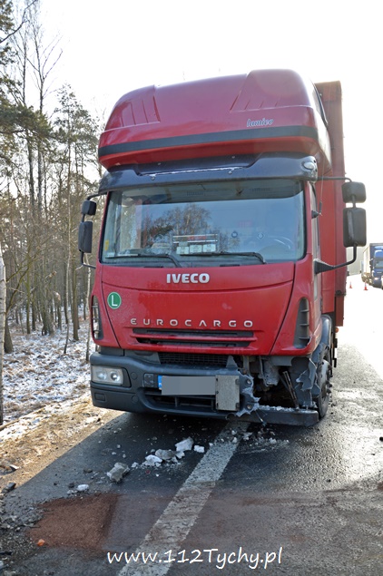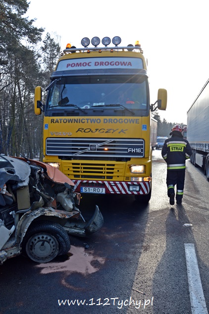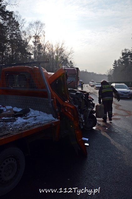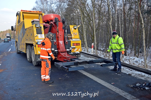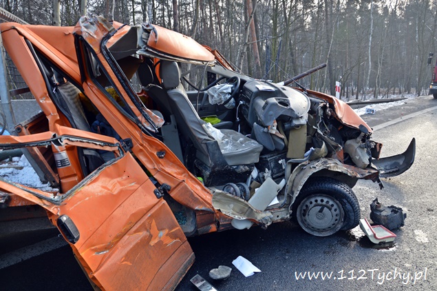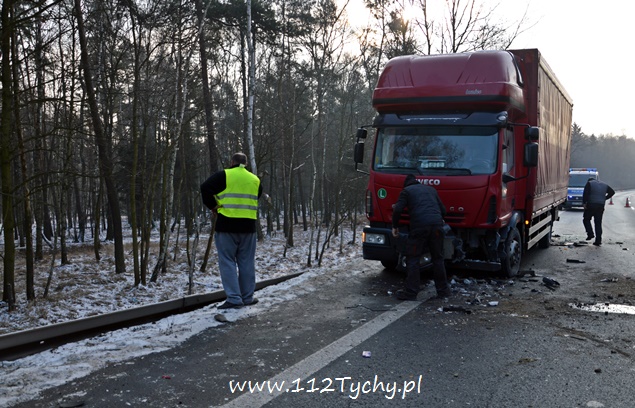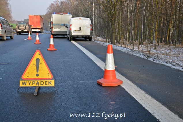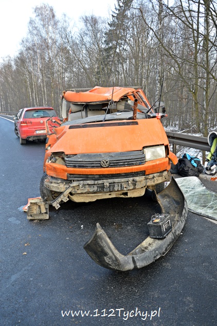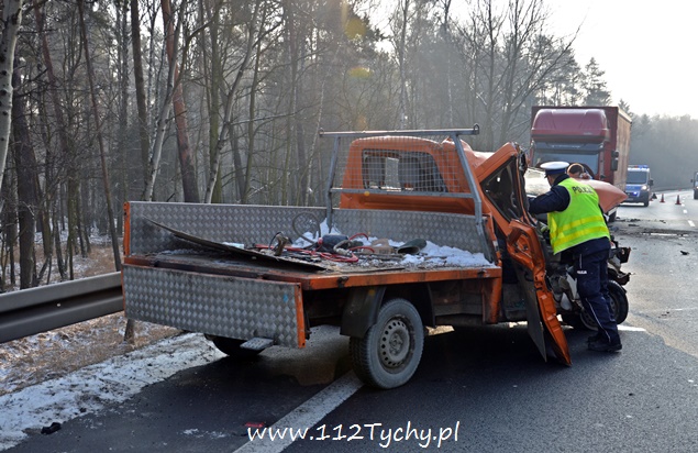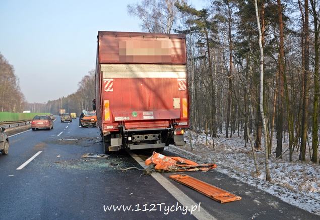 18 stycznia około godziny 9.30 do dyżurnego tyskiej Policji wpłynęło zgłoszenie o zdarzeniu drogowym na trasie DK 86 w kierunku Katowic (około 2km od zjazdu na cmentarz komunalny). Z informacji przekazanych przez zgłaszającego wynikało, że nie ma osób poszkodowanych. Na miejsce wysłany został patrol drogówki. Już w trakcie dojazdu na miejsce okazało się, że dojazd jest znacznie utrudniony – korek około półtora kilometra. Po dotarciu na miejsce interweniujący policjanci nie mogli uwierzyć w to co zobaczyli. Samochód dostawczy VW Transporter z ogromną siłą uderzył w tył ciężarowego Iveco, które zatrzymało się na poboczu w wyniku awarii (pojazd ciężarowy był należycie oznakowany). VW został dosłownie otwarty jak przysłowiowa puszka sardynek. Dach pojazdu jak i drzwi zostały z tyłu pojazdu ciężarowego, a reszta VW stała w poprzek pasa. Kierującemu VW nic się nie stało. Ruch w kierunku Katowic odbywał się tylko lewym pasem. Kierowcy byli trzeźwi. Z ustaleń pracujących na miejscu policjantów wynika, że kierujący VW młody mężczyzna rozmawiał przez telefon w czasie jazdy i się zagapił. Gapiostwo kosztowało go dużo nerwów. Ze względu na wycieki płynów eksploatacyjnych na miejsce wezwany został zastęp tyskich strażaków (GBA). Strażacy zneutralizowali wycieki oraz pomogli w uprzątnięciu pasa drogowego. Rozbite pojazdy zostały odholowane przez pomoc drogową. Zdarzenie zostało zakwalifikowane jako kolizja. Kierujący VW został ukarany mandatem.