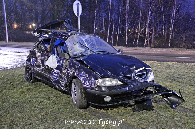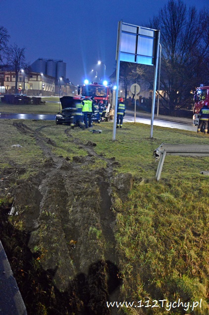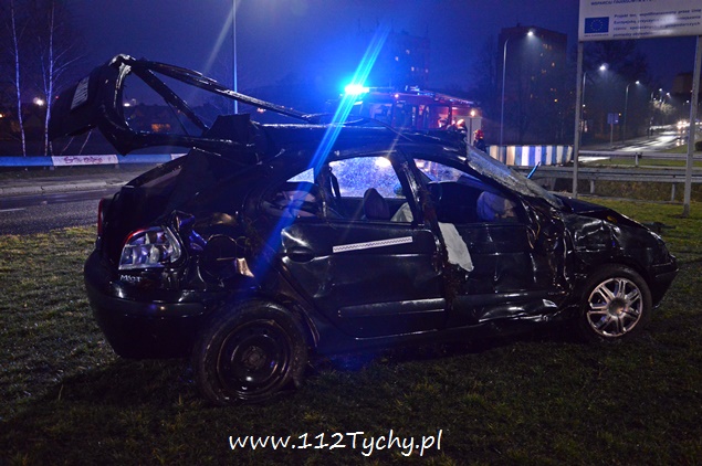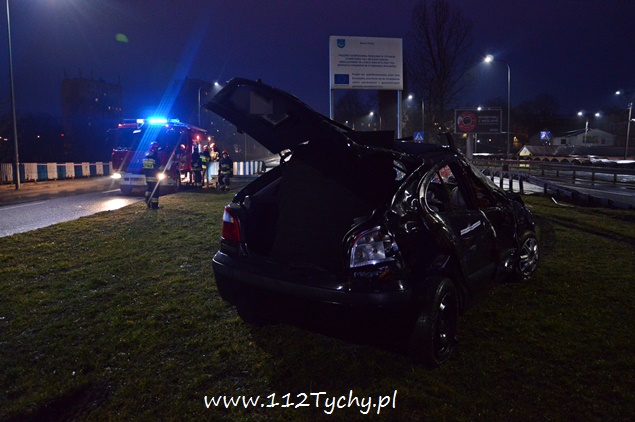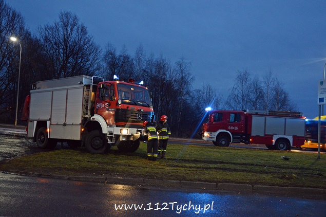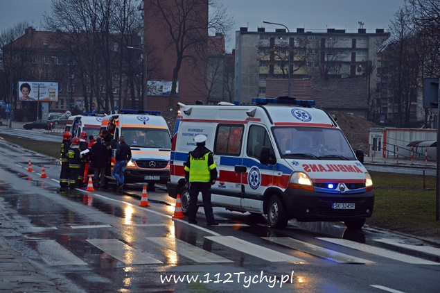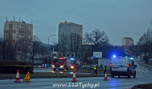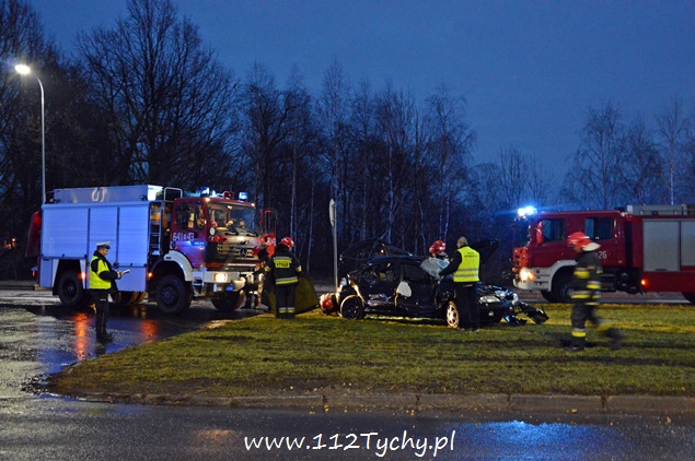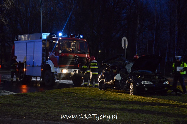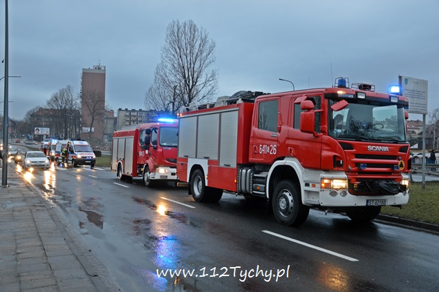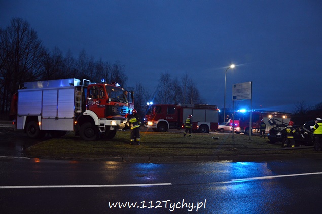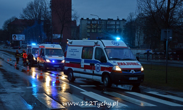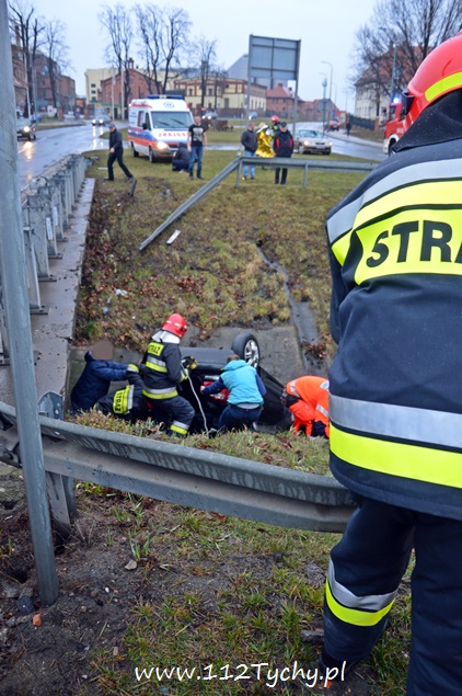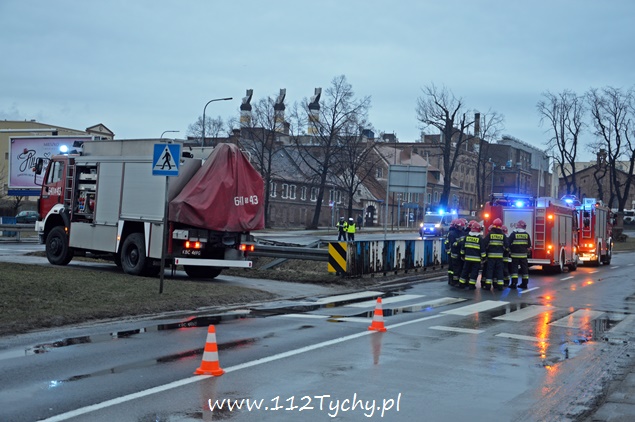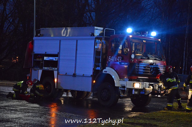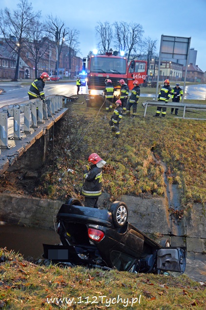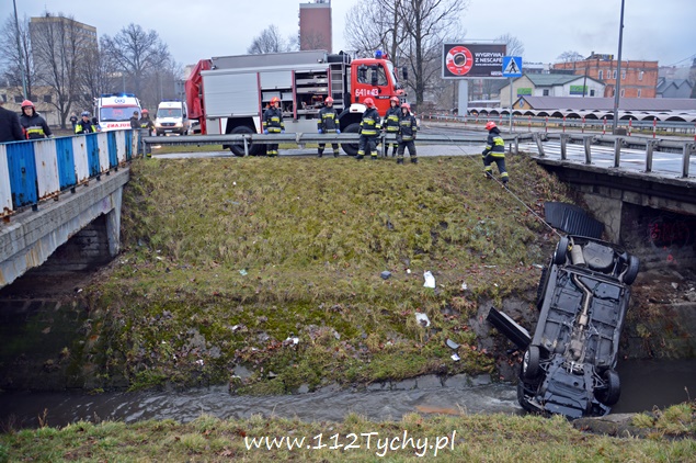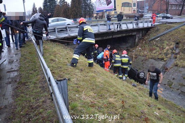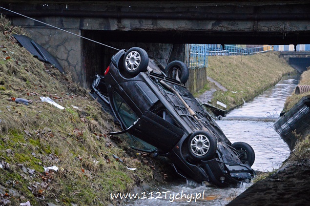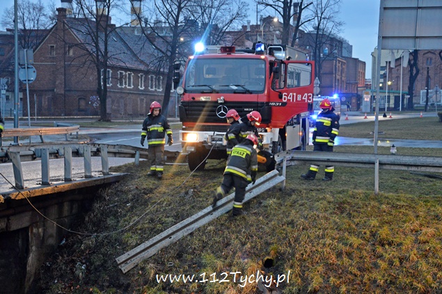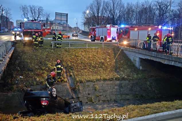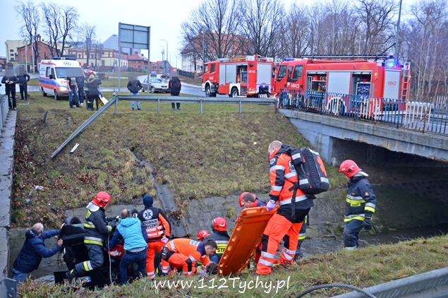 21 lutego około godziny 16.30 na alei Bielskiej na wysokości starego targu doszło do dramatycznego zdarzenia drogowego. Kierujący Renault Megane mężczyzna utracił panowanie nad swoim pojazdem i wpadł do potoku tyskiego dachując. W samochodzie poza kierowcą znajdowała się jego żona (w ciąży) i kilkuletni synek. Na pomoc poszkodowanym ruszyli inni kierowcy. Wezwana została straż pożarna z JRG Tychy w sile trzech zastępów (GBA, GCBA, SCRt), karetki pogotowia i patrol WRD KMP Tychy. Przybyli na miejsce strażacy wraz z ratownikami medycznymi przystąpili do wydobycia osób z pojazdu. Po kilku minutach wszyscy poszkodowani byli już w karetkach pogotowia. Rodzice zostali przetransportowani do szpitala w Tychach, a ich syn do szpitala w Katowicach Ligocie. Na miejsce zdarzenia przyjechali członkowie rodziny. Działania strażaków poza wyciągnięciem osób z pojazdu polegały również na jego zabezpieczeniu, wyciągnięciu z potoku oraz odłączeniu akumulatora. W trakcie działań ratowniczych ruch na alei Bielskiej był ograniczony do prawego pasa w obu kierunkach. Na miejsce wezwany został również policyjny technik. Po wykonaniu pełnej dokumentacji pojazd został odholowany, a ruch całkowicie przywrócony. Dodatkowo na miejsce wezwane zostały służby drogowe, które maja zabezpieczyć uszkodzone bariery. Policjanci KMP Tychy prowadzą dalsze czynności w sprawie tego zdarzenia.