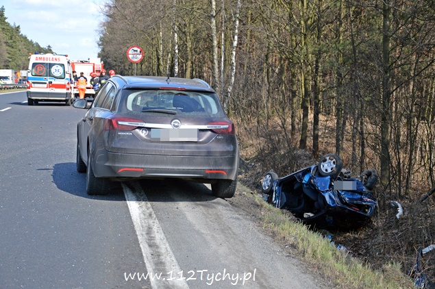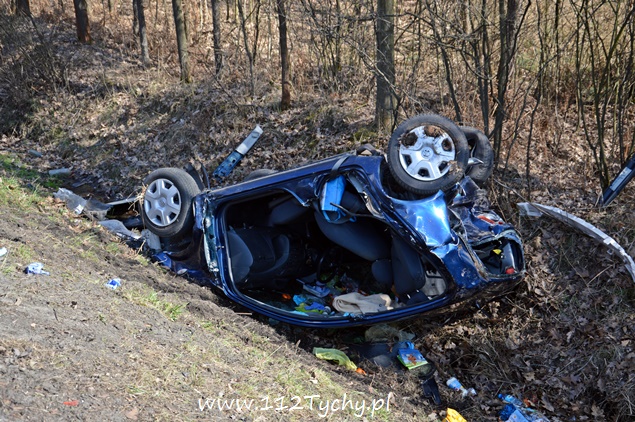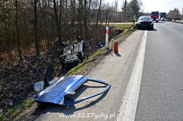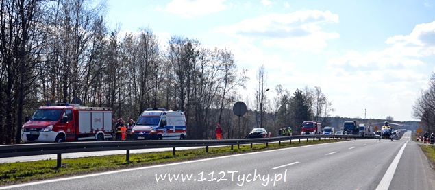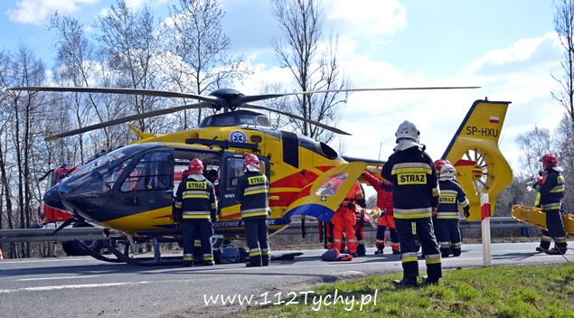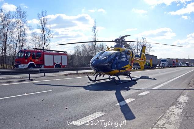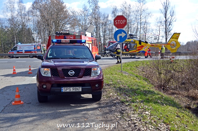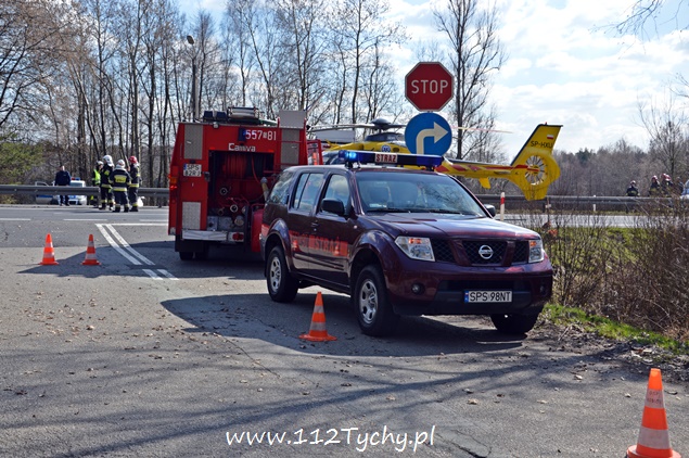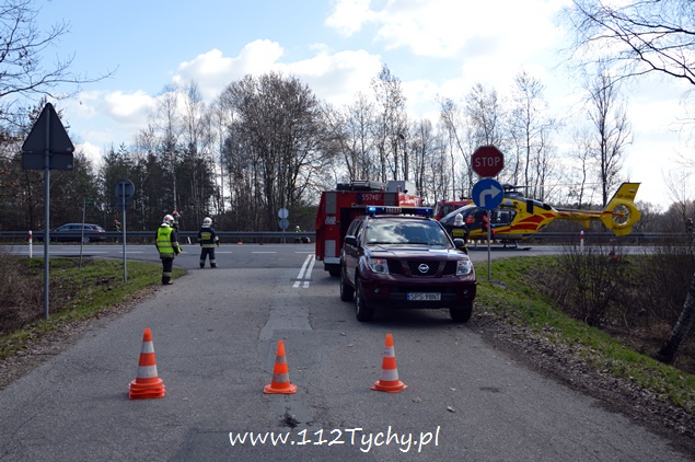 24 marca około godziny 12 na DK 1 na wysokości Kobióra w kierunku Tychów doszło do wypadku drogowego. W Toyotę uderzył Opel. Toyota uderzona w tył wpadła do przydrożnego rowu i dachowała. Na miejsce zdarzenia wysłane zostały trzy zastępy JRG Tychy (GBA, GCBA, SCRt), trzy zastępy JRG Pszczyna (GBA, SLRt, SLRr), jeden zastęp OSP Kobiór (GBA), karetki pogotowia i patrole pszczyńskiej Policji. Ruch w kierunku Tychów na czas trwania działań ratowniczych został całkowicie wstrzymany. Dwie osoby podróżujące Toyotą zostały poszkodowane. Kobieta w ciężkim stanie została zabrana karetką do szpitala. Do poszkodowanego mężczyzny został wezwany śmigłowiec LPR Ratownik 6 z bazy w Krakowie. Na czas lądowania, transportu rannego i odlotu LPR ruch na trasie DK 1 został całkowicie wstrzymany w obu kierunkach. Mężczyzna został zabrany do szpitala w Sosnowcu. Po odlocie śmigłowca z poszkodowanym ruch w kierunku Pszczyny został udrożniony całkowicie, a w kierunku Tychów ruch odbywał się lewym pasem. Dokładne przyczyny i okoliczności tego wypadku wyjaśni policyjne dochodzenie.