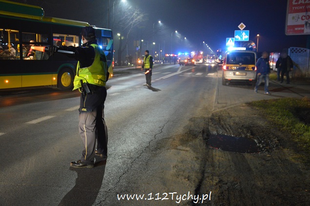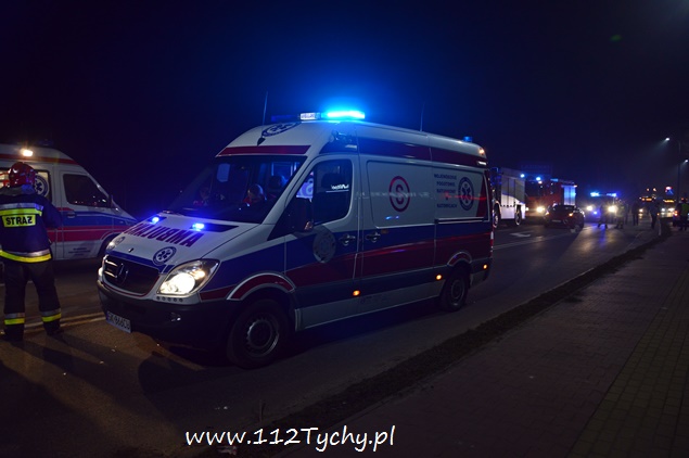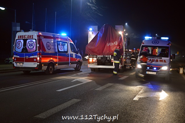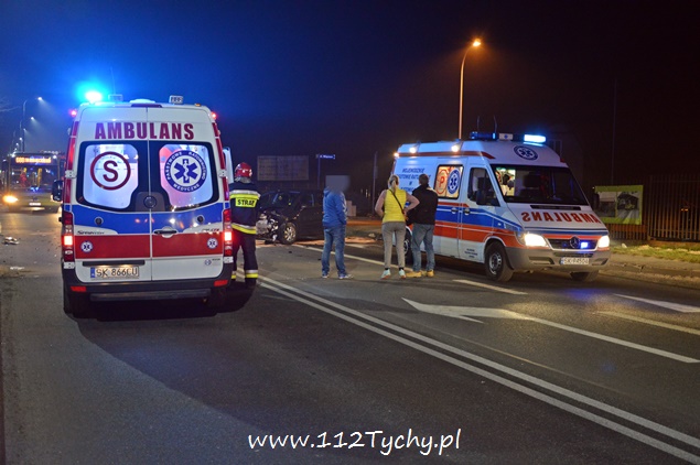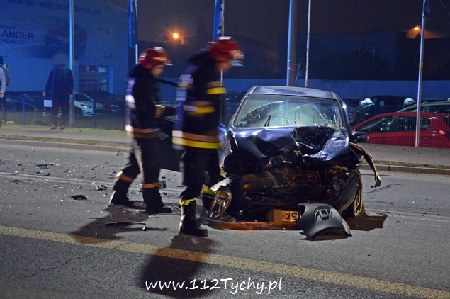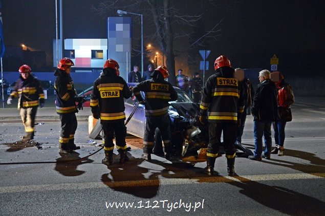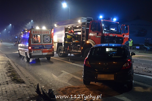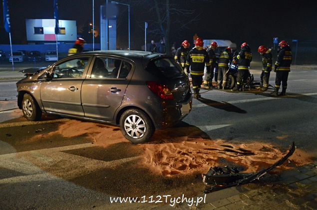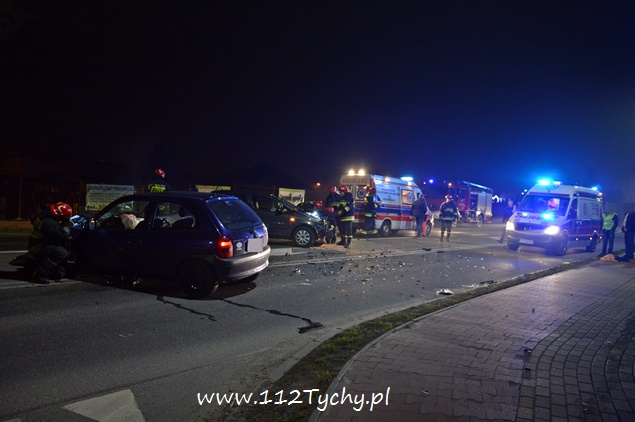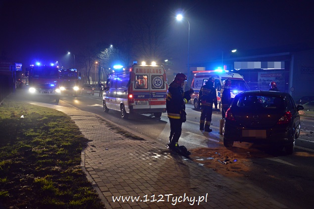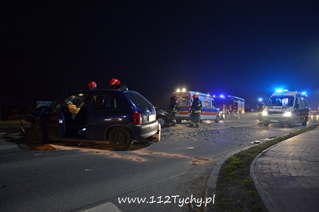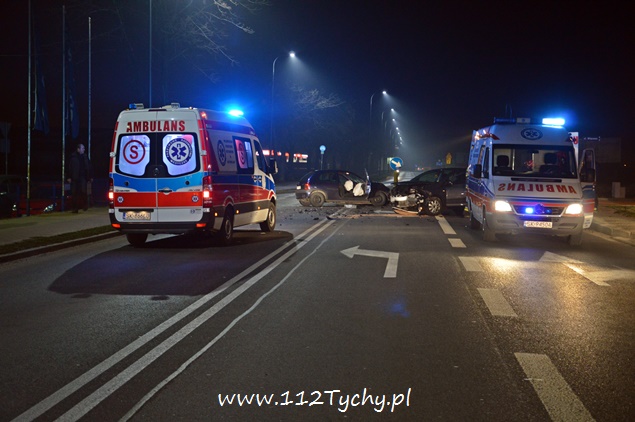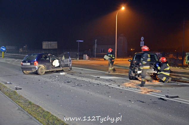 24 marca przed godziną 21 na skrzyżowaniu ulic Katowickiej z Wiązową i Różaną doszło do czołowego zderzenia dwóch Opli Corsa. Na miejsce natychmiast wysłane zostały trzy zastępy JRG Tychy (GBA, GCBA, SCRt), dwa ZRM i patrol drogówki. Po dotarciu na miejsce okazało się, że poszkodowanych zostało dwóch mężczyzn – kierujący pojazdami. Ruch na ulicy Katowickiej w miejscu zdarzenia został całkowicie wstrzymany. Do pomocy w zabezpieczeniu miejsca zdarzenia oraz kierowaniu pojazdów na objazdy na miejsce wezwany został kolejny patrol Policji oraz patrol tyskiej Straży Miejskiej. Obydwaj kierujący zostali zabrani do szpitala. Ze wstępnych ustaleń pracujących na miejscu funkcjonariuszy Policji wynika, że jeden z kierowców wykonując manewr skrętu w ulicę Różaną nie ustąpił pierwszeństwa jadącemu prawidłowo ulicą Katowicką. Na miejsce wezwany został również policyjny technik. Policjanci KMP Tychy prowadzą dalsze czynności w sprawie tego zdarzenia.