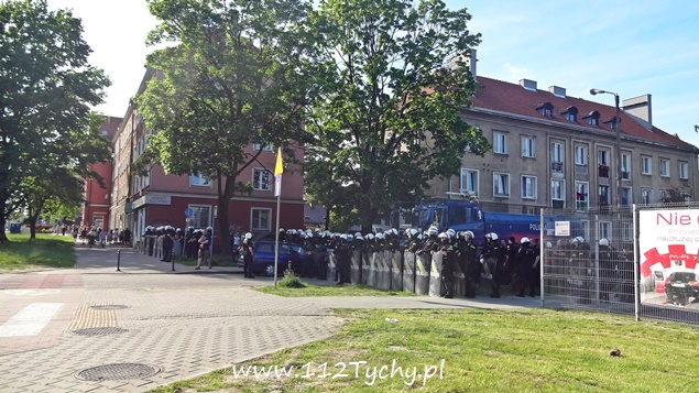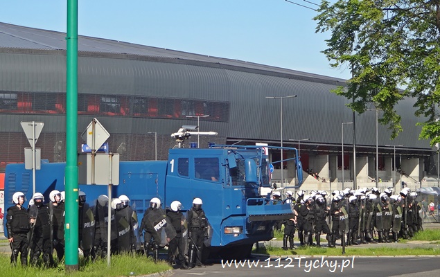 22 maja tyscy policjanci, wspierani przez mundurowych z katowickiego oddziału prewencji, zabezpieczali mecz piłki nożnej pomiędzy drużynami GKS Tychy i Radomiak Radom. Mundurowi strzegli bezpieczeństwa mieszkańców Tychów i kibiców – nie tylko wokół stadionu i na trasach dojazdowych, ale w całym mieście. Policjanci podjęli już działania zmierzające do identyfikacji osób, które podczas meczu odpaliły race świetlne oraz zdewastowały policyjne radiowozy. Mecz drużyny tyskiej z drużyną z Radom, od początku traktowany był jako mecz podwyższonego ryzyka. Dlatego też do jego zabezpieczenia skierowano znaczne siły. Dla zwiększenia bezpieczeństwa i zapobieżenia incydentom przed i po meczu, tyskich policjantów wspierali mundurowi z katowickiego oddziału prewencji.