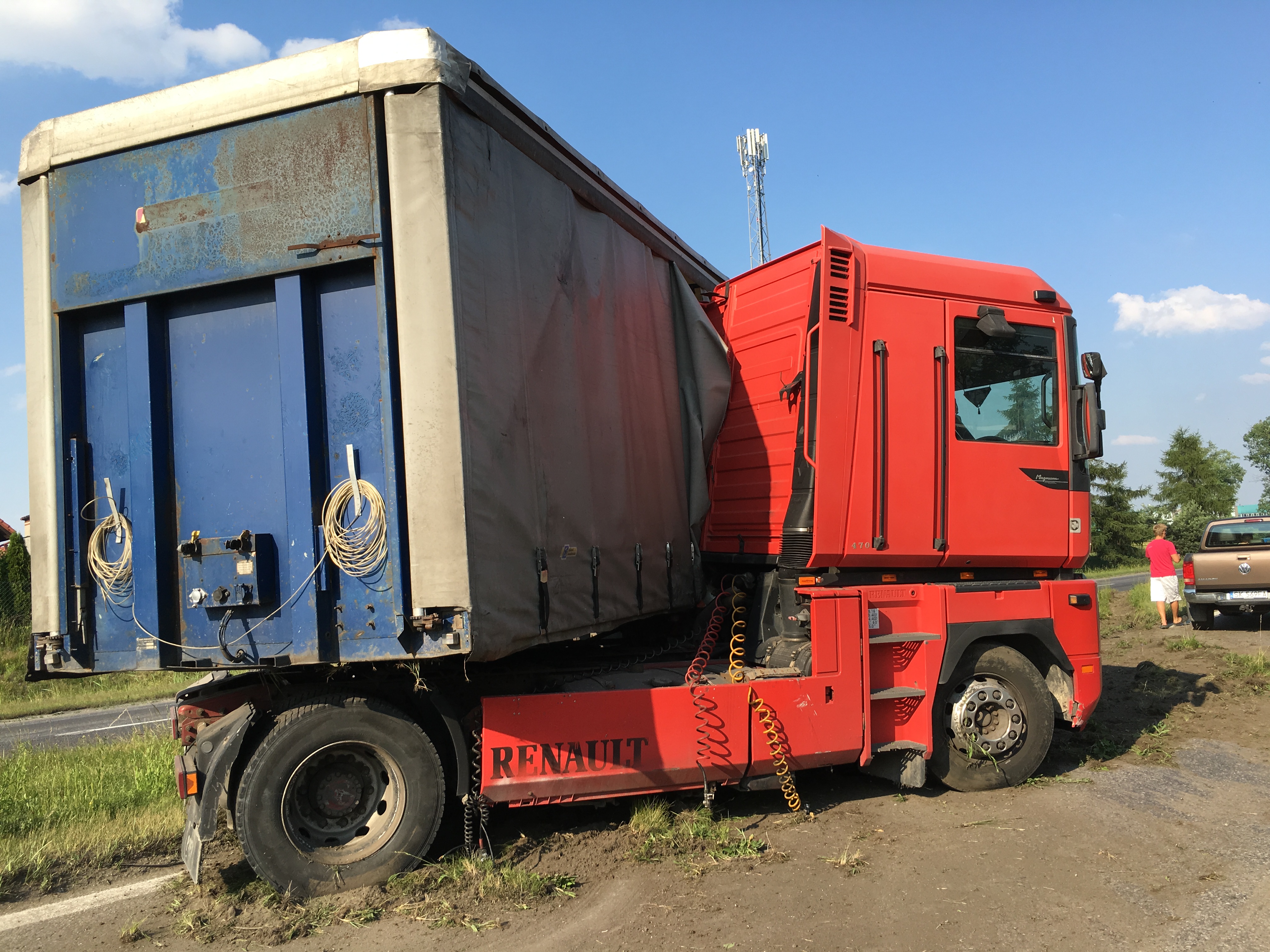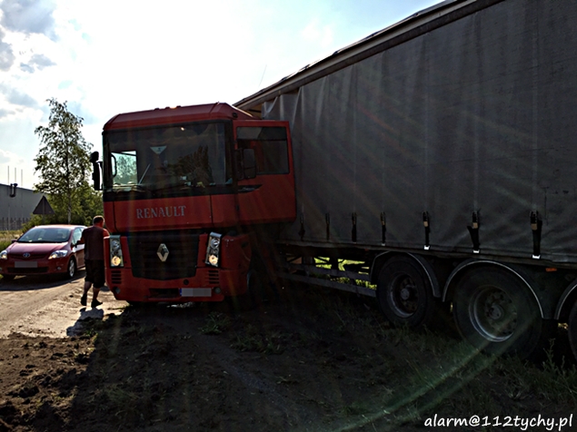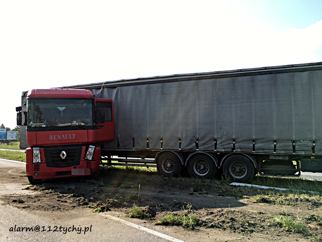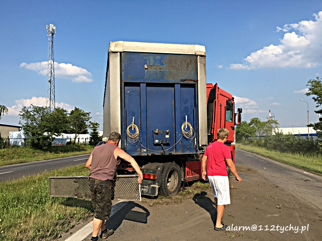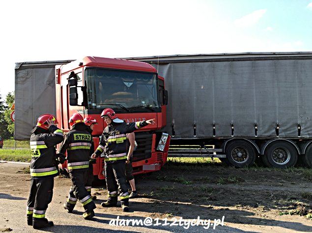 23 czerwca około godziny 17.30 do MSK w Tychach wpłynęło zgłoszenie o zdarzeniu drogowym na ulicy Turyńskiej (DK 44). Ze zgłoszenie wynikało, że samochód ciężarowy z niewyjaśnionych przyczyn „złamał się” zablokował pas w kierunku Bierunia i zatrzymał na pasie zieleni oddzielającej jezdnie. Na miejsce wysłane zostały dwa zastępy strażaków z JRG Tychy (GCBA, SCRT) i patrol Policji. Po dotarciu na miejsce okazało się, że z pojazdu ciężarowego wyciekają płyny eksploatacyjne. Strażacy zabezpieczyli miejsce zdarzenia, zneutralizowali płyny eksploatacyjne. Naczepa została przepięta do podstawionego ciągnika siodłowego, a uszkodzony pojazd został przy użyciu wozu bojowego straży pożarnej odholowany w bezpieczne miejsce. Na czas usuwania zawalidrogi ruch na DK 44 w obu kierunkach został wstrzymany. Utrudnienia trwały około godziny.