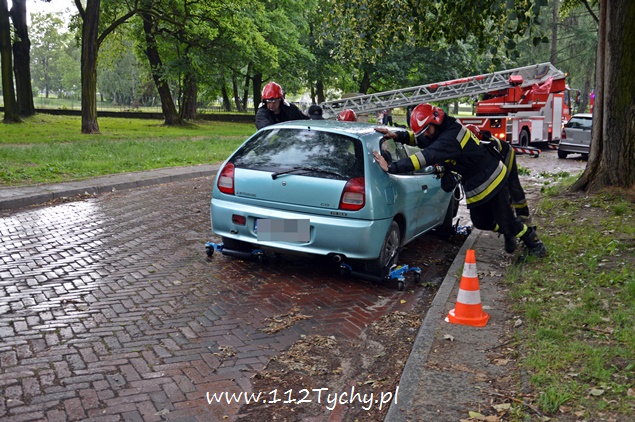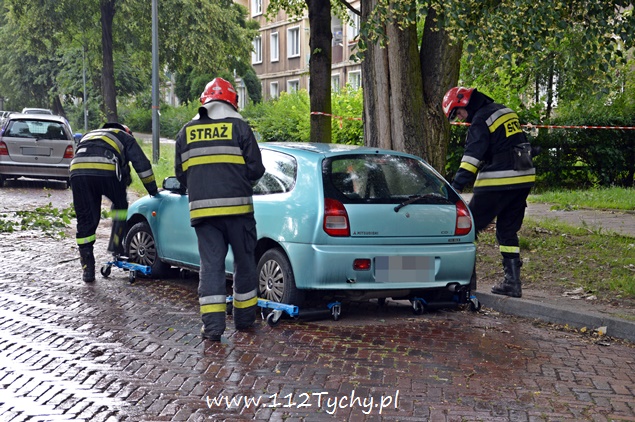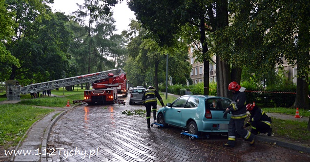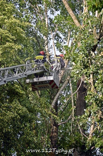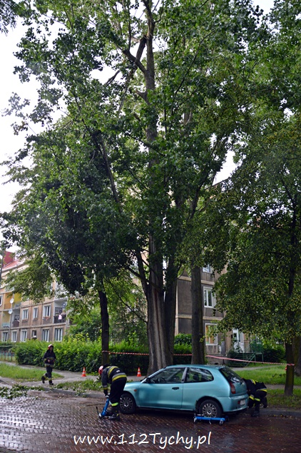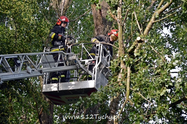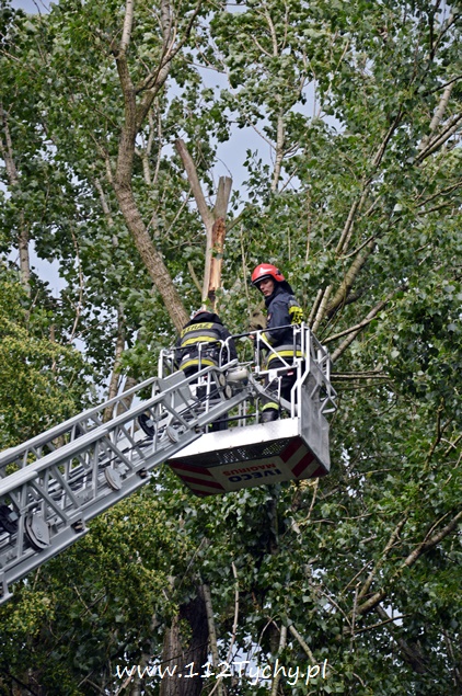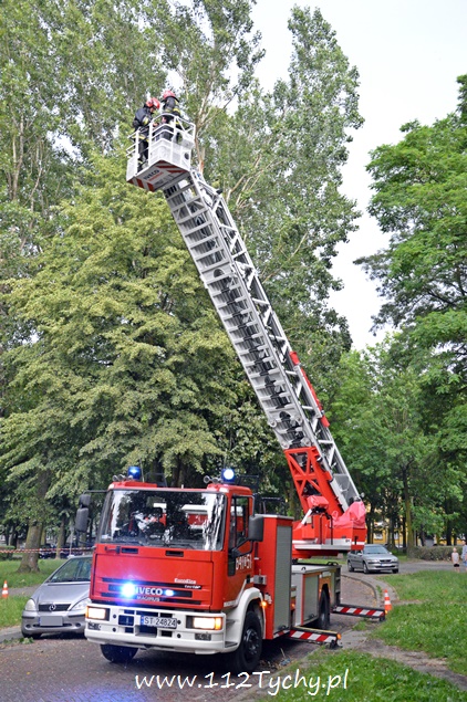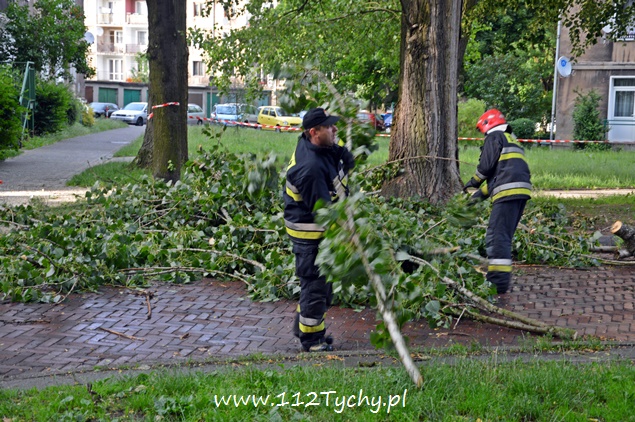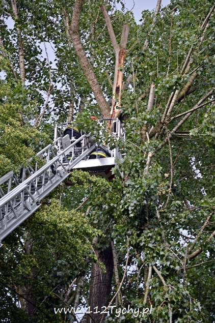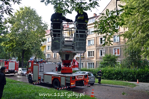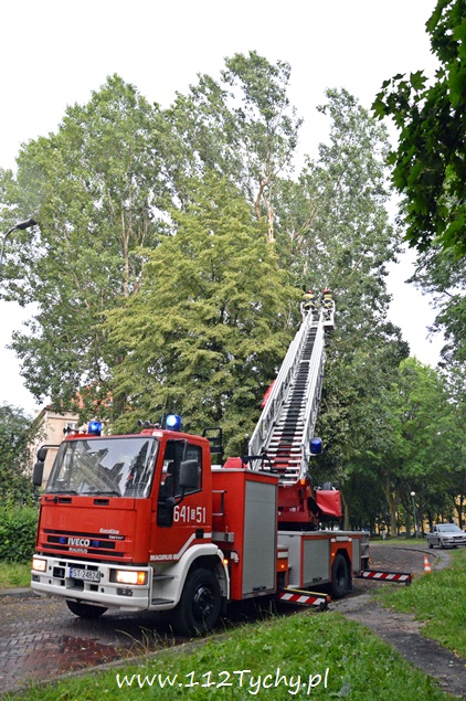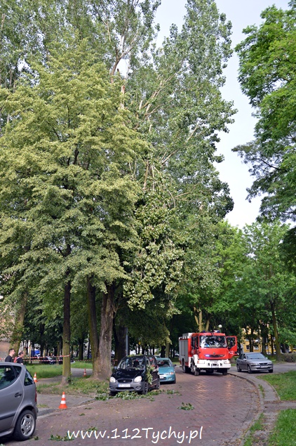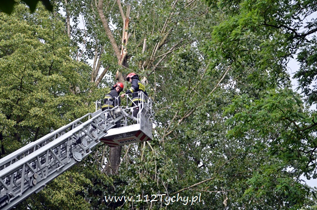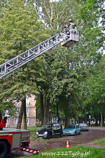 25 czerwca po godzinie 18 do MSK w Tychach wpłynęło zgłoszenie o zwisającym konarze nad ulicą Czystą w rejonie numeru 11. Na miejsce wysłany został jeden zastęp JRG Tychy (GBA). Po dotarciu na miejsce i rozpoznaniu sytuacji okazało się, że konar wisi na wysokości 10 – 12m nad ziemią, a pod nim znajdują się dwa samochody osobowe. Dodatkowo KDR na miejsce wezwał dodatkowy zastęp (SD). W czasie gdy strażacka drabina dojeżdżała na miejsce działań, pojawił się właściciel jednego z pojazdów. Jednak do czasu zabezpieczenia miejsca działań pojazdy nie zostały usunięte. Po dotarciu na miejsce i sprawieniu drabiny mechanicznej strażacy zabezpieczyli zwisający konar przy użyciu liny. Po zabezpieczeniu, strażacy używając specjalnych wózków podkładanych pod koła samochodu usunęli drugi z zaparkowanych pojazdów. Wówczas przy użyciu pilarki łańcuchowej konar został usunięty. Na czas działań ruch na ulicy Czystej został wstrzymany. Po ścięciu, pozostałości zostały ułożone na pobliskim trawniku. Działania trwały około godziny.