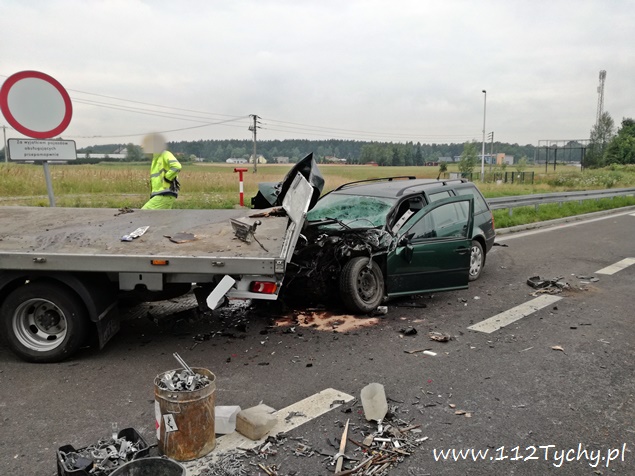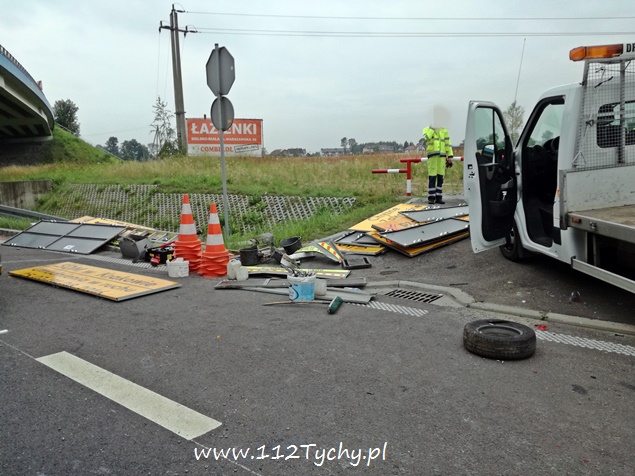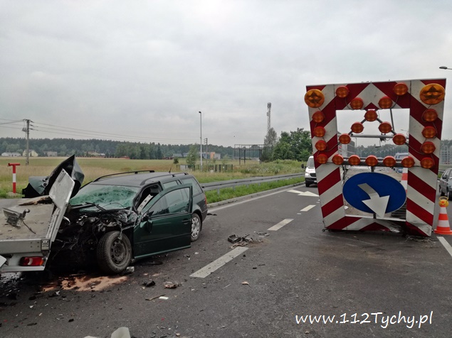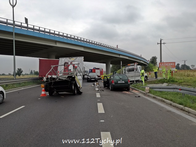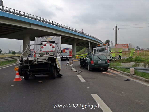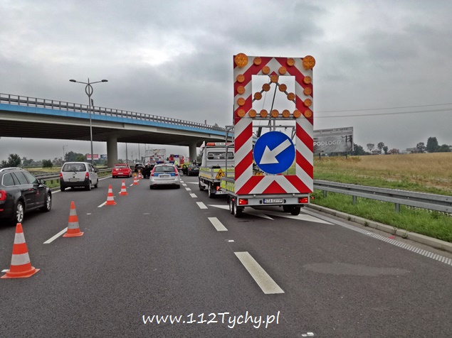 19 lipca około godziny 7.35 na trasie DK 86 w rejonie węzła z S1 (około 150 – 200m od salonu Toyoty) na pasie w kierunku Pszczyny doszło do zdarzenia drogowego. W samochód służb drogowych wjechał kierujący samochodem osobowym VW. O zdarzeniu natychmiast poinformowane zostały wszystkie służby. Na ratunek ruszyły trzy zastępy JRG Tychy (GBA, GCBA, SCRt), ZRM i patrol Policji. Miejsce zdarzenia zostało zabezpieczone przez pracowników służby drogowej. Kierujący samochodem osobowym został zabrany do szpitala na dokładne badania. Ruch w miejscu zdarzenia odbywał się tylko jednym lewym skrajnym pasem, tworzyły się korki. Utrudnienia trwały około trzech godzin. Przyczyny i okoliczności tego zdarzenia są wyjaśniane przez tyskich policjantów.