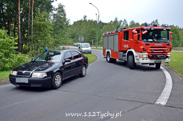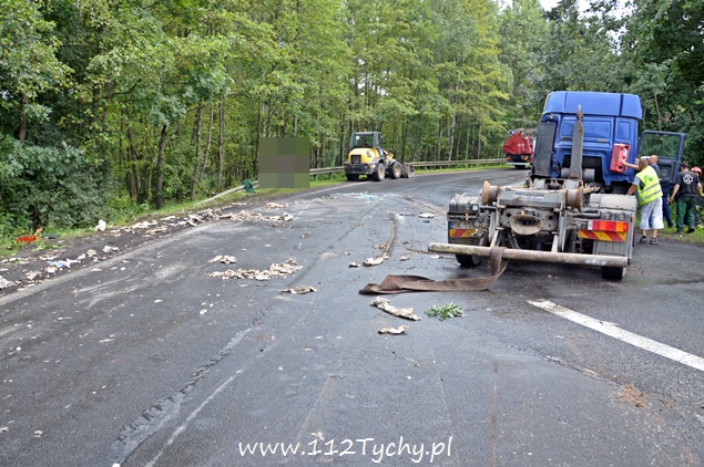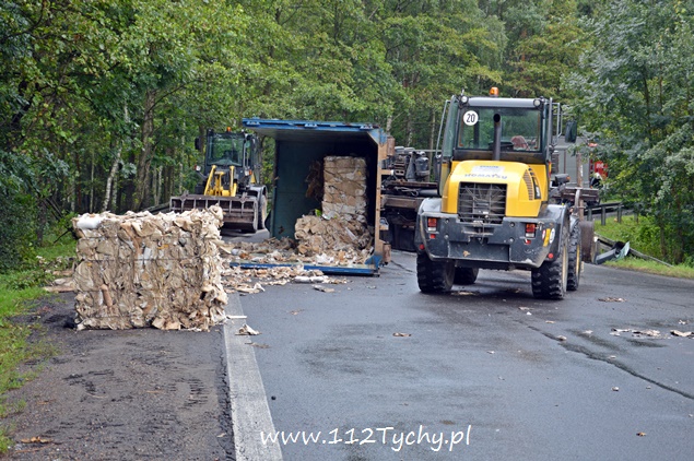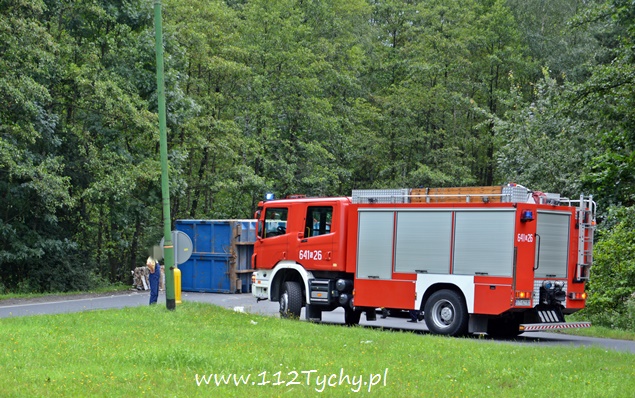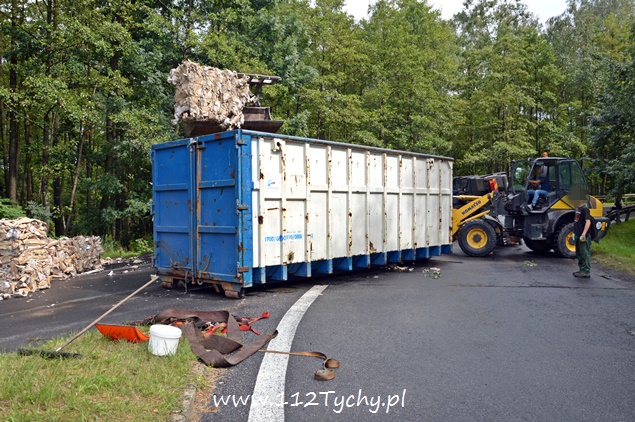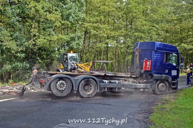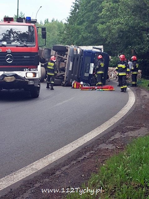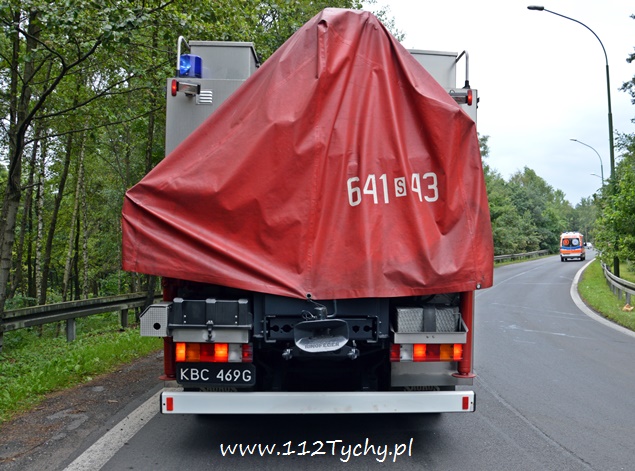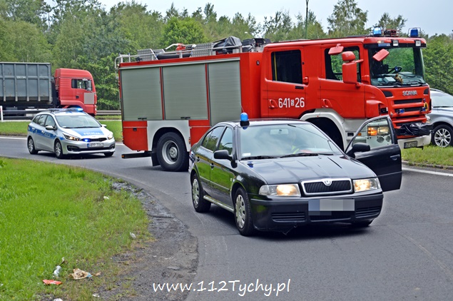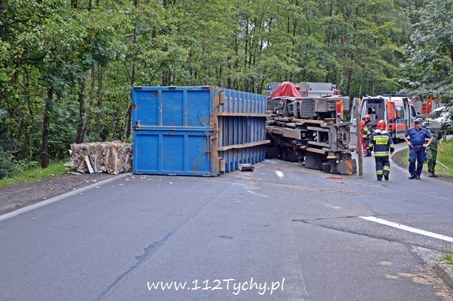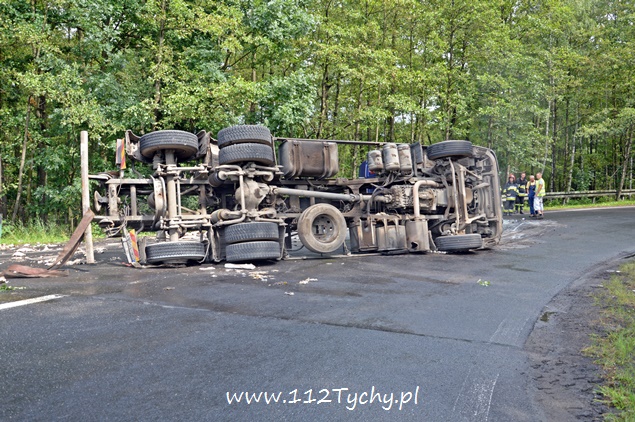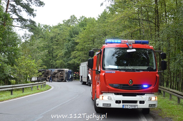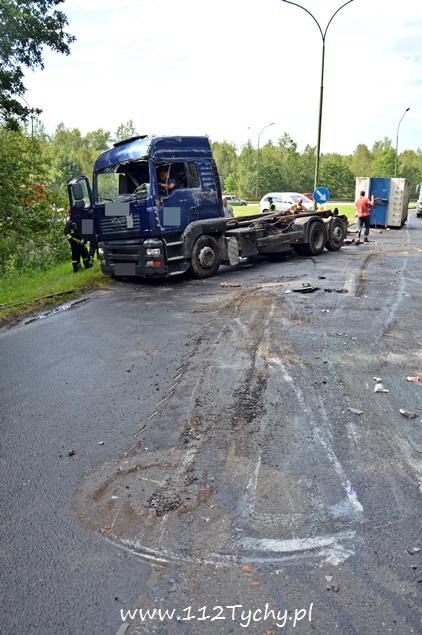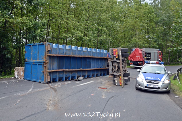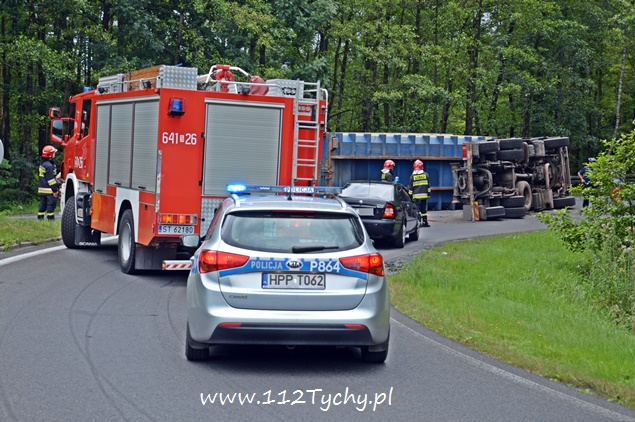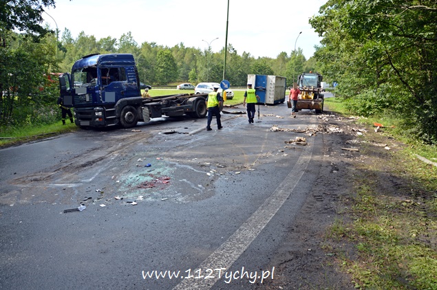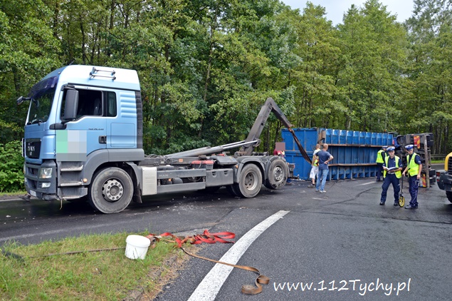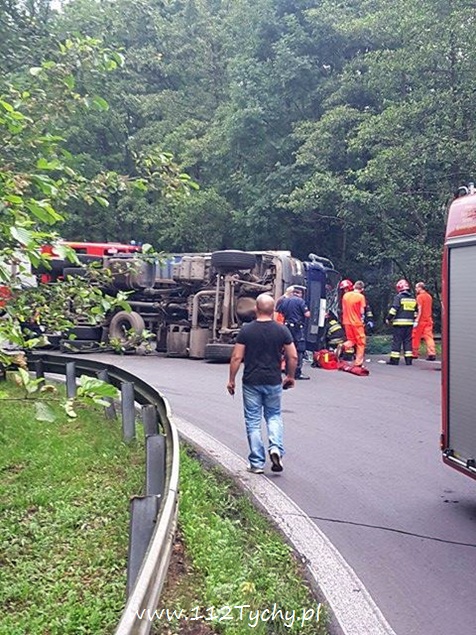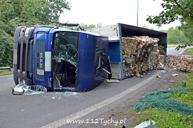 29 lipca około godziny 13 do MSK w Tychach wpłynęło zgłoszenie o zdarzeniu drogowym na zjeździe z DK 86 na pasie na Katowice w kierunku Kostuchny. Na miejsce zadysponowane zostały trzy zastępy z JRG Tychy (GBA, GCBA, SCRt), ZRM i patrole Policji z Tychów i Katowic. Po dotarciu na miejsce okazało się, że kierujący samochodem ciężarowym MAN przewożący kontener z makulaturą wywrócił się na łuku drogi nalewy bok przed maską nadjeżdżającego z naprzeciwka samochodu osobowego. Strażacy po dotarciu na miejsce zabezpieczyli je i przystąpili do uwolnienia zakleszczonego w kabinie kierowcy. Po wybiciu przedniej szyby mężczyzna został wydobyty z kabiny i przekazany ratownikom medycznym. Został on zabrany do szpitala na dokładniejsze badania. Ruch na tym odcinku drogi został całkowicie wstrzymany. Na miejsce przyjechał właściciel firmy. Sprowadzony został ciężki sprzęt (z firmy sprawcy zdarzenia), dzięki któremu udało się uprzątnąć drogę i usunąć rozbity pojazd. Usuwanie skutków tego zdarzenia trwało blisko trzy i pół godziny. Dodatkowo strażacy zneutralizowali lamę płynów eksploatacyjnych, które wylały się z rozbitego pojazdu. Tyscy Policjanci prowadzą dalsze czynności w sprawie tego zdarzenia.