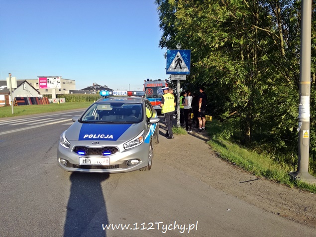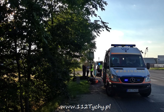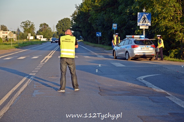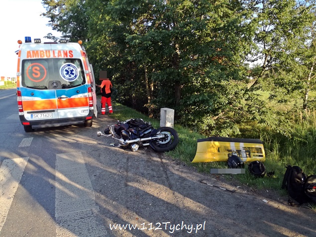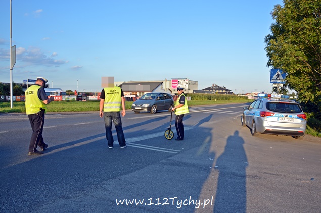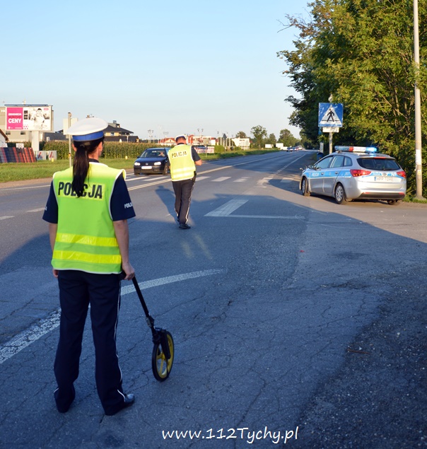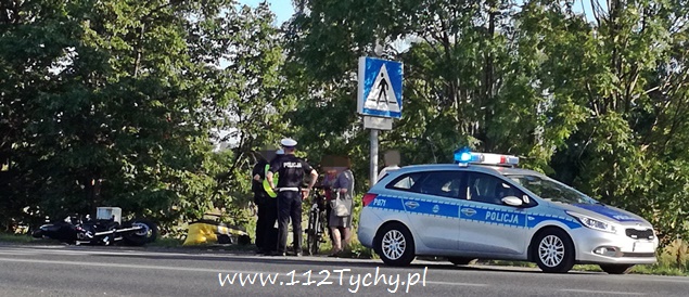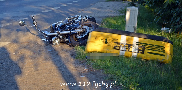 7 sierpnia około godziny 18.40 na ulicy Oświęcimskiej (DK 44) w rejonie skrzyżowania z ulicami Sadową i Czarną doszło do zdarzenia drogowego z udziałem jednośladu i samochodu osobowego. Na miejsce wezwany został ZRM i patrol drogówki. Jak się okazało w toku wykonywanych czynności kierujący samochodem osobowym Fiat Cinqecento mieszkaniec powiatu bieruńsko – lędzińskiego włączając się do ruchu z ulicy Czarnej nie ustąpił pierwszeństwa jadącemu ulicą Oświęcimską jednośladowi. Kierujący jednośladem widząc sytuację drogową zahamował i położył swój pojazd, a następnie uderzył w osobówkę urywając jej zderzak. Kierujący osobówką po zdarzeniu uciekł z miejsca zdarzenia nie udzielając pomocy podróżującym motocyklem. Pierwszej pomocy kierującemu jednośladem udzielił jeden z naszych reporterów, a następnie mężczyzna został zabrany do szpitala na dokładniejsze badania (uskarżał się na ból nogi). Podróżującej z nim kobiecie nic się nie stało. Na miejsce wezwany został policyjny technik i dodatkowy patrol drogówki. Na czas wykonywania dokumentacji ruch na ulicy Oświęcimskiej był czasowo wstrzymywany. Policjanci nie będą mieli większego problemu z ustaleniem sprawcy zdarzenia, ponieważ razem ze zderzakiem z samochodu odpadła tablica rejestracyjna. Tyscy policjanci prowadzą dalsze czynności w sprawie tego wypadku.