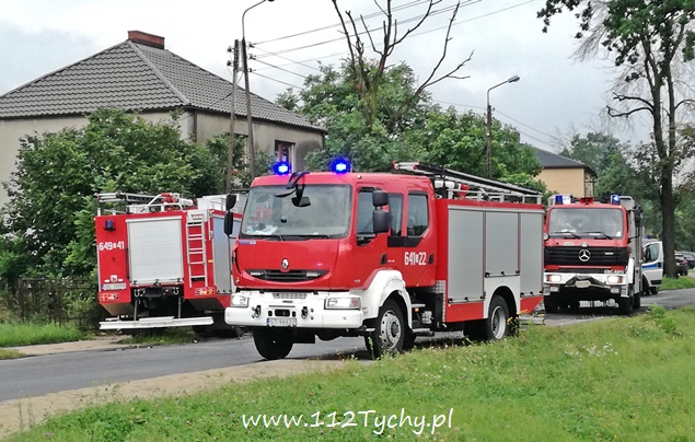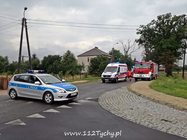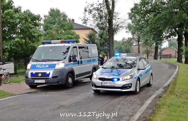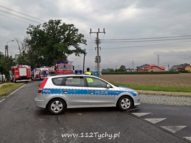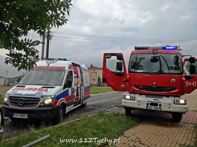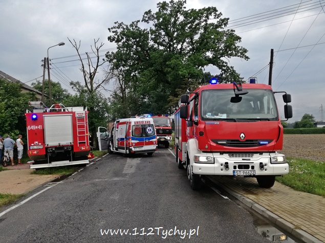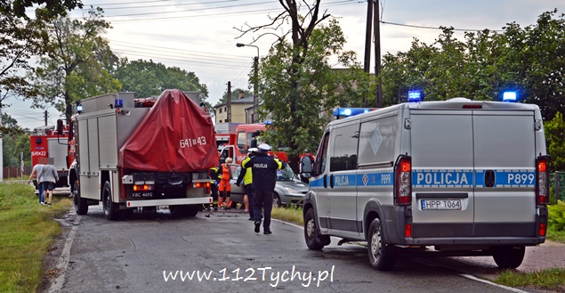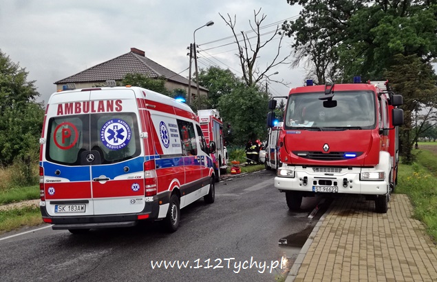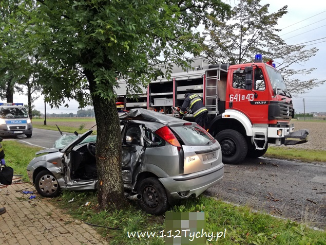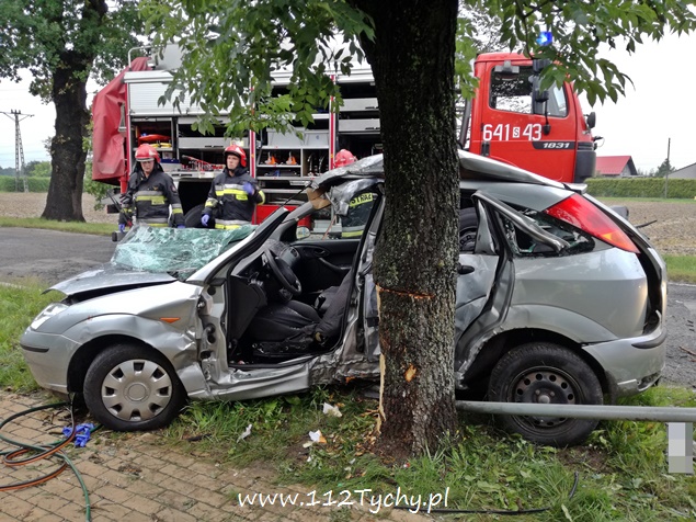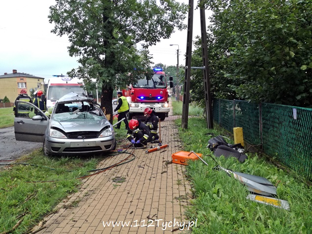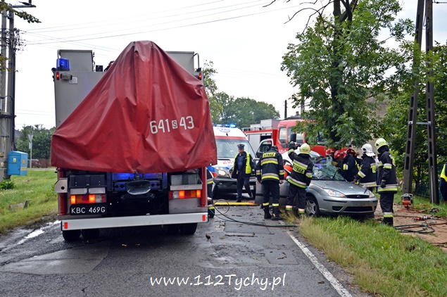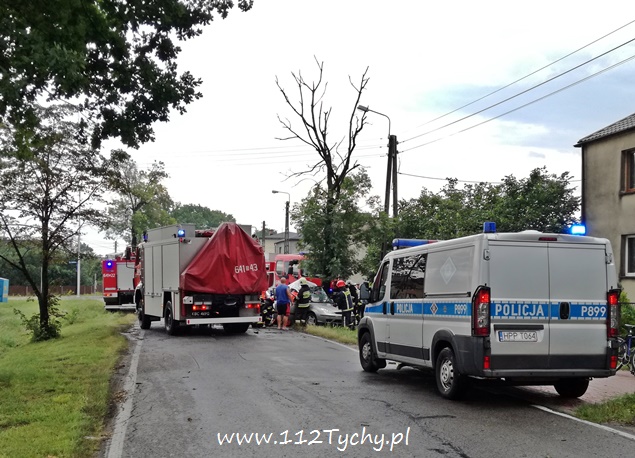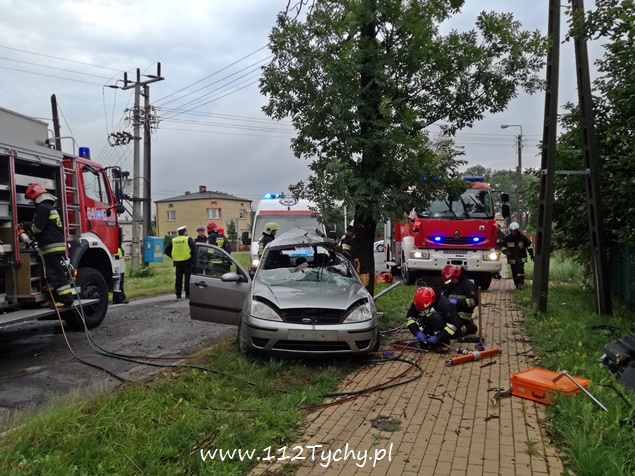 9 sierpnia około godziny 18 do MSK w Tychach wpłynęło zgłoszenie o wypadku drogowym na ulicy Mysłowickiej w rejonie skrzyżowania z ulicą Jaroszowicką. Na miejsce wysłane zostały zastępy OSP Lędziny (GBA), JRG Tychy (GBA, SCRt), patrole drogówki i dwa ZRM. Ze zgłoszenia wynikało, że kierująca samochodem Ford uderzyła w drzewo. Po dotarciu na miejsce zgłoszenie potwierdziło się. Ruch na ulicy Mysłowickiej został całkowicie wstrzymany. Ratownicy zabezpieczyli teren działań i przystąpili do uwalniania osób zakleszczonych w rozbitym pojeździe. Pasażer Forda po kilku minutach został przekazany ZRM i odwieziony do szpitala w Tychach. Kierującą Fordem wydobyto z pojazdu przy użyciu narzędzi hydraulicznych, a następnie została ona przetransportowana do szpitala w Sosnowcu (obrażenia wewnętrzne, uraz biodra). Ze względu na warunki pogodowe nie było możliwe wezwanie latającej karetki. Na miejsce wezwany został policyjny technik. Tyscy policjanci prowadzą czynności mające na celu wyjaśnienie przyczyn i okoliczności tego zdarzenia.