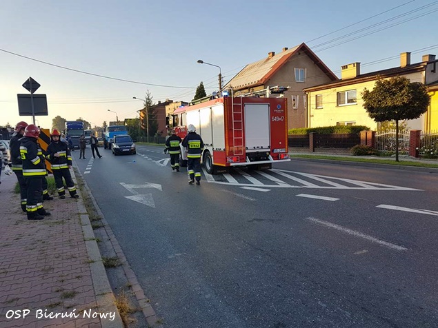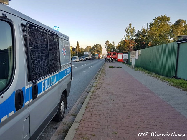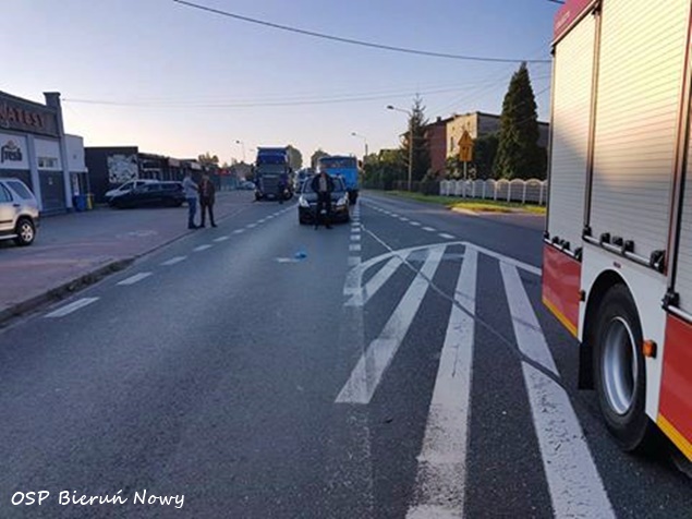 26 sierpnia około godziny 6.20 w Bieruniu Nowym na ulicy Warszawskiej (DK 44) doszło do potrącenia pieszego przez kierującego motocyklem. Na miejsce wysłane zostały ZRM, patrole bieruńskiej Policji i zastępy straży pożarnej: OSP Bieruń Nowy (GBARt), OSP Bieruń Stary (GBA) i JRG Tychy (GBA, GCBARt, SCRt). Droga w miejscu zdarzenia została zablokowana w obu kierunkach. Pierwszej pomocy przed przyjazdem ratowników poszkodowanemu 64 letniemu mężczyźnie udzielili świadkowie zdarzenia. Kierujący motocyklem 33 letni mężczyzna oddalił się z miejsca wypadku nie udzielając pomocy poszkodowanemu jeszcze przed przyjazdem służb ratunkowych (jest poszukiwany przez Policję). Poszkodowany 64 latek został odwieziony do szpitala na dokładniejsze badania. Po około trzydziestu minutach zastępy straży pożarnej wróciły do koszar, a droga została odblokowana. Jak ustalili bieruńscy policjanci pieszy przechodził przez jezdnię w miejscu gdzie nie jest wyznaczone przejście dla pieszych. Bieruńscy Policjanci prowadzą dalsze czynności mające na celu wyjaśnienie tego zdarzenia.