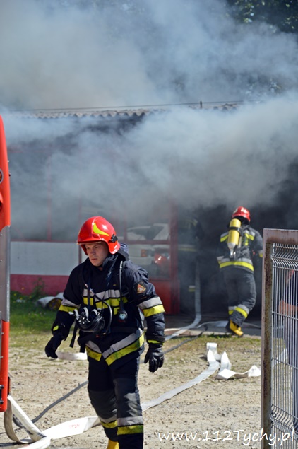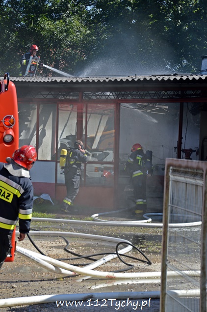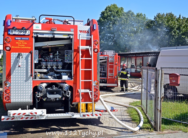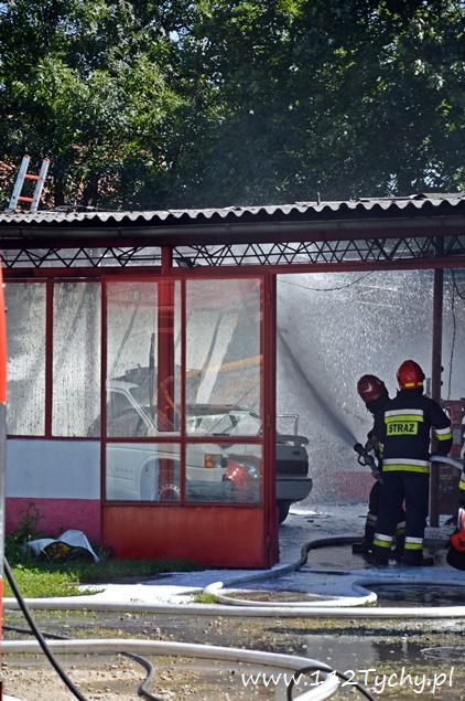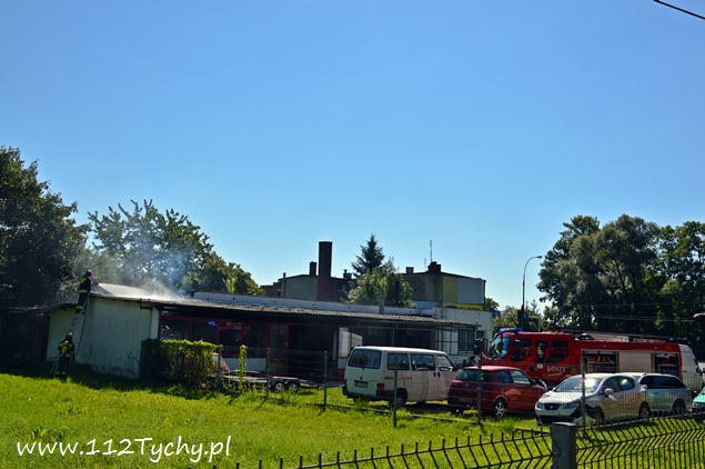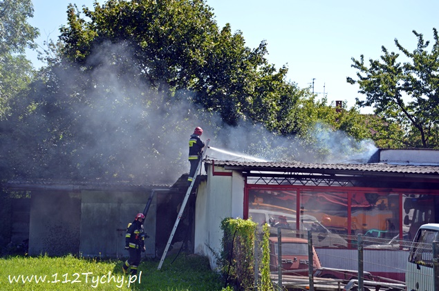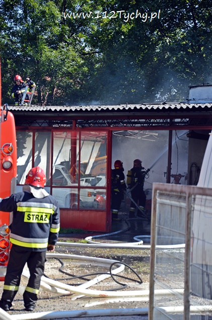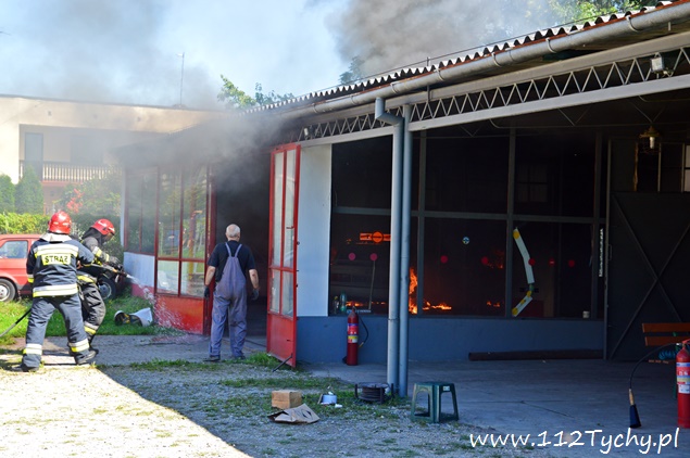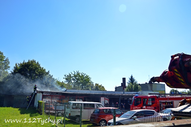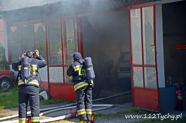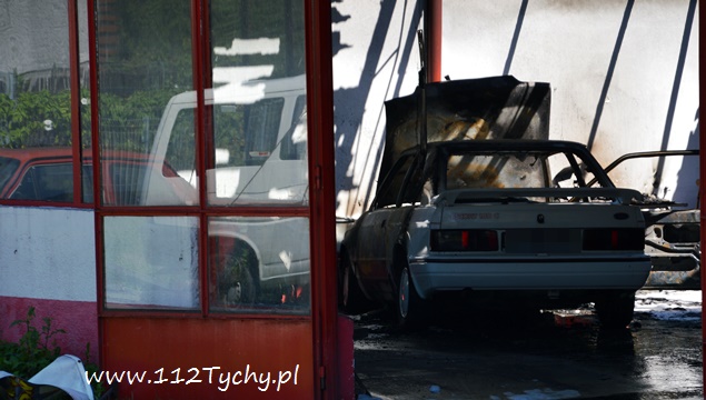 27 sierpnia około godziny 11 do MSK w Tychach wpłynęło zgłoszenie o pożarze samochodu osobowego w jednym z warsztatów samochodowych przy ulicy Mikołowskiej (w rejonie ulicy Gołębiej). Na miejsce natychmiast wysłane zostały dwa zastępy JRG Tychy (GBA, GCBARt) i patrol Policji. Po dotarciu na miejsce okazało się, że pożarem objęty jest samochód osobowy Ford oraz pomieszczenie warsztatowe, w którym się on znajduje. Strażacy w aparatach ochrony układu oddechowego (AOUO) weszli do pomieszczenie i podali jeden prąd wody, a następnie piany na palący się samochód oraz jeden prąd wody na dach pomieszczenia z drabiny nasadkowej. Jeszcze przed przyjazdem straży pożarnej właściciel warsztatu jak i będący w pobliżu pracownicy sąsiednich pomieszczeń wypchnęli z zagrożonego rejonu kilka innych samochodów. Próbowali oni również przy użyciu gaśnic opanować pożar jednak bezskutecznie. Właściciel spalonego pojazdu doznał niewielkich oparzeń – pomoc medyczna okazała się niepotrzebna. Po około godzinie działania na miejscu zostały zakończone. Na tą chwilę nie jest znana przyczyna powstania pożaru.