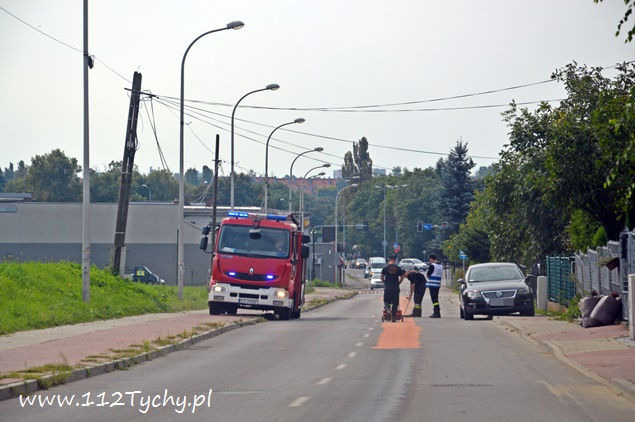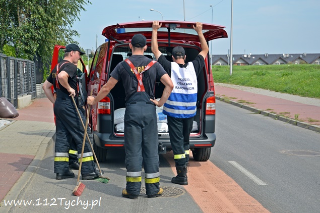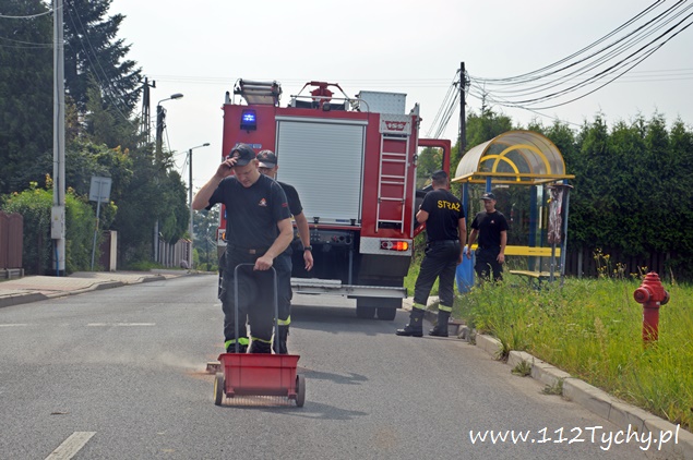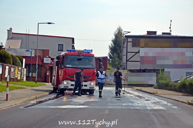 29 sierpnia przed godziną 11 do MSK w Tychach wpłynęło zgłoszenie o rozległej plamie substancji ropopochodnych na ulicy Mąkołowskiej. Na miejsce wysłany został jeden zastęp JRG Tychy (GBA). Po dotarciu na miejsce sytuacja się potwierdziła. Dodatkowo na miejscu był obecny patrol tyskiej Straży Miejskiej. Jak się później okazało plama miała łączną długość około 8km. Plama ciągła się ulicami: Mąkołowską, Dołową, Drozdów, Bocianią, Ziębią. KDR na miejsce wezwał dodatkowy zastęp z JRG Tychy (GBA). W trakcie usuwania plamy na miejsce zadysponowany został zastęp, który dowiózł dodatkowy Sorbent (SLKw). Jak się później okazało sprawcą zamieszania była maszyna sprzątająca jednej z tyskich firm odpowiedzialnych za gospodarkę odpadami. Strażacy dodatkowo poza sorbentem używali Sintanu i na skrzyżowaniach zmywali plamę. Do działań zużyte zostało 280 kg sorbentu. Działania na miejscu trwały blisko cztery godziny.