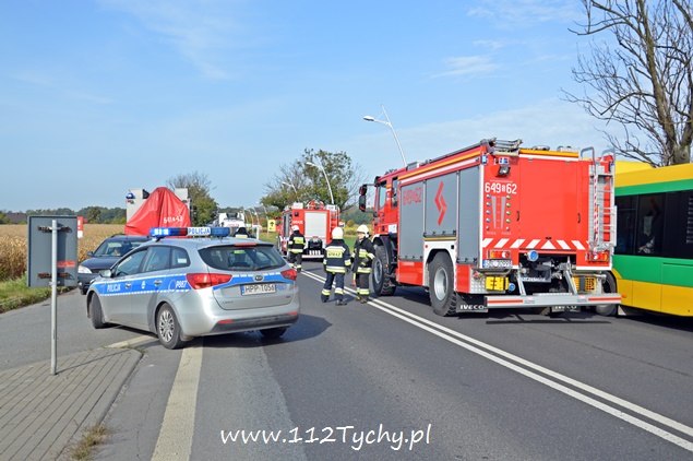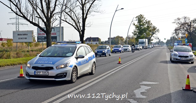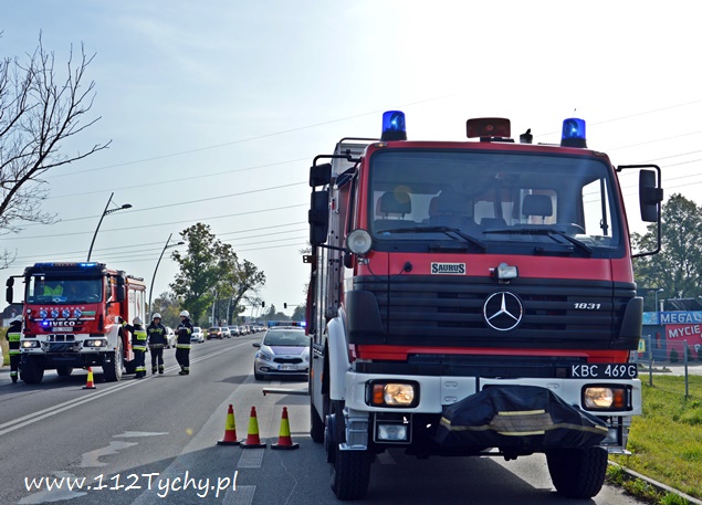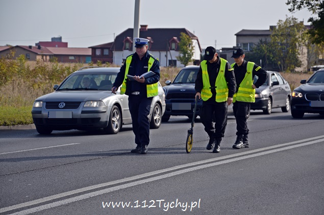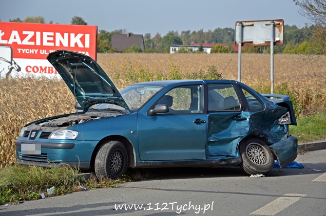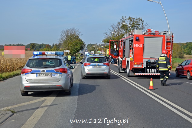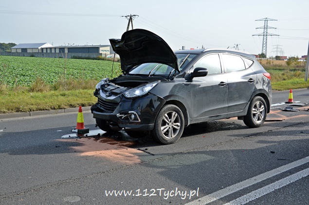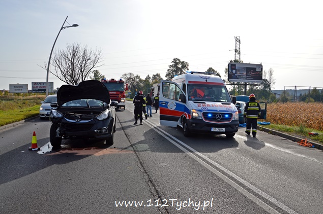 15 października około godziny 10.20 do MSK w Tychach wpłynęło zgłoszenie od dyżurnego pogotowia ratunkowego o zdarzeniu drogowym na ulicy Mikołowskiej na wysokości myjni bezdotykowej. Na miejsce wysłane zostały zastępy JRG Tychy (GCBA, SCRt), OSP Bieruń Stary (GBA), karetki pogotowia i patrole tyskiej Policji. Ruch w kierunku Tychów został całkowicie zablokowany. Po dotarciu na miejsce okazało się, że doszło do zderzenia Hyundaia z Seatem. Z ustaleń pracujących na miejscu policjantów oraz relacji świadków zdarzenia wynika, że kierujący Seatem mężczyzna jadąc w kierunku Mikołowa jadąc prawym pasem na wysokości myjni chciał zawrócić lub zjechać na myjnię, a jadąca lewym pasem kierująca Hyundaiem nie zdążyła wyhamować i uderzyła w lewy tył Seata. Hyundaiem podróżowało jeszcze 8 letnie dziecko (nim mu się nie stało). Obydwoje kierujący zostali zabrani do szpitala na dokładne badania. Po około czterdziestu minutach w miejscu zdarzenia został wprowadzony ruch wahadłowy. Do pomocy w kierowaniu ruchem na miejsce wezwany został patrol Straży Miejskiej. W związku z tym, że zdarzenie zostało zakwalifikowane jako wypadek na miejsce wezwany został policyjny technik. Utrudnienia w ruchu i działania służb zakończone zostały około godziny 12.20. Tyscy Policjanci prowadzą dalsze czynności w tej sprawie.