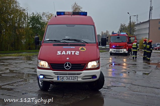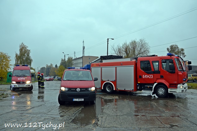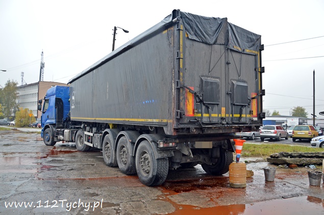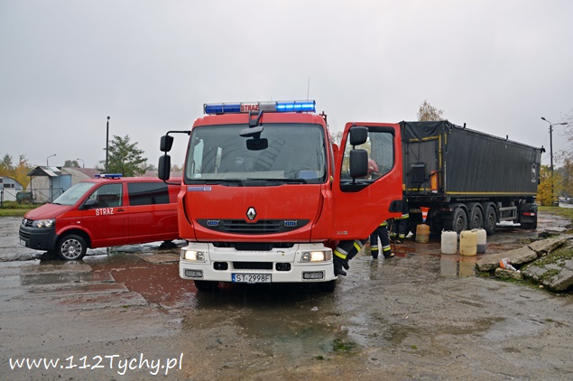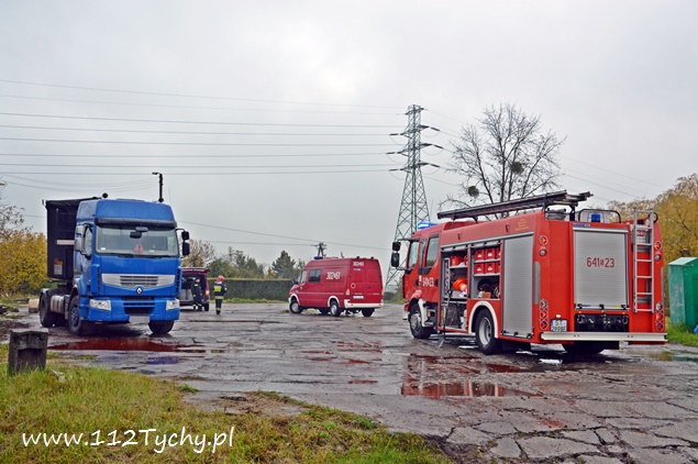 21 października przed godziną 13 do MSK w Tychach wpłynęło zgłoszenie, że z naczepy jednego z zaparkowanych samochodów ciężarowych na ulicy Dojazdowej wycieka jakiś czerwony płyn o intensywnym zapachu. Na miejsce wysłany został jeden zastęp JRG Tychy (GBA) celem sprawdzenia i potwierdzenia zgłoszenie. Po dotarciu na miejsce okazało się, że rzeczywiście coś wycieka z naczepy, a dodatkowo wszystkie kałuże wokół pojazdu są już zabarwione na czerwono. Ze względu na brak kierującego pojazdem na miejscu i braku możliwości dowiedzenia się co to za substancja n miejsce wezwany został zastęp chemików z JRG 2 Katowice Piotrowice (SLRChem) i patrol Policji. Po przybyciu na miejsce chemików i sprawdzeniu przez nich substancji okazało się, że nie zagraża ona środowisku i jest rozpuszczalna w wodzie. W tym samym czasie policjanci ruchu drogowego ustalili właściciela auta i udali się do niego, celem powiadomienia o zdarzeniu. Ze względu na rozległość wycieku na miejsce wezwany został dodatkowy zastęp z JRG Tychy (SLKw) z beczkami na wyciekającą ciecz. Rozlana ciecz wokół pojazdu została zebrana przy użyciu podręcznego sprzętu do wiader, a następnie przelana do beczek. Dodatkowo bezpośrednio pod wyciekiem została ustawiona dodatkowa beczka. Po około półtorej godzinie na miejscu zjawił się szef firmy transportowej, informując, że przewożone są odpady po budowlane. Łącznie działania na miejscu i jego zabezpieczenie trwało blisko cztery godziny.