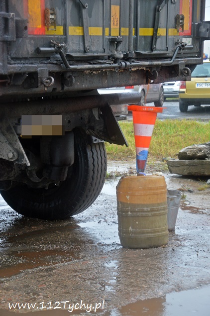 WYCIEK NIEZNANEJ SUBSTANCJI Z ZAPARKOWANEJ CIĘŻARÓWKI NA DOJAZDOWEJ