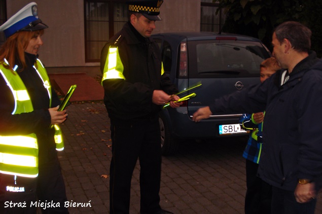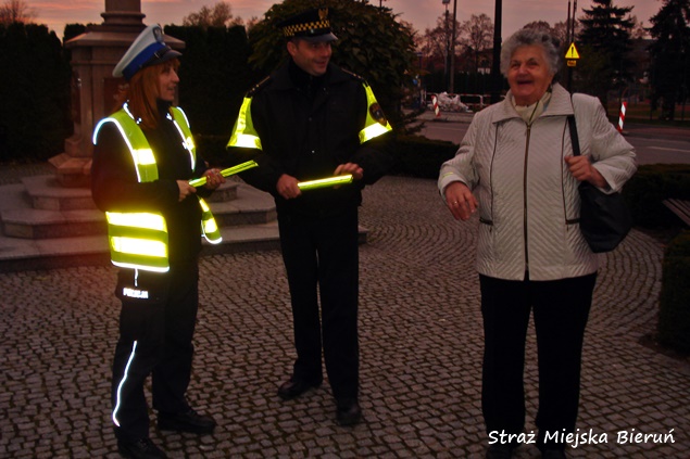 31 października w godzinach popołudniowo – wieczornych na terenie miasta Bieruń, funkcjonariusze bieruńskiej Straży Miejskiej wspierani przez policjantów WRD KPP Bieruń przeprowadzili wspólną akcję „Bądź widoczny na drodze” – skierowaną głownie do pieszych. W trakcie działań profilaktycznych funkcjonariusze rozdawali odblaski w różnych częściach miasta. Szczególnie w pobliżu cmentarzy. Podobne akcje profilaktyczne cieszą się dużym zainteresowaniem społeczeństwa i będą przeprowadzane częściej.