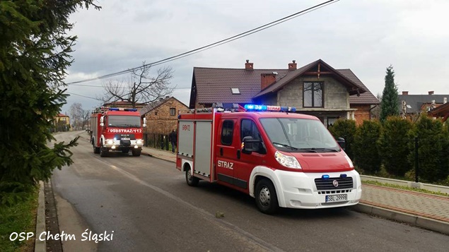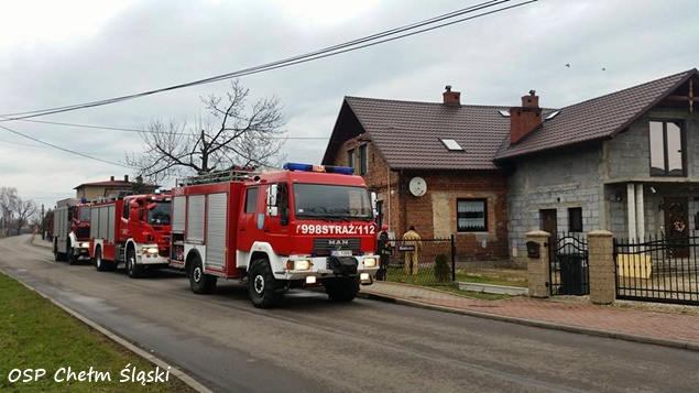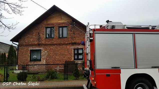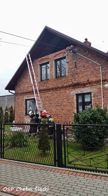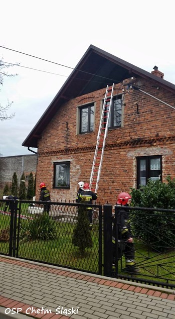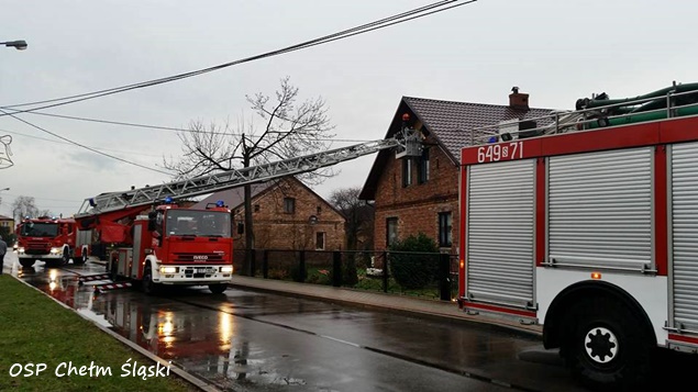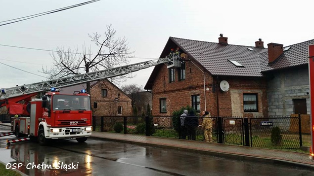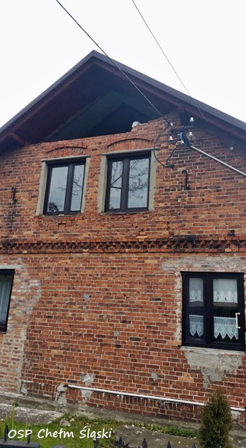 11 grudnia około godziny 12 do MSK w Tychach wpłynęło zgłoszenie, że w jednym z domów jednorodzinnych w Chełmie Śląskim przy ulicy Miodowej w wyniku silnego wiatru doszło do przewrócenie się ściany budynku. Na miejsce natychmiast wysłane zostały zastępy OSP Chełm Śląski (GLBARt, GBA) i JRG Tychy (GCBA, SCRt). Po przybyciu na miejsce okazało się, że przewróciła się ściana na poddaszu. Na szczęście poddasze nie było zamieszkane i nikomu nic się nie stało. Strażacy zabezpieczyli ścianę, rozebrali jej pozostałości i przystąpili do zabezpieczenia otworu płytami OSB. W tym celu na miejsce wezwany został dodatkowy zastęp z JRG Tychy (SD). Działania trwały około dwóch godzin. W tym czasie ruch na ulicy Miodowej był całkowicie wstrzymany.
