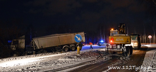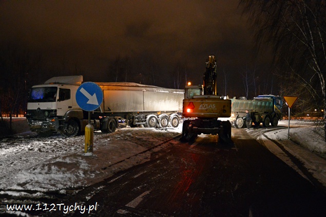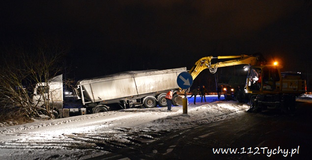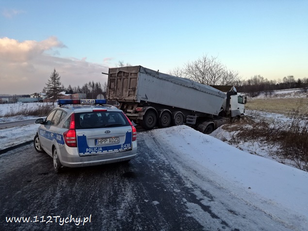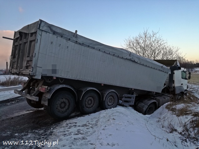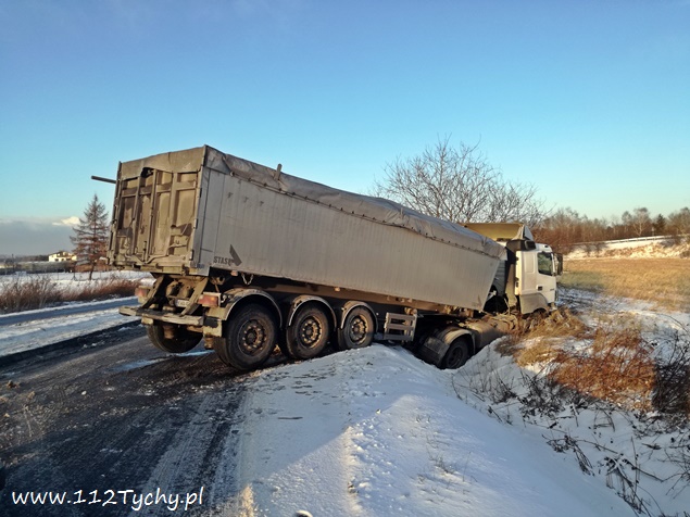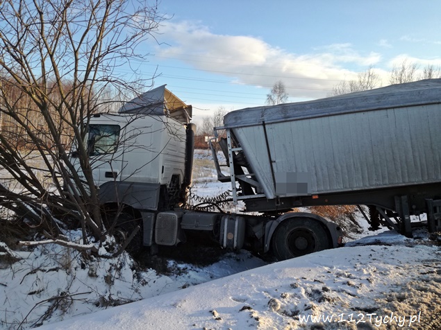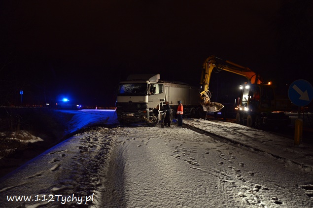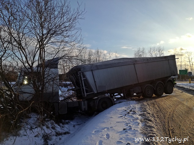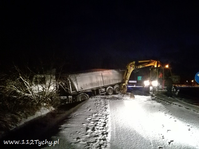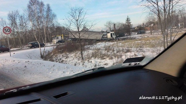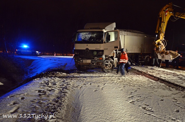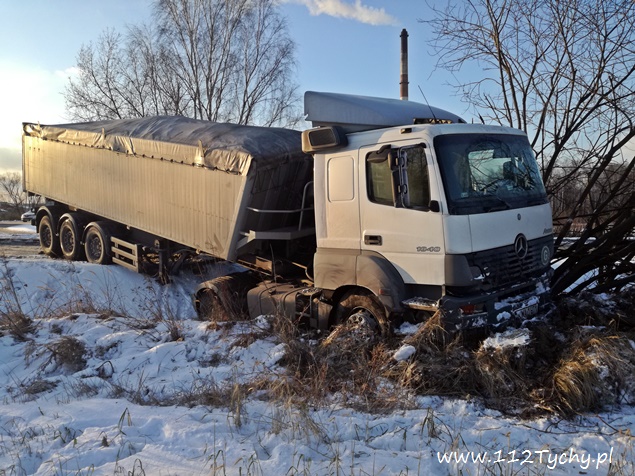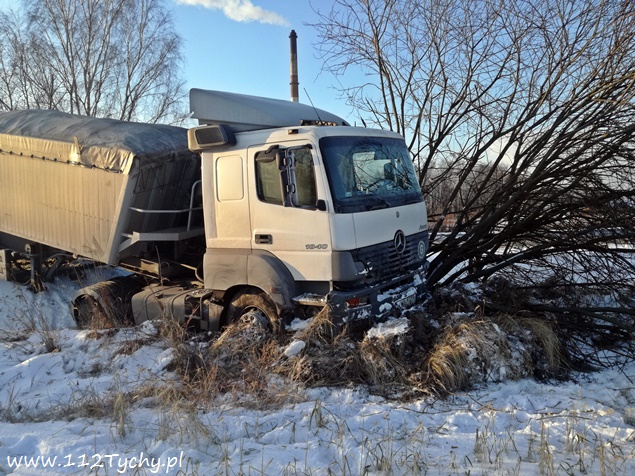 5 stycznia około godziny 13.40 na ulicy Lędzińskiej (wjazd na DK 44 kierunek Oświęcim) w Bieruniu Starym doszło do groźnie wyglądającego zdarzenia drogowego. Kierujący ciągnikiem siodłowym marki Mercedes z naczepą mieszkaniec powiatu wadowickiego wjechał do przydrożnego rowu. Na miejsce wezwany został patrol bieruńskiej Policji. Zjazd został całkowicie zablokowany. Jak ustalili będący na miejscu policjanci prawdopodobną przyczyną zdarzenia była śliska nawierzchnia i niedostosowanie prędkości do panujących warunków na drodze. Dopiero po interwencji Policji w miejscu zdarzenia pojawiły się piaskarki. W promieniu około 100m od feralnego miejsca doszło w międzyczasie do kilku drobniejszych kolizji. Kierowca Mercedesa poinformował policjantów, że zestaw zostanie niedługo wyciągnięty z rowu. Na miejsce przyjechały wezwane przez kierującego pojazdy (koparka i wywrotka), które miały wyciągnąć zestaw z rowu. Przy użyciu stalowych lin pojazd udało się wyciągnąć z rowu. Na czas wyciągania pojazdu z rowu ruch został całkowicie wstrzymany. Utrudnienia w ruchu trwały blisko cztery godziny. Kierowca został ukarany mandatem karnym. Uszkodzony pojazd z naczepą został odtransportowany na pobliski parking.