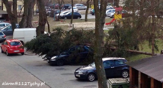 – ok. 6.28 – Tychy, ul. Legionów Polskich – powalone drzewo na samochód;