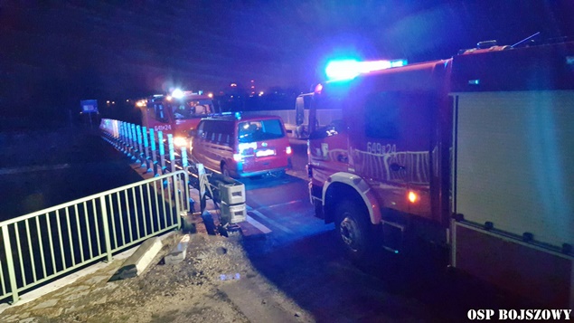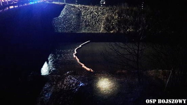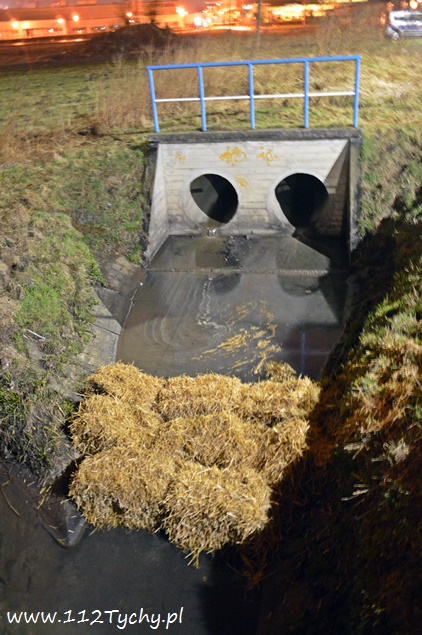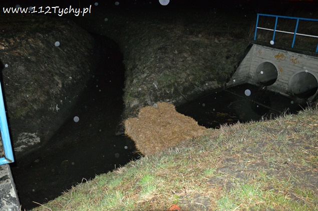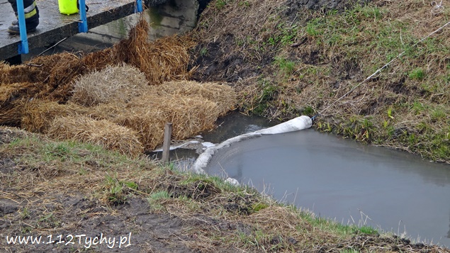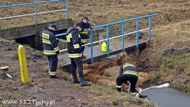 19 marca o godzinie 16.43 do MSK w Tychach wpłynęło zgłoszenie o plamie nieznanej substancji w cieku wodnym (kanalizacji deszczowej) przy ulicy Cielmickiej /Jedności wpływającej do rzeki Gostyni. Na miejsce wysłany został jeden zastęp JRG Tychy (GCBA) celem sprawdzenia zgłoszenia. Po dotarciu na miejsce zgłoszenie potwierdziło się. KDR podjął decyzję o konieczności postawienia zapory filtrująco sorpcyjnej. W tym celu na miejsce zadysponowany został dodatkowy zastęp z KM PSP Tychy (SLKw), który dostarczył na miejsce kostki słomy. Strażacy zbudowali zaporę, a następnie sprawdzali pobliskie studzienki kanalizacyjne. Dodatkowo do działań wezwane zostały patrole tyskiej Straży Miejskiej. Strażacy ze strażnikami miejskimi sprawdzali również pobliskie firmy. Bez skutku. Dodatkowo okazało się, że zanieczyszczenie dotarło już do Jedliny gdzie postawiona została kolejna zapora. Tam w działaniach brały udział zastępy OSP Bojszowy (GBA, GBA), JRG Tychy (GBAPr) i JRG Pszczyna (SLKw) – dowiózł zapory. W godzinach wieczornych dowodzenie akcją przejął p.o. KM PSP Tychy st. bryg. Piotr Szojda (SLRr). O zdarzeniu poinformowani zostali przedstawiciele UM Tychy, RCGWŚ Tychy oraz WIOŚ. Pobrane zostały próbki do badań. Działania zostały zakończone po godzinie 4. W dniu dzisiejszym od godziny 8 działania trwają nadal. Trwa ustalanie firmy oraz przyczyn wycieku.