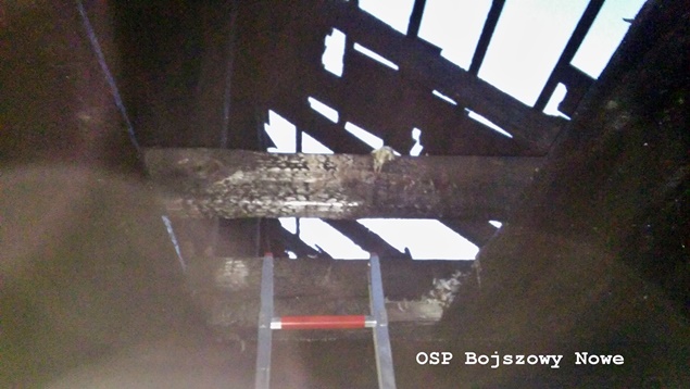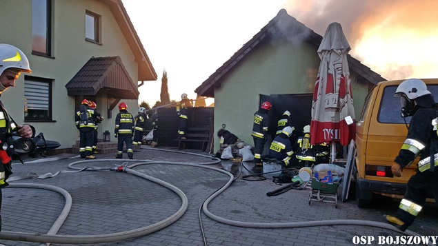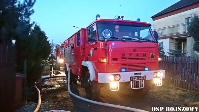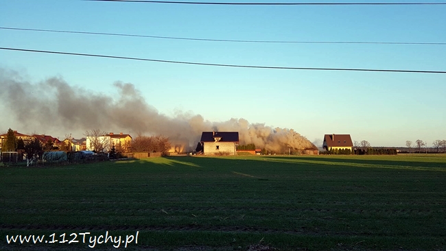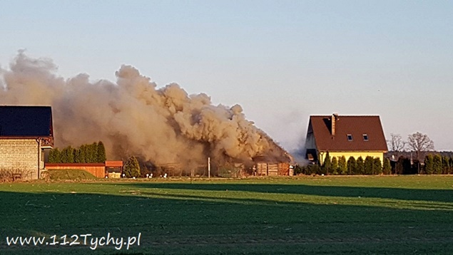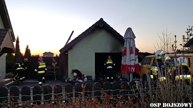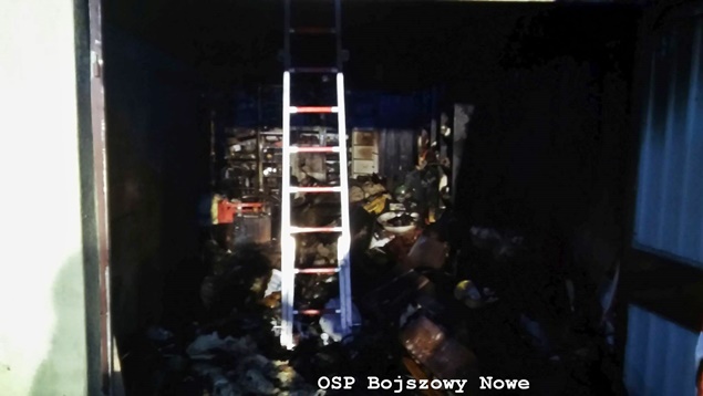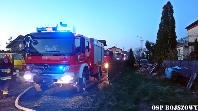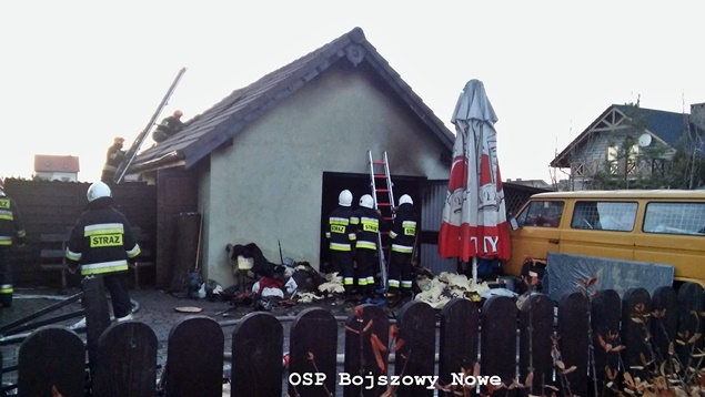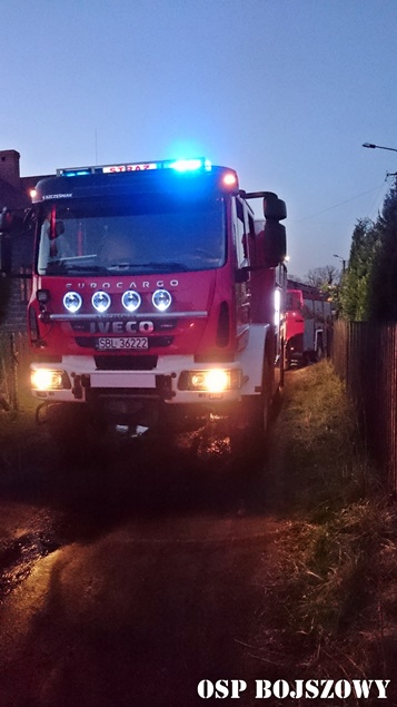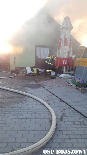 1 kwietnia około godziny 18.35 do MSK w Tychach wpłynęło zgłoszenie o pożarze budynku gospodarczego w Bojszowach przy ulicy Nowej. Na miejsce natychmiast wysłane zostały zastępy OSP Bojszowy (GBA, GBA), OSP Bojszowy Nowe (GBA, GBA), OSP Bieruń Nowy (GCBA), OSP Międzyrzecze (GLM) i JRG Tychy (GBA,GCBARt), patrol bieruńskiej Policji i ZRM. Po dotarciu na miejsce strażacy zastali rozwinięty pożar budynku. Ze względu na bardzo duże zadymienie strażacy pracowali w AOUO. Podane zostały prądy wody na palący się budynek. Dodatkowo zbudowane został zasilanie wodne z pobliskiego hydrantu. Niestety składowane w budynku materiały uległy całkowitemu spaleniu. Nadpaleniu uległa również konstrukcja dachu budynku. Na miejsce przyjechał również OOM (SLRr). Po ugaszeniu ognia budynek został przewietrzony. Działania gaśnicze zakończyły się około godziny 20.