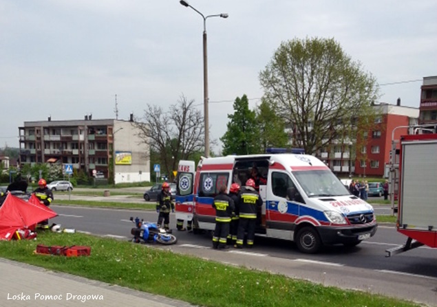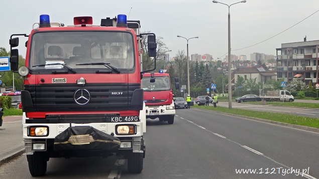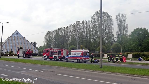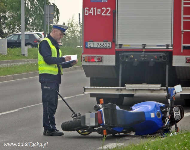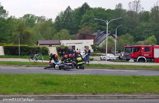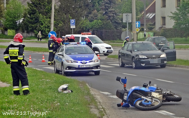 15 maja o godzinie 11 na ulicy Sikorskiego w rejonie skrzyżowania z ulicą Zgrzebnioka doszło do zdarzenia drogowego z udziałem samochodu osobowego i jednośladu. Na miejsce natychmiast wezwane zostały służby ratunkowe. Na pomoc poszkodowanym w zdarzeniu wyruszyły trzy zastępy JRG Tychy (GBA, GCBARt, SCRt), patrole Policji i ZRM. Po dotarciu na miejsce podjęta została decyzja o konieczności zamkniecie odcinka ulicy Sikorskiego ( w kierunku DK 1) na czas trwania działań ratowniczych. Przybyli na miejsce strażacy udzielili poszkodowanemu motocykliście kwalifikowanej pomocy przedmedycznej, a następnie przekazali go pod opiekę ratowników medycznych. Poszkodowany motocyklista (mężczyzna w wieku ok. 50 lat) został przewieziony do szpitala na dalsze badania. Jak wstępnie ustalili pracujący na miejscu policjanci winnym zdarzenia jest kierujący Fordem, który włączając się do ruchu z ulicy Zgrzebnioka w Sikorskiego nie ustąpił pierwszeństwa przejazdu mężczyźnie poruszającemu się prawym pasem ulicy Sikorskiego motocyklem marki Suzuki, doprowadzając do zderzenia. Po około dwóch godzinach ruch na ulicy Sikorskiego został przywrócony, a uszkodzone pojazdy odholowane. Policjanci WRD KMP Tychy prowadzą dalsze czynności w sprawie tego zdarzenia.