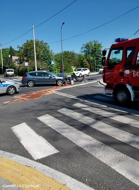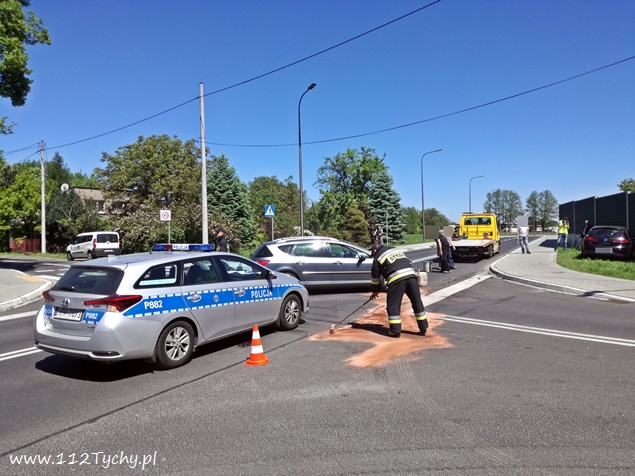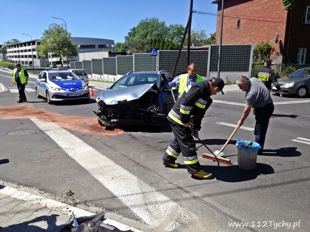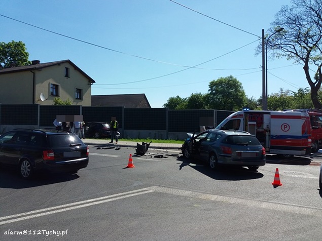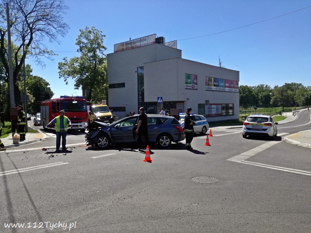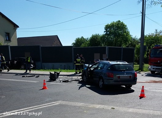 28 maja około godziny 9.45 do MSK w Tychach wpłynęło zgłoszenie o zdarzeniu drogowym na skrzyżowaniu ulic Damrota z Asnyka. Na miejsce natychmiast wysłane zostały dwa zastępy JRG Tychy (GBA, SCRt), ZRM i patrole Policji. Po dotarciu na miejsce okazało się, że doszło do czołowo bocznego zderzenia się Peugeota 407 z Seatem Leon. Dwie osoby podróżujące Seat – em zostały zabrane do szpitala na dokładniejsze badania. Jak ustalili pracujący na miejscu policjanci kierujący Peugeotem nie ustąpił pierwszeństwa przejazdu kierującemu Seatem. Peugeot jechał ulicą Damrota w kierunku Burschego, a Seat ulicą Asnyka w kierunku ul. Mikołowskiej. Po uderzeniu w lewy bok Seat wjechał na pas zieleni i uderzył w ekrany akustyczne. Ze względu na rodzaj zdarzenia oraz urazy osób poszkodowanych na miejsce wezwany został policyjny technik. Na czas trwania działań ratowniczych ruch na skrzyżowaniu został całkowicie zablokowany, a następnie wprowadzony został ruch wahadłowy. Po wykonaniu pełnej dokumentacji rozbite pojazdy zostały odholowane, a strażacy zneutralizowali rozlane płyny eksploatacyjne. Utrudnienia trwały blisko dwie godziny. Policjanci KMP Tychy prowadzą dalsze czynności w sprawie tego zdarzenia.