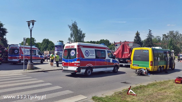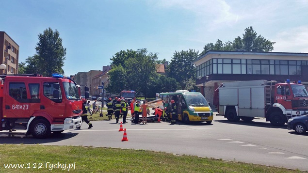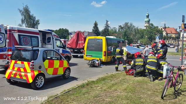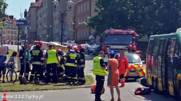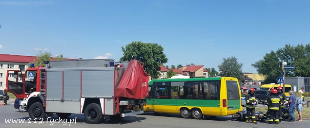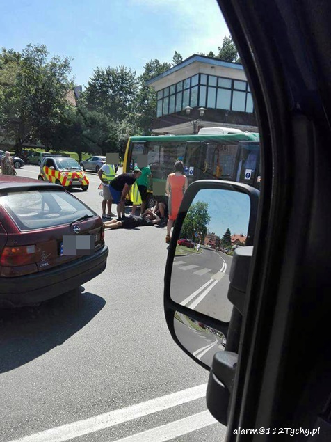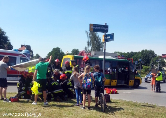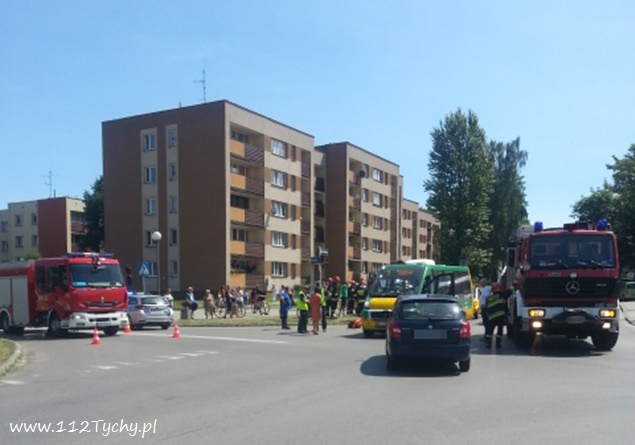 20 czerwca około godziny 14 na skrzyżowaniu ulic Bocheńskiego – Boczna – Hlonda doszło do groźnego zdarzenia drogowego. W tył busa komunikacji miejskiej uderzył skuter, którym jechało dwóch nastolatków w wieku 16 i 17 lat. Na pomoc poszkodowanym ruszyli świadkowie zdarzenia, a wśród nich będący poza służbą, strażak JRG Tychy st. str. Grzegorz Patalong. Zabezpieczył on miejsce zdarzenia, a następnie wraz ze świadkami udzielił KPP poszkodowanym do czasu przybycia służb ratunkowych. Na miejsce dojechały zastępy JRG Tychy (GBA, GBAPr, GCBARt, SCRt), dwa ZRM i patrole Policji. Kierowca i pasażer skutera zostali zabrani do szpitala w Katowicach Ligocie na dokładniejsze badania. Kierowcy i pasażerom busa nic się nie stało. Jak wstępnie ustalili pracujący na miejscu policjanci, kierowca busa komunikacji miejskiej zatrzymał się, aby nie zderzyć się z jadącą z naprzeciwka Skodą, która skręcała w lewo z Bocheńskiego w Boczną (wymuszając najprawdopodobniej pierwszeństwo na busie), a kierujący skuterem nie zachował bezpiecznej odległości od poprzedzającego pojazdu i uderzył w jego tył. Przez blisko godzinę ruch na skrzyżowaniu był całkowicie wstrzymany. Po wykonaniu dokumentacji przez Policję i uprzątnięciu drogi ruch został przywrócony. Tyscy Policjanci prowadzą dalsze czynności w sprawie tego zdarzenia.