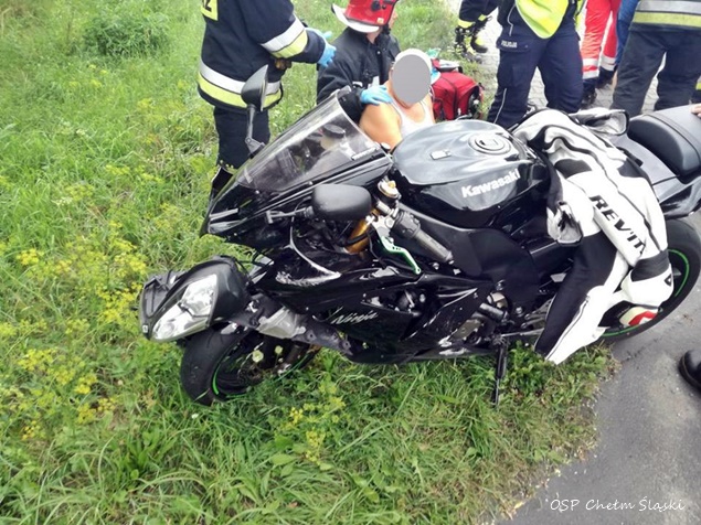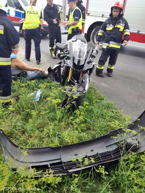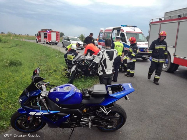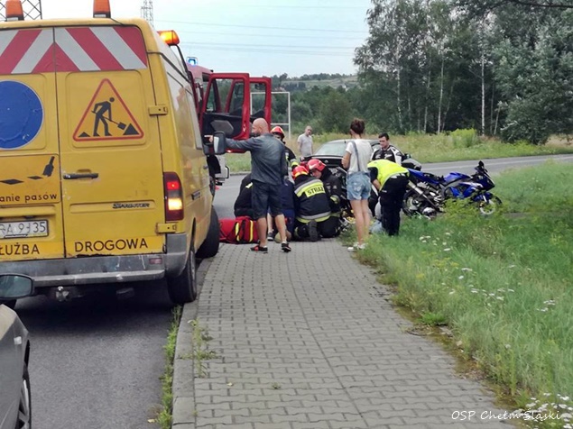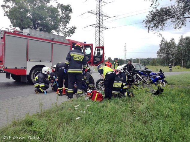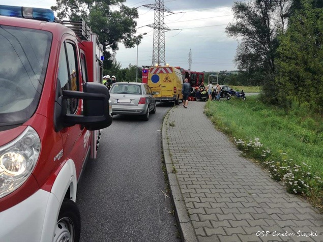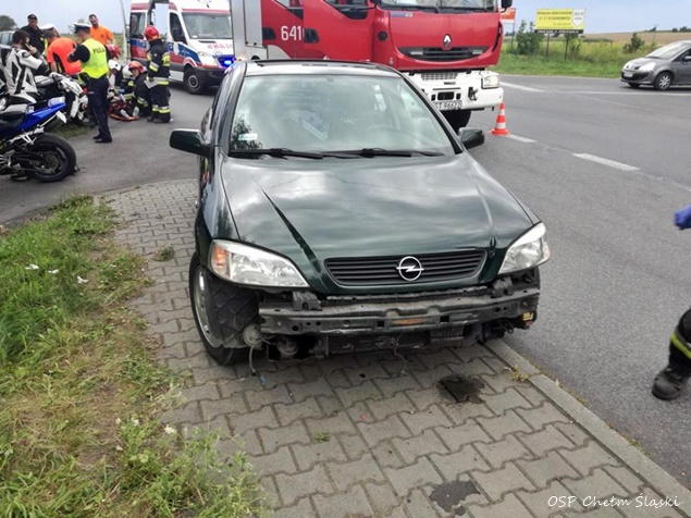 3 sierpnia około godziny 17.45 do MSK w Tychach wpłynęło zgłoszenie o zdarzeniu drogowym z udziałem motocykla i samochodu osobowego w Chełmie Małym na skrzyżowaniu ulic Górnośląskiej – Dożynkowej – Olimpijskiej. Na miejsce zadysponowane zostały zastępy OSP Chełm Śląski (GLBARt) i JRG Tychy (GBA, SCRt) oraz dwa ZRM i patrol Policji. Po dotarciu na miejsce zgłoszenie potwierdziło się. Działania strażaków polegały na zabezpieczeniu miejsca zdarzenia oraz udzieleniu KPP poszkodowanym w zdarzeniu kierowcom, a następnie kierowaniu ruchem na skrzyżowaniu. Jak ustalili pracujący na miejscu Policjanci winnym zdarzenia jest kierowca samochodu osobowego Opel Astra, który wymusił pierwszeństwo przejazdu na kierującym motocyklem Yamaha. Kierowcy po opatrzeniu na miejscu zostali zabrani do szpitali na dokładniejsze badania. Po około godzinie działania zostały zakończone. Bieruńscy Policjanci prowadzą dalsze czynności w sprawie tego zdarzenia.