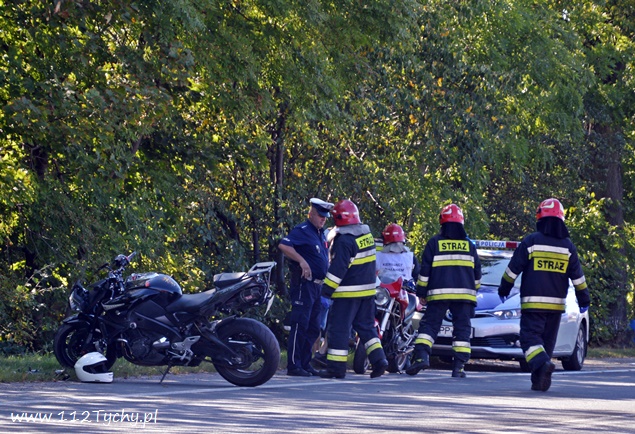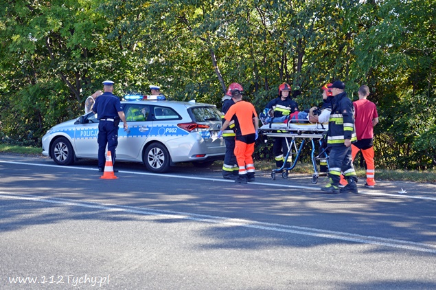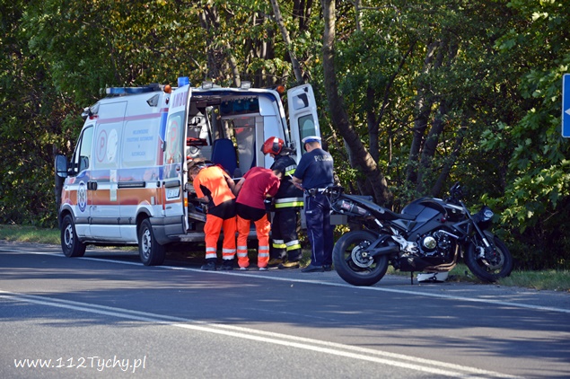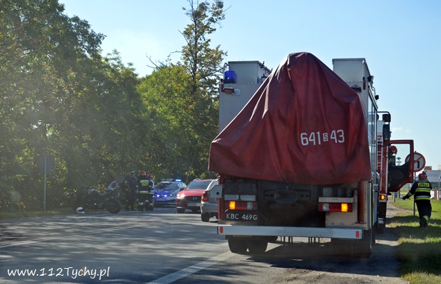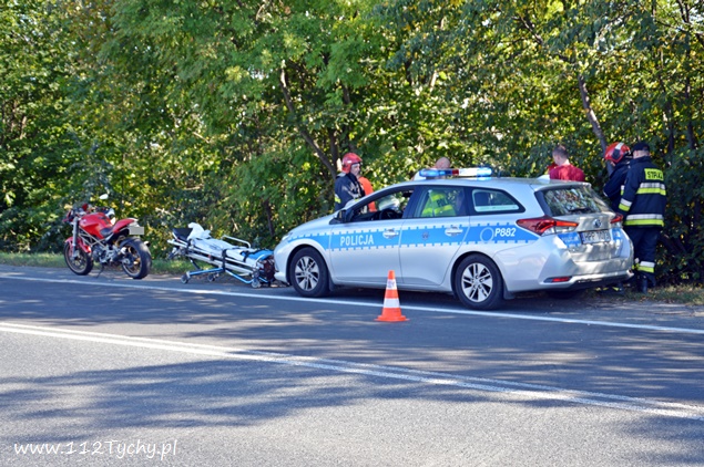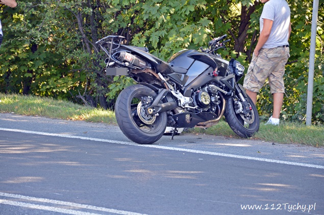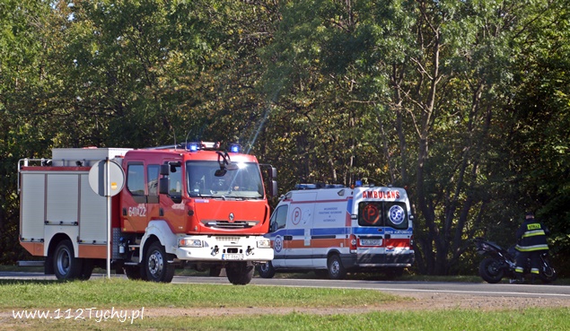 5 sierpnia około godziny 16.10 do dyżurnego tyskiej Policji wpłynęło zgłoszenie o zdarzeniu drogowym z udziałem motocykla na ul. Oświęcimskiej (DK 44) w rejonie skrzyżowania z ulicą Jaworową i Czarną. Na miejsce wysłany został jeden z podległych patrol WRD oraz trzy zastępy JRG Tychy (GBA, GCBARt, SCRt) oraz ZRM. Po dotarciu na miejsce zgłoszenie potwierdziło się. Jak wstępnie ustalili pracujący na miejscu Policjanci z niewyjaśnionych przyczyn mężczyzna utracił panowanie nad swoim jednośladem (Suzuki) i wywrócił się. Kierujący motocyklem z licznymi otarciami został przetransportowany do szpitala na dokładniejsze badania. W miejscu zdarzenia ruch odbywał się z niewielkimi utrudnieniami. Tyscy Policjanci prowadzą dalsze czynności w sprawie tego zdarzenia.