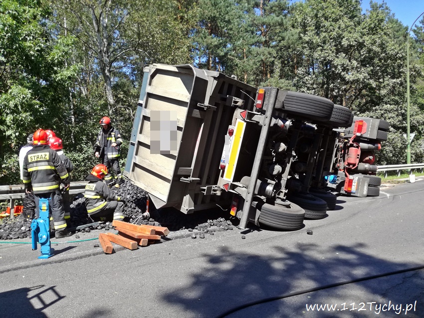 8 sierpnia około godziny 11.55 na zjeździe od strony Katowic Kostuchny na trasę DK 86 doszło do tragicznego w skutkach wypadku drogowego. O zdarzeniu poinformowani zostali dyżurni tyskiej Straży Pożarnej i Policji. Ze zgłoszenia wynikało, że na zakręcie doszło do wywrócenia się ciągnika siodłowego marki Scania z naczepą typu wanna, w której przewożone było około 30ton węgla – przewrócona naczepa miała przygnieść przejeżdżający w kierunku przeciwnym samochód osobowy Nissan Xtrail. Na miejsce zadysponowane zostały trzy zastępy JRG Tychy (GBA, GCBARt, SCRt), patrol Policji i ZRM. Po dotarciu na miejsce zgłoszenie potwierdziło się. Strażacy natychmiast zabezpieczyli miejsce zdarzenia i przystąpili do wydobycia z przysypanego i przygniecionego pojazdu osób poszkodowanych oraz wydobycia kierowcy samochodu ciężarowego. KDR na miejsce wezwał dodatkowe zastępy z OSP Lędziny (GLBARt) oraz zastępy wchodzące w skład Specjalistycznej Grupy Ratownictwa Technicznego z Dąbrowy Górniczej i Gliwic (SCRt, SCRd, SCDŹ). Strażacy z rozbitych pojazdów ewakuowali trzy osoby: mężczyzna – 62 lata – kierowca Scanii, oraz dwie osoby z osobówki: 85 letnia kobietę i 68 letniego mężczyznę – pasażerowie osobówki zostali zabrani do szpitala na badania. Kierowca samochodu ciężarowego nie odniósł obrażeń i pozostał na miejscu. Z relacji pasażerów wynikało, że w samochodzie jest jeszcze przysypana pasażerka. Z pobliskiej firmy do pomocy została ściągnięta koparko ładowarka. Po prawie dwóch godzinach ciężkiej pracy udało się dostać do zgniecionego samochodu osobowego – niestety będący na miejscu lekarz stwierdził zgon 57 letniej kierującej. Na miejsce wezwani zostali policyjni technicy, grupa dochodzeniowo – śledcza oraz prokurator. Ruch w miejscu zdarzenia został całkowicie wstrzymany na ponad cztery godziny. Jak wstępnie ustalili pracujący na miejscu Policjanci winnym zdarzenia jest kierujący samochodem ciężarowym, który najprawdopodobniej nie dostosował prędkości i doprowadził do wywrócenia swojego pojazdu na zakręcie. Na miejscu pracowali również funkcjonariusze ITD. Tyscy Policjanci pod nadzorem tyskiej prokuratury prowadzą śledztwo mające na celu wyjaśnienie tego tragicznego w skutkach zdarzenia. Przed godziną 17 droga została odblokowana.
