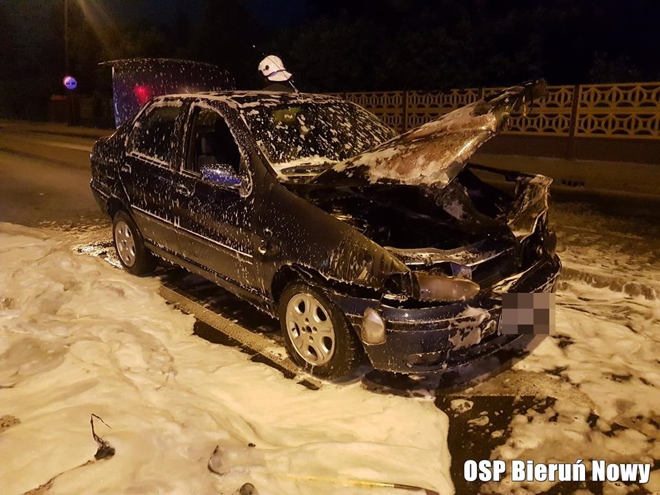 9 sierpnia około godziny 21 do SK KM PSP Tychy wpłynęło zgłoszenie o pożarze samochodu osobowego Fiat na ulicy Warszawskiej (DK 44) na lewoskręcie w ulicę Wawelską. Na miejsce natychmiast wysłane zostały zastępy OSP Bieruń Nowy (GBARt), OSP Czarnuchowice (GBA), JRG Tychy (GBA) oraz patrol bieruńskiej Policji. Po dotarciu na miejsce zgłoszenie potwierdziło się. Ruch na skrzyżowaniu został całkowicie wstrzymany, a następnie wyznaczony został objazd ulicą Węglową. Celem ugaszenia pożaru podany został prąd piany gaśniczej. Po kilkunastu minutach pojazd został ugaszony. Spaleniu uległa komora silnika. Po ugaszeniu pojazdu strażacy usunęli spalony pojazd na pobliski parking, a następnie płyny oraz spalone plastiki zostały zmyte z pasa drogowego. Po około godzinie działania zostały zakończone i ruch został przywrócony. Trwa ustalanie przyczyn i okoliczności pożaru.
