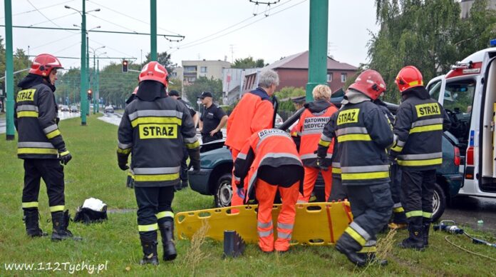 20 sierpnia przed godziną 14 do dyżurnego SKKM PSP Tychy wpłynęło zgłoszenie o wypadku drogowym na ulicy Sikorskiego w rejonie skrzyżowania z ul. Paprocańską. Ze zgłoszenia wynikało, że samochód osobowy uderzył bokiem w słup trakcji trolejbusowej. Na miejsce wypadku wysłane zostały trzy zastępy JRG Tychy (GBA, GCBARt, SLRt) oraz ZRM i patrole Policji. Po dotarciu na miejsce zgłoszenie potwierdziło się. Samochód osobowy Skoda Felicia dosłownie owinął się stroną pasażera wokół słupa. We wraku zakleszczona była kierująca samochodem. Strażacy natychmiast zabezpieczyli miejsce wypadku i przystąpili do wydobycia kierującej z wraku. Przy użyciu narzędzi hydraulicznych po kilkunastu minutach poszkodowana została przekazana ratownikom medycznym i lekarzowi. Jeszcze w trakcie wydobywania kobiety z wraku będący na miejscu lekarza podjął decyzje o konieczności zadysponowania na miejsce latającej karetki. Celem zabezpieczenia lądowiska dla Ratownika 4 na miejsce zadysponowany został dodatkowy zastęp JRG Tychy (GBA). Poszkodowana kobieta w wieku około 23 lat nieprzytomna i wieloma urazami, m.in. głowy została przetransportowana do szpitala w Sosnowcu. Na czas trwania działań ratowniczych ruch na ulicy Sikorskiego w kierunku centrum miasta był całkowicie wstrzymany, a po odlocie śmigłowca puszczony został ulicą Paprocańską. Celem wykonania pełnej dokumentacji na miejsce wezwany został policyjny technik. Ze wstępnych ustaleń pracujących na miejscu Policjantów wynika, że prawdopodobną przyczyną wypadku było niedostosowanie prędkości do panujących warunków drogowych. Utrudnienia w ruchu w miejscu zdarzenia trwały ponad dwie godziny. Tyscy Policjanci prowadzą dalsze czynności mające na celu dokładne wyjaśnienie przyczyn i okoliczności tego zdarzenia.