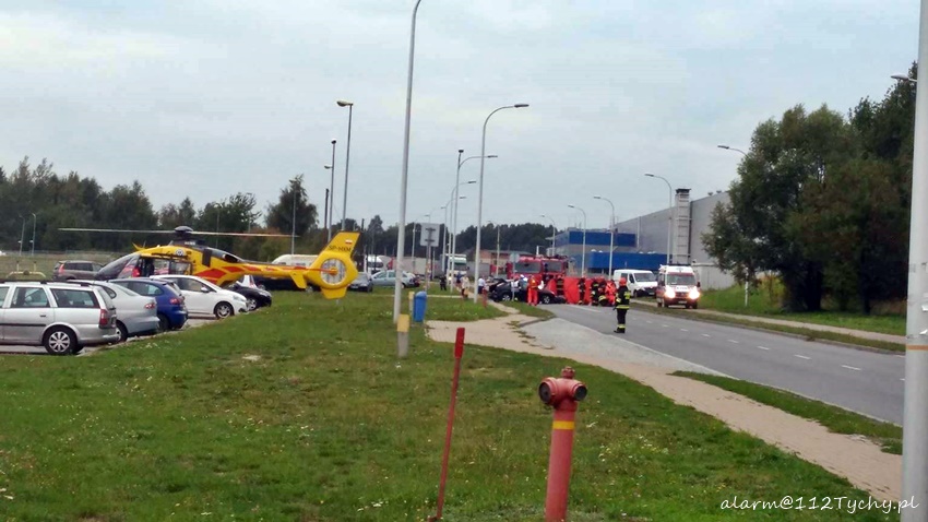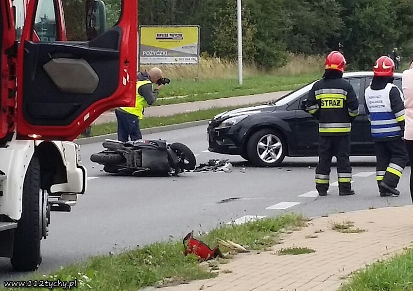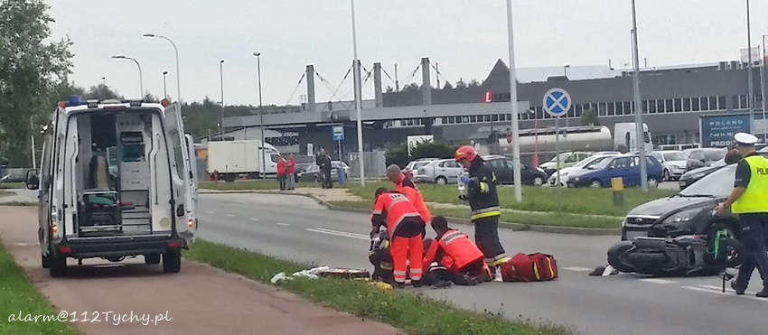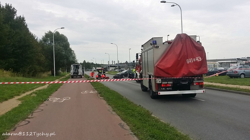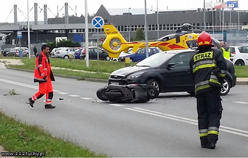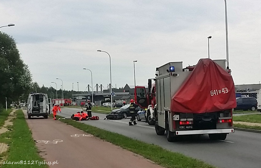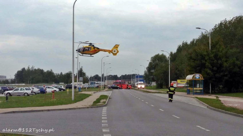 6 września około godziny 16.20 na ulicy Serdecznej na wysokości wyjazdu z parkingu jednego z zakładów produkcyjnych doszło do wypadku. W zdarzeniu brały udział samochód osobowy Ford Focus i skuter. Na miejsce zadysponowane zostały trzy zastępy JRG Tychy (GBA, GCBARt, SCRt), ZRM i patrol Policji. Po dotarciu na miejsce okazało się, że kierująca Fordem – 25 letnia kobieta w trakcie włączania się do ruchu nie ustąpiła pierwszeństwa przejazdu kierującemu skuterem 37 letniemu mężczyźnie doprowadzając do zderzenia. Działania strażaków na miejscu zdarzenia polegały na jego zabezpieczeniu oraz pomocy w udzielaniu pomocy poszkodowanemu mężczyźnie. Ze względu na obrażenia mężczyzny (obrażenia wewnętrzne) będący na miejscu lekarz podjął decyzję o konieczności transportu poszkodowanego do szpitala specjalistycznego w Sosnowcu. W tym celu na miejsce zadysponowany został śmigłowiec ratunkowy LPR – Ratownik 4 z bazy w Gliwicach. Celem zabezpieczenia lądowiska na miejsce wezwany został dodatkowy zastęp JRG Tychy (SLRt). Na czas działań ratunkowych ruch na ulicy Serdecznej został wstrzymany – zostały wyznaczone objazdy. Dodatkowo na miejsce wezwany został policyjny technik. Po prawie dwóch godzinach działań uszkodzone pojazdy zostały usunięte z drogi i ruch został przywrócony. Tyscy Policjanci prowadzą dalsze czynności w sprawie tego zdarzenia.