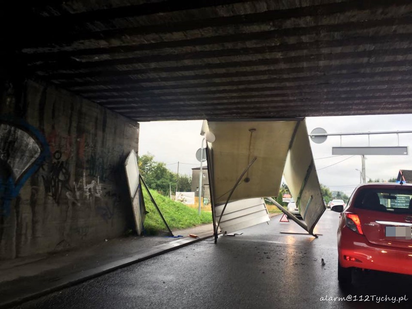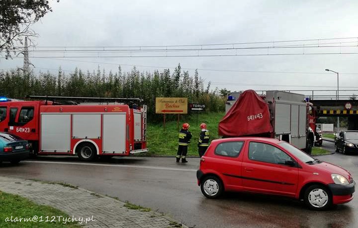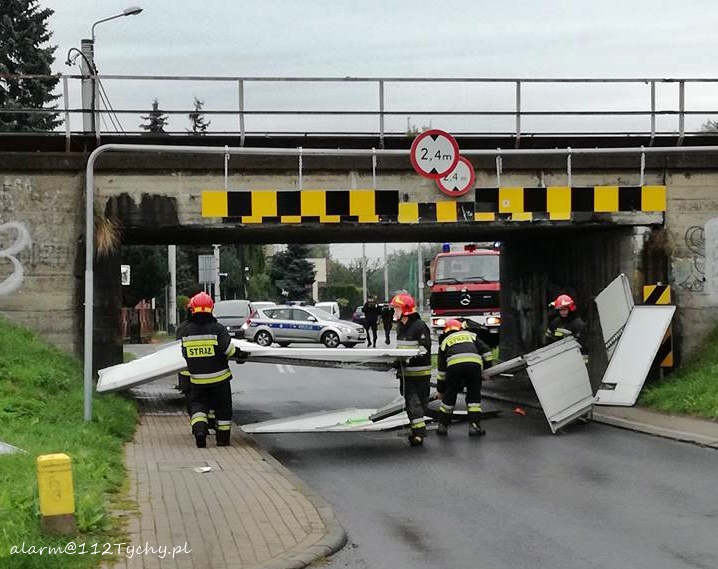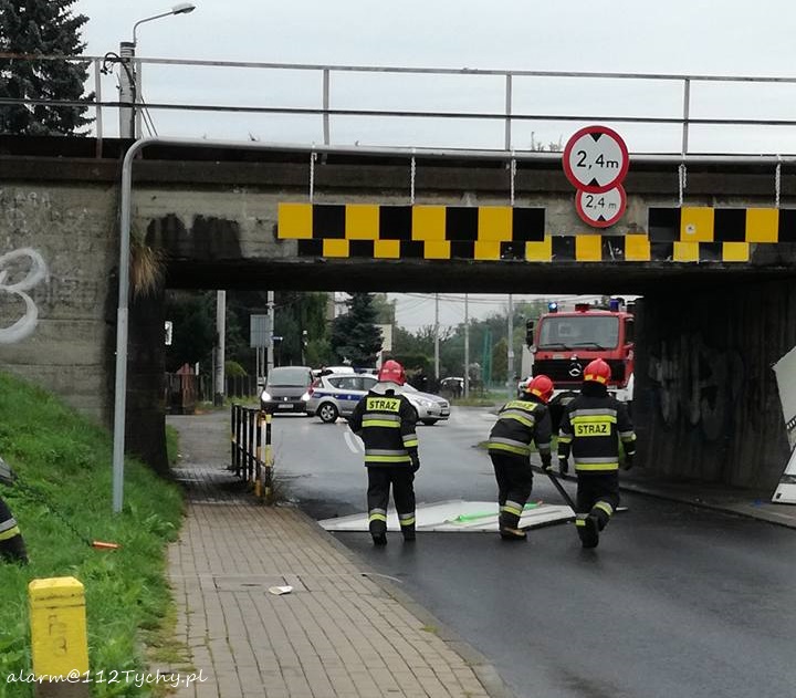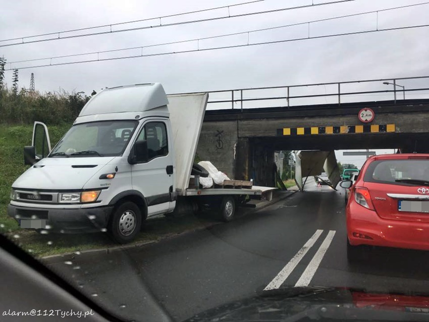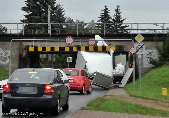 16 września około godziny 11.20 na ul. Glinczańskiej doszło do zdarzenia drogowego. Kierujący samochodem dostawczym Iveco jadąc ulica Glinczańską w kierunku ul. Budowlanych nie zastosował się do znaku B – 16 (ograniczenie wysokości pojazdu do 2,4m) uderzył w wiadukt niszcząc doszczętnie swój samochód. Na miejsce wezwany został patrol Policji oraz dwa zastępy strażaków z JRG Tychy (GBA, SCRt). Ruch w miejscu zdarzenia na czas usuwania uszkodzonego pojazdu został całkowicie wstrzymany. Jak się okazało kierujący samochodem słyszał, ze uderzył w bramownicę i zaczął hamować jednak na zatrzymanie pojazdu przed mostem było za późno. Zabudowa została dosłownie wyrwana z podwozia, a i uszkodzeniu uległa rama pojazdu. Przybyli na miejsce strażacy usunęli elementy zabudowy oraz uszkodzony pojazd na pobliski parking. Policjanci w odpowiedni sposób „rozliczyli” nieuważnego kierowcę. Po około trzydziestu minutach działania zostały zakończone.