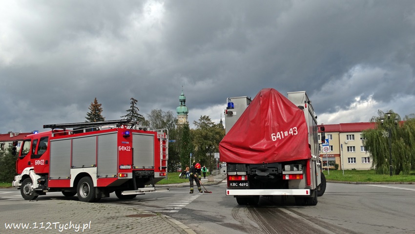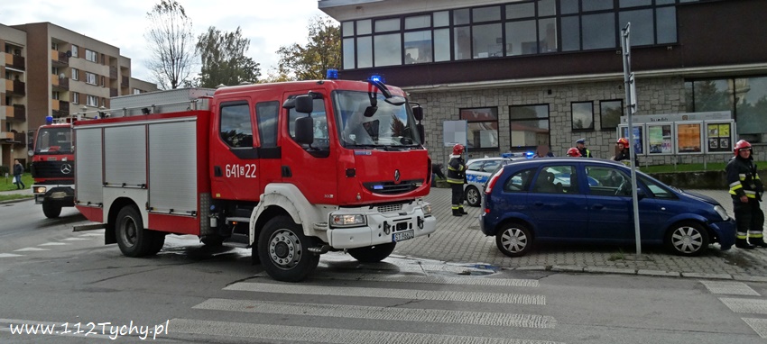 7 października około godziny 12.25 na skrzyżowaniu ulic Bocheńskiego – Hlonda – Boczna doszło do zdarzenia drogowego z udziałem dwóch samochodów osobowych. Na miejsce zdarzenia zadysponowane zostały zastępy JRG Tychy (GBA, SCRt) oraz patrol Policji. Jeszcze przed przyjazdem służb ratunkowych na miejsce uszkodzone pojazdy zostały usunięte na pobliski chodnik. W zdarzeniu brały udział samochody Opel i Volvo. Jak ustalili pracujący na miejscu Policjanci kierujący samochodem Volvo mieszkaniec powiatu gryfickiego jadąc ulica Boczną nie ustąpił pierwszeństwa jadącej ulicą Bocheńskiego kierującej Oplem mieszkańce Tychów. Na szczęście kierującym jak i pasażerom samochodów nic się nie stało – skończyło się na uszkodzonych pojazdach. Strażacy na miejscu zdarzenia pozamiatali elementy rozbitych pojazdach i po kilkunastu minutach wrócili do koszar. Kierujący Volvo został uznany winnym spowodowania kolizji i ukarany został mandatem. Uszkodzone pojazdy z miejsca zdarzenia zostały odholowane przez wezwane holowniki pomocy drogowej.