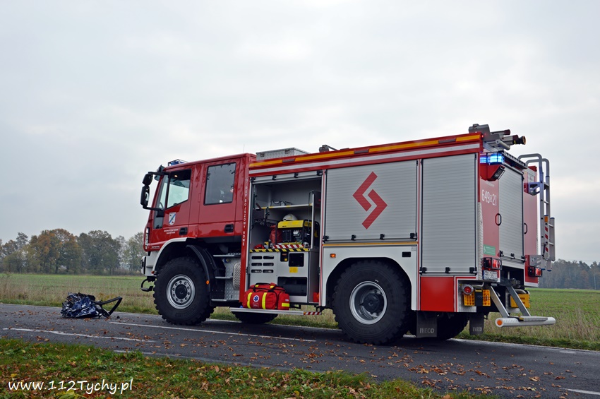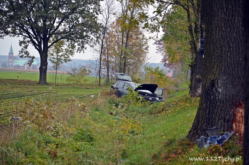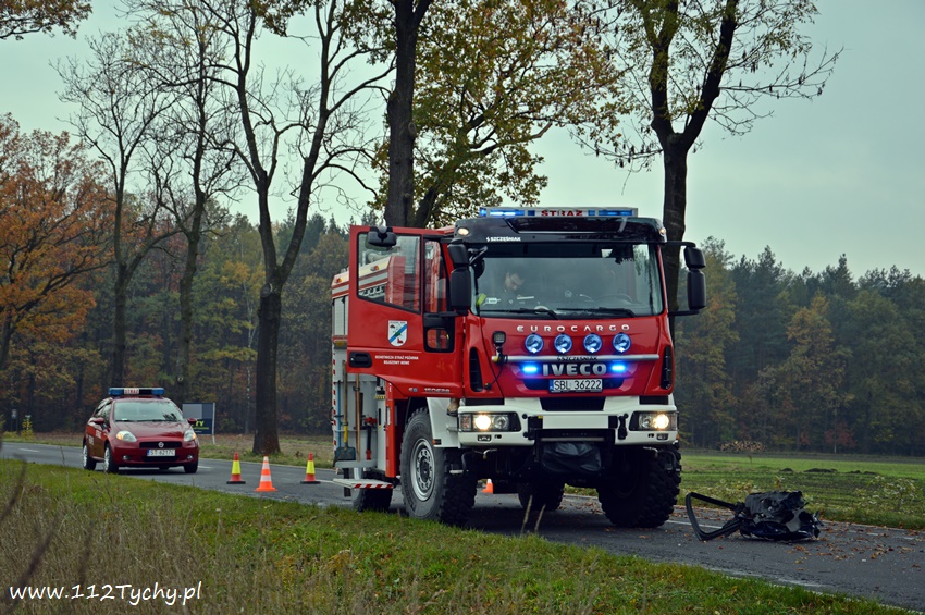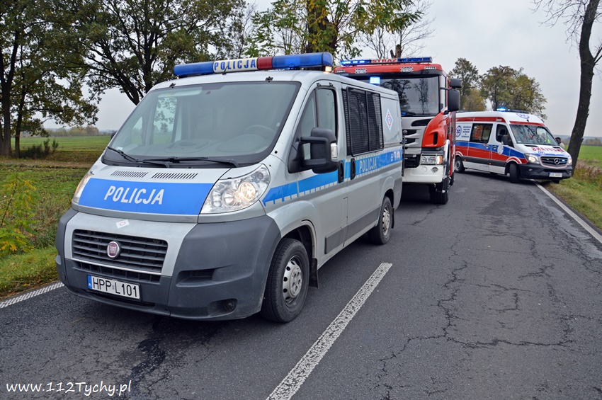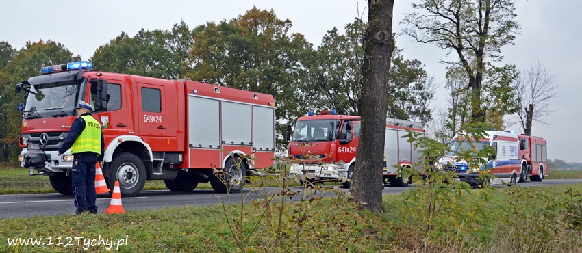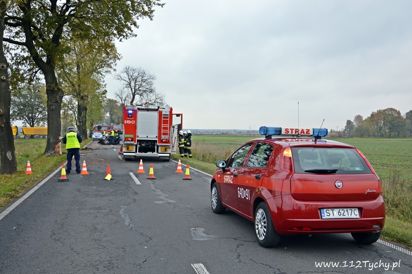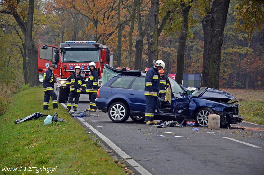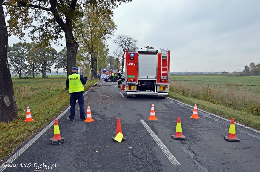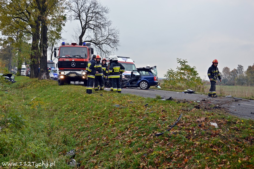 24 października około godziny 9.17 do SKKM PSP Tychy wpłynęło zgłoszenie o zdarzeniu drogowym w Bojszowach na ulicy Gościnnej w rejonie starej dyskoteki. Ze zgłoszenia wynikało, że w zdarzeniu brały udział dwa samochodu osobowe Audi i Dacia, a jeden z kierowców jest zakleszczony w swoim pojeździe. Na miejsce natychmiast zadysponowane zostały zastępy OSP Bojszowy (GBA), OSP Bojszowy Nowe (GBA), JRG Tychy (GBAPr, GCBARt, SCRt), ZRM i patrole bieruńskiej Policji. Po przybyciu na miejsce zgłoszenie potwierdziło się. Strażacy zabezpieczyli miejsce zdarzenia, a następnie przystąpili do udzielania kwalifikowanej pierwszej pomocy poszkodowanym z samochodu Dacia oraz wykonaniu dostępu i ewakuacji poszkodowanego młodego mężczyzny z wraku Audi. Kierowca Audi nieprzytomny z licznymi obrażeniami został przetransportowany do szpitala. Do szpitala przewieziona została również jedna z osób podróżujących Dacią. Ruch w miejscu zdarzenia został całkowicie zablokowany. Bieruńscy Policjanci wyznaczyli objazdy lokalnymi drogami. Trwa ustalanie przyczyn i okoliczności tego zdarzenia. Ze wstępnych ustaleń pracujących na miejscu Policjantów wynika, ze kierujący Audi wyprzedzał Dacię, która uderzyła w jego prawy bok powodując utratę panowania nad pojazdami. Audi z ogromna siłą uderzyło w przydrożne drzewo, a Dacia wypadła z drogi i zatrzymała się kilkanaście metrów dalej w przydrożnym rowie. Na miejsce zadysponowany został śmigłowiec LPR jednak ze względu na złe warunki atmosferyczne został on odwołany. Droga zablokowana była kilka godzin. Dopiero około godziny 14 droga została odblokowana. Na miejsce wypadku dotarli również prokurator i oficer operacyjny z KM PSP Tychy (SLOp). Bieruńscy Policjanci pod nadzorem Prokuratury Rejonowej w Tychach prowadzą dalsze czynności mające na celu wyjaśnienie dokładnych przyczyn i okoliczności tego zdarzenia.