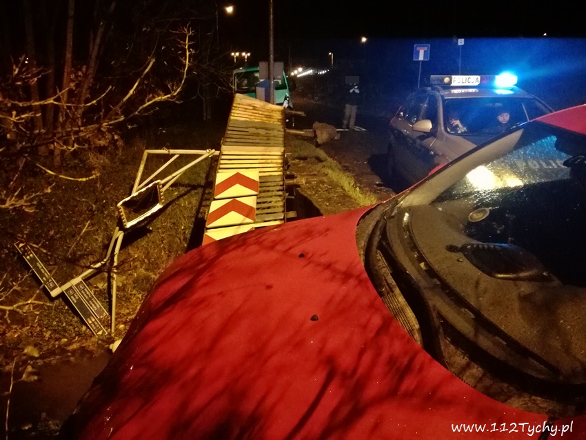 29 października około godziny 17 na ulicy Dworcowej doszło do zdarzenia drogowego. Kierujący samochodem Alfa Romeo jadąc od ulicy Browarowej w kierunku ulicy Damrota utracił panowanie nad swoim pojazdem i uderzył w bariery znajdujące na wprost (nad ciekiem wodnym) wyjazdu z tunelu. Na miejsce wezwany został patrol Policji. Jak się okazało po dotarciu Policji na miejsce powodem utraty panowania nad pojazdem był stan trzeźwości kierującego. Badanie wskazało około 1 promila w wydychanym powietrzu. Kierowca został zatrzymany. Na miejsce dodatkowo wezwany został policyjny technik, który wykonał dokumentację fotograficzną oraz zebrał ślady z wnętrza rozbitego samochodu. Rozbita osobówka została odholowana na policyjny parking. Dalsze czynności wobec kierującego zostaną przeprowadzone po jego wytrzeźwieniu. W miejscu zdarzenia zostaną postawione bariery zastępcze. Tyscy Policjanci prowadzą dalsze czynności w sprawie tego zdarzenia.