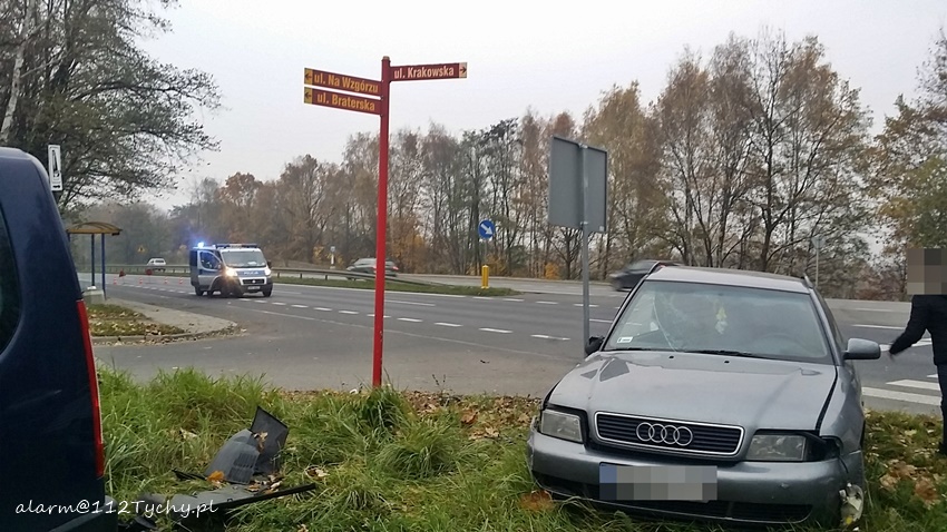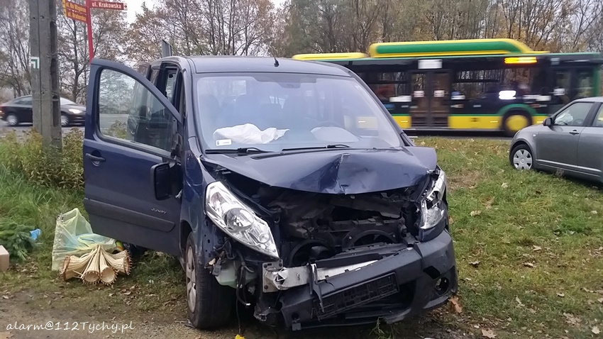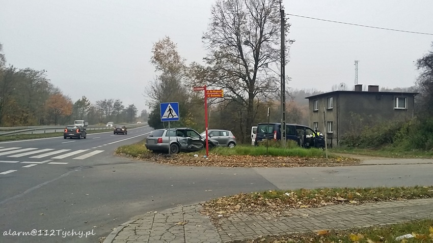 9 listopada około godziny 6 w Mikołowie na ulicy Krakowskiej (DK 44) w rejonie skrzyżowania z ul. Na Wzgórzu doszło do zdarzenia drogowego. Na miejsce zadysponowani zostali mikołowscy strażacy z JRG Mikołów (GBA, SRt), ZRM i patrol mikołowskiej Policji. Po dotarciu na miejsce zgłoszenie potwierdziło się. Jak wstępnie ustalili pracujący na miejscu Policjanci kierująca samochodem Audi jadąc od Mikołowa wykonywała manewr skrętu w lewo z ul. Krakowskiej w ul. Na Wzgórzu i nie ustąpiła pierwszeństwa przejazdu jadącemu od Tychów w stronę Mikołowa kierującemu dostawczym Citroenem. Doszło do czołowo bocznego zderzenia. W wyniku tego zderzenia uszkodzone pojazdy zjechał na pobliski pas zieleni. Pasażer Audi z obrażeniami ciała został zabrany do szpitala. Na czas działań ratowniczych prawy pas ul. Krakowskiej był wyłączony z ruchu. Utrudnienia w ruchu w miejscu zdarzenia trwały ponad dwie godziny. Mikołowscy Policjanci prowadzą dalsze czynności w sprawie tego zdarzenia.
