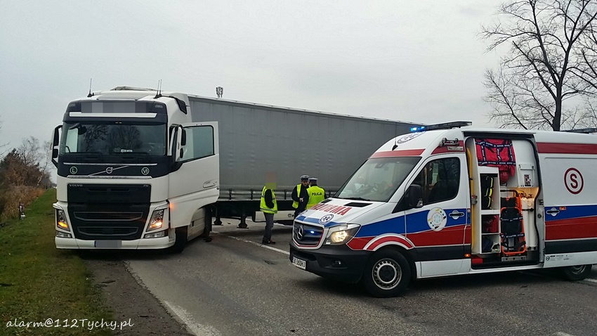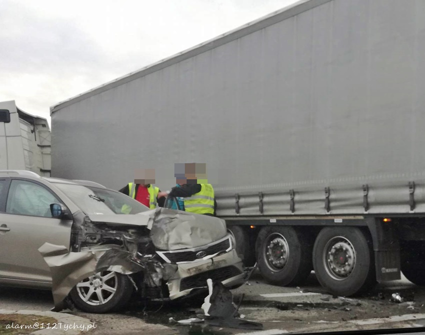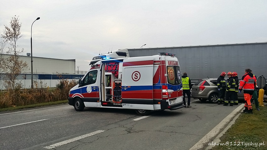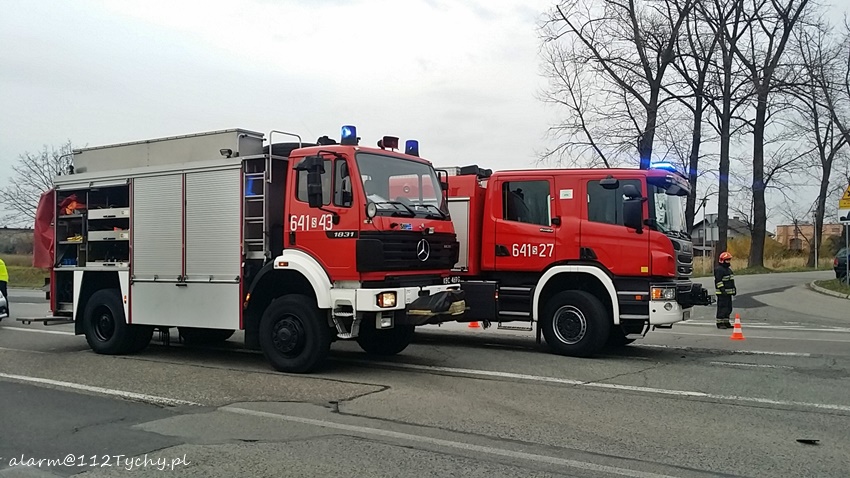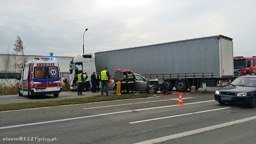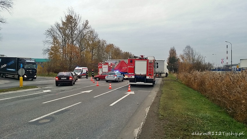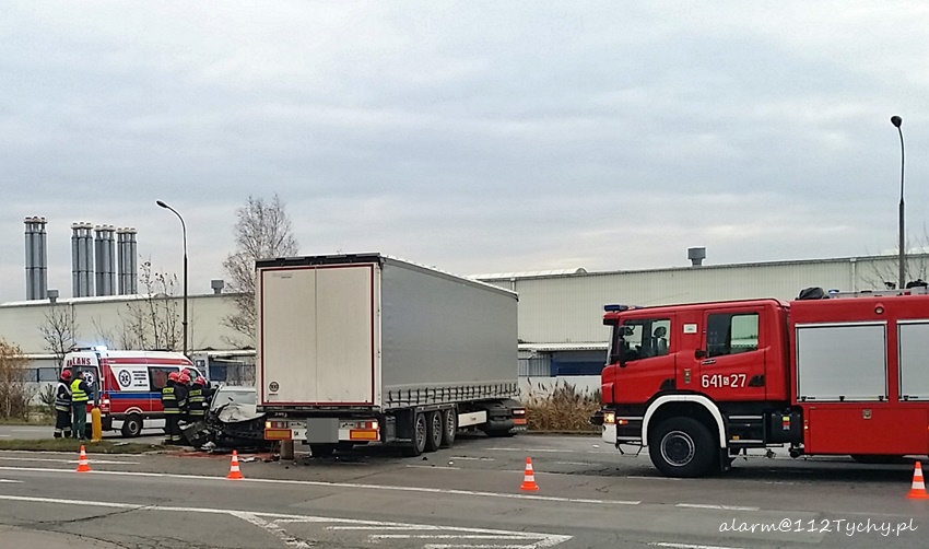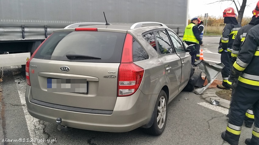 10 listopada około godziny 15 do dyżurnego SKKM PSP Tychy wpłynęło zgłoszenie o zdarzeniu drogowym na skrzyżowaniu ulicy Turyńskiej (DK 44) z ul. Samochodową. Ze zgłoszenia wynikało, że samochód osobowy uderzył w naczepę samochodu ciężarowego. Na miejsce natychmiast zadysponowane zostały trzy zastępy JRG Tychy (GBA, GCBARt,, SCRt), ZRM i patrol Policji. Po dotarciu na miejsce zgłoszenie potwierdziło się. Jak się okazało kierujący samochodem ciężarowym marki Volvo z naczepą na słowackich rejestracjach wykonywał manewr zawracania w kierunku Bierunia, a kierujący samochodem osobowym KIA uderzył naczepę. Kierujący samochodem osobowym po opatrzeniu na miejscu przez ratowników medycznych został przetransportowany do szpitala na dokładniejsze badania. W miejscu zdarzenia ruch w kierunku Bierunia został wstrzymany, a następnie puszczony „pod prąd” wyznaczonym pasem. Ruch w kierunku Tychów odbywał się ulicą Samochodową – Dworską – Mysłowicką oraz prawym pasem ul. Turyńskiej. Przed godziną 17 uszkodzone pojazdy zostały usunięte z drogi i ruch został przywrócony. Policjanci prowadzą dalsze czynności w sprawie tego zdarzenia.