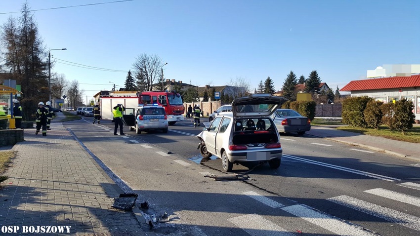 10 grudnia około godziny 10.40 w Bojszowach na skrzyżowaniu ulic Gościnnej (DW 931) z ul. Gaikową i Jedlińską doszło do czołowo bocznego zderzenia dwóch samochodów osobowych. W zdarzeniu brały udział Peugeot i Fiat Seicento. Na miejsce zadysponowane zostały zastępy OSP Bojszowy (GBA, GBA), JRG Tychy (GBA, GBA, SCRt), ZRM oraz bieruńska Policja. Ruch na skrzyżowaniu został całkowicie wstrzymany. Pięć osób podróżujących pojazdami zostało poszkodowanych. Na miejsce dodatkowo zadysponowany został śmigłowiec HEMS – Ratownik 4 z bazy w Gliwicach. Jedna osoba (pasażer Peugeota) śmigłowcem został przetransportowany do szpitala w Oświęcimiu. Pozostali poszkodowani zostali przetransportowani do szpitala karetkami pogotowia. Jak wstępnie ustalili pracujący na miejscu Policjanci winnym zdarzenia jest kierowca Peugeota, który jadąc ul. Gaikową przejeżdżał przez skrzyżowanie z ul. Gościnną na wprost w ul. Jedlińską wymusił pierwszeństwo przejazdu na kierującym Fiatem Seicento, który jechał od Bierunia w kierunku Pszczyny. Utrudnienia w ruchu trwały ponad godzinę. Bieruńscy Policjanci prowadzą dalsze czynności w sprawie tego zdarzenia.
