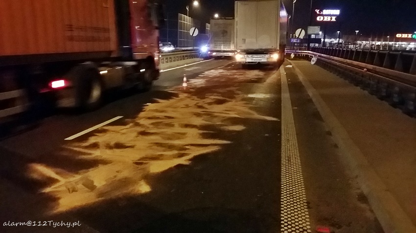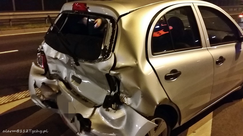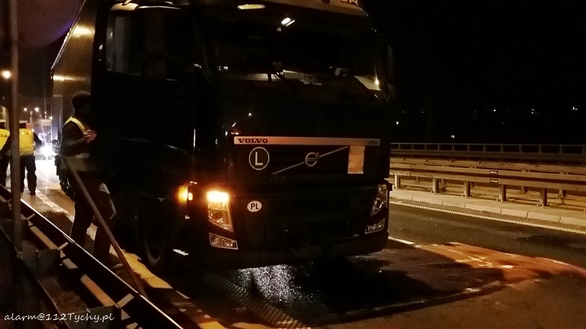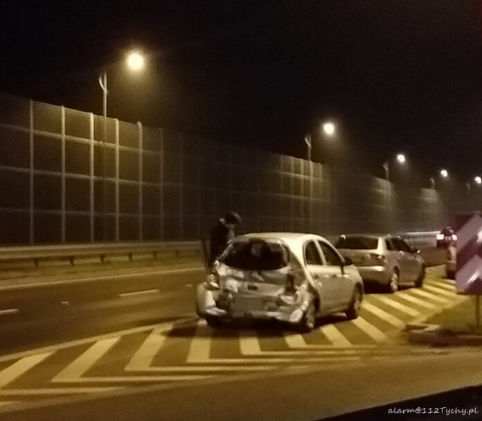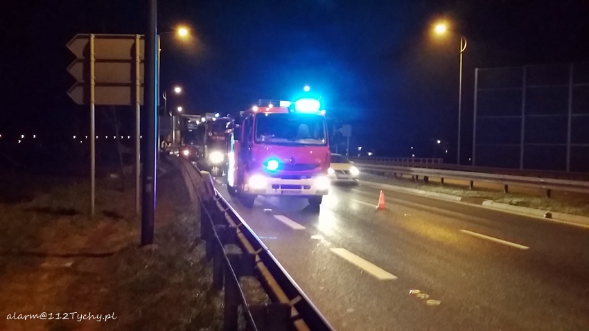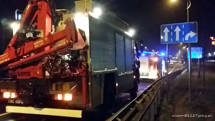 13 grudnia około godziny 17 na ul. Beskidzkiej (DK1) na pasie w kierunku Katowic w rejonie zjazdu do marketów Saturn i OBI doszło do zdarzenia drogowego z udziałem samochodu osobowego Nissan i ciężarowego Volvo z naczepą. Na miejsce zadysponowane zostały zastępy JRG Tychy (GBA, SCRt), patrol Policji i ZRM. Kierujący Nissanem uskarżał się na ból w okolicy szyi i został przewieziony do szpitala na badania. Jak ustalili pracujący na miejscu zdarzenia funkcjonariusze Policji, przyczyną zdarzenia było najprawdopodobniej niezachowanie odpowiedniej odległości od poprzedzającego pojazdu przez kierującego samochodem ciężarowym. Na szczęście kierującemu Nissanem nic poważnego się nie stało po badaniach został wypuszczony do domu. Kierowca ciężarówki został ukarany mandatem. W trackie wykonywania działań na miejscu zdarzenia prawy pas był wyłączony z ruchu. Po usunięciu uszkodzonych pojazdów przez holowniki pomocy drogowej strażacy znaturalizowali plamy płynów eksploatacyjnych. Około godziny 20 ruch został całkowicie przywrócony.