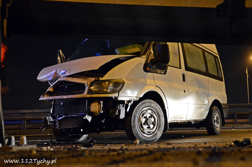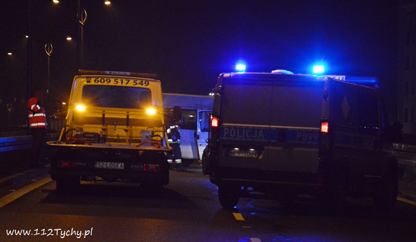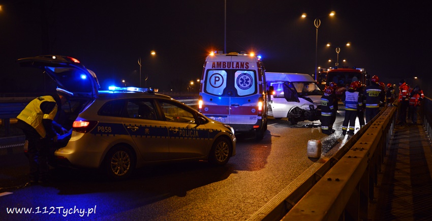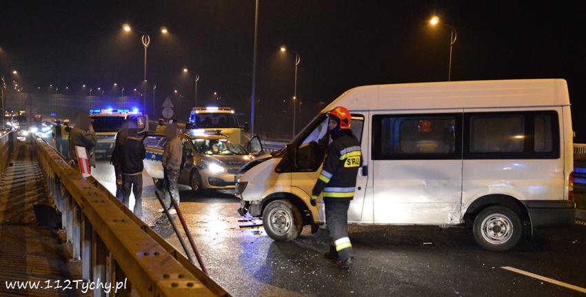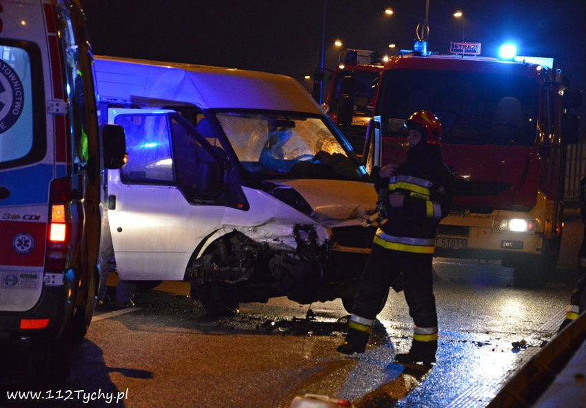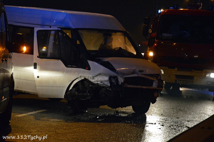29 grudnia około godziny 17.20 na ulicy Beskidzkiej (trasa DK 1) w kierunku Pszczyny zaraz za zjazdem na al. Niepodległości doszło do zdarzenia drogowego z udziałem dwóch samochodów. W zdarzeniu brały udział Ford Transit i Renault Laguna. Na miejsce natychmiast zadysponowane zostały trzy zastępy JRG Tychy (GBAPr, GCBARt, SCRt), ZRM i patrole Policji. Trasa w kierunku Pszczyny została na czas działań ratunkowych całkowicie zablokowana. Objazd został wytyczony zjazdem na al. Niepodległości i przez rondo na wprost i ponownie wjazd na trasę oraz ulicami Edukacji – Wyszyńskiego – al. Niepodległości do ul. Beskidzkiej. Jedna z osób podróżujących Fordem została przetransportowana do szpitala na badania. Busem podróżowało sześć osób (kierowca i pięciu pasażerów)Pozostali uczestnicy zdarzenia zostali opatrzeni na miejscu. Po wykonaniu wszystkich czynności na miejscu zdarzenia rozbite pojazdy zostały odholowane. Działania strażaków na miejscu zdarzenia poza udzielaniem kwalifikowanej pierwszej pomocy uczestnikom zdarzenia, polegały na zabezpieczeniu miejsca zdarzenia oraz odłączeniu akumulatorów w rozbitych pojazdach i neutralizacji płynów eksploatacyjnych. Uszkodzone pojazdy zostały odholowane. Jak udało nam się ustalić winnym zdarzenia jest 48 – letni kierowca Forda Transita, który nie dostosował prędkości do panujących warunków na drodze i wpadł w poślizg uderzając w barierki energochłonne, a dodatkowo uderzając w samochód osobowy. Kierujący Fordem został ukarany mandatem za spowodowanie kolizji. Około godziny 19.20 trasa został odblokowana.