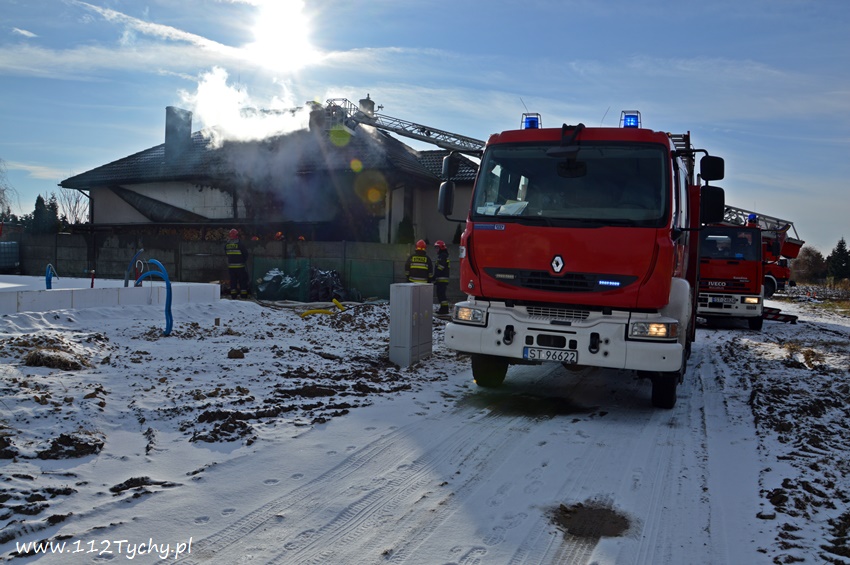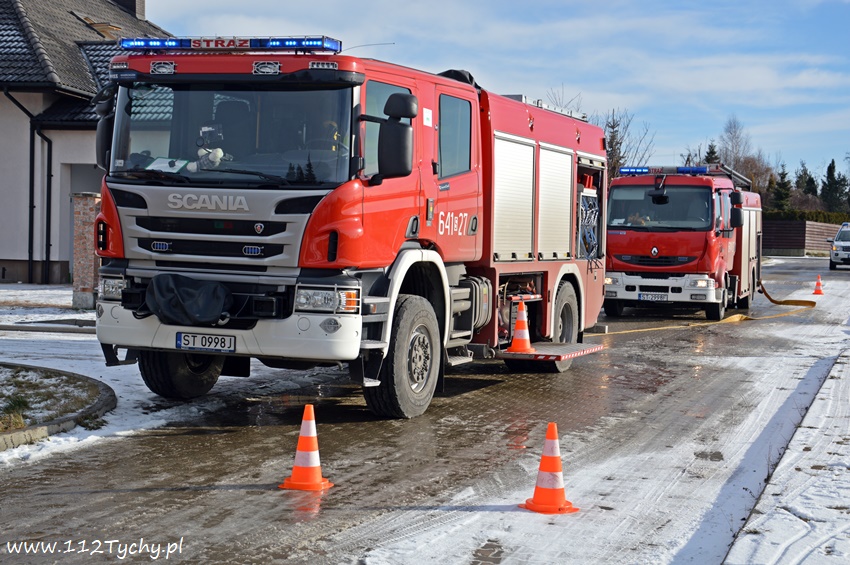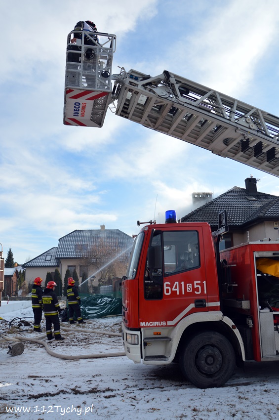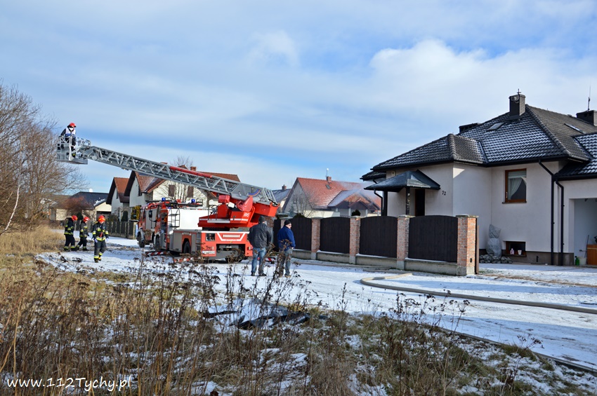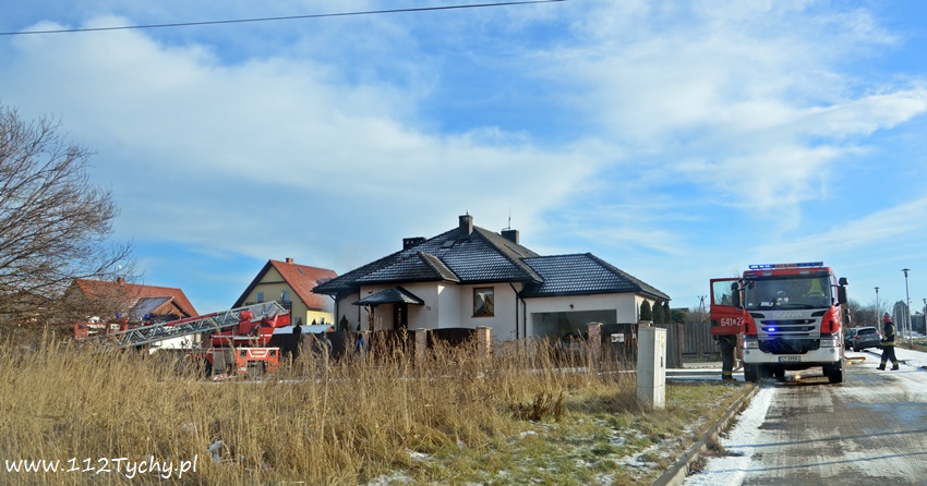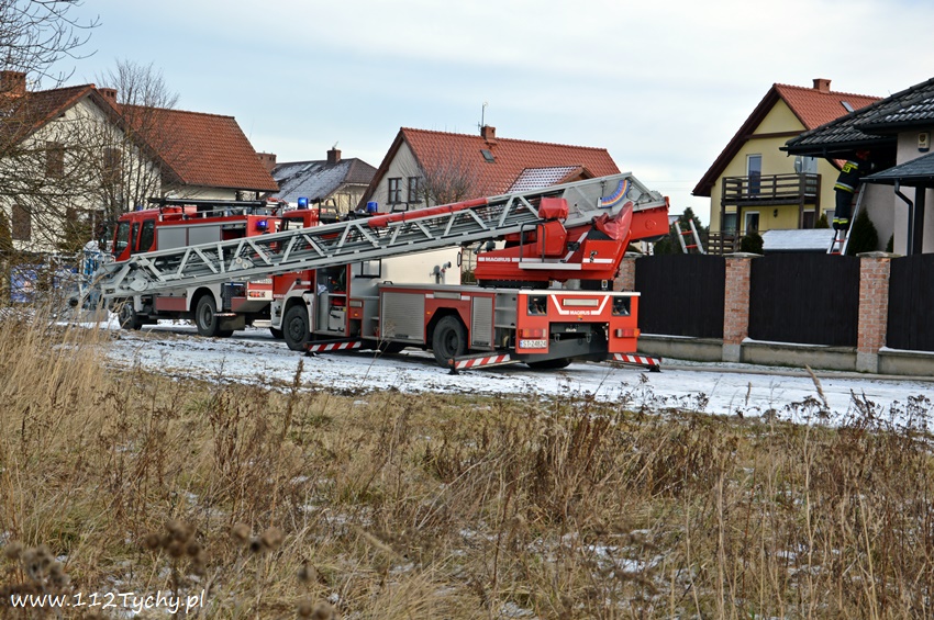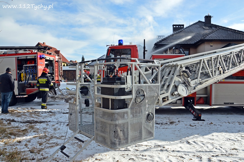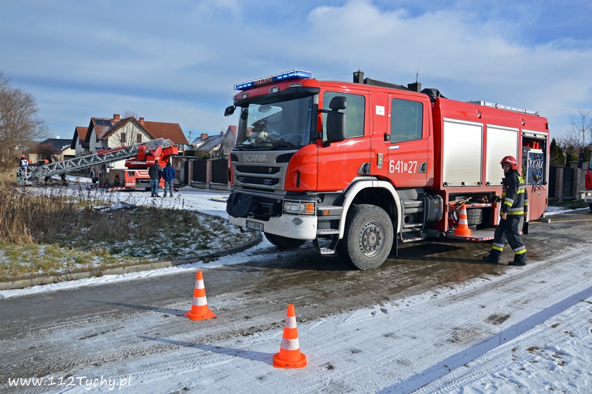 17 stycznia około godziny 10.50 dyżurny SKKM PSP Tychy otrzymał zgłoszenie o pożarze dachu domu jednorodzinnego przy ul. Mąkołowskiej. Ze zgłoszenia wynikało, że poza dachem pożarem objęte jest składowane przy ścianie budynku drewno. Na miejsce natychmiast wysłany został pluton gaśniczy JRG Tychy (GBA, GBA, GCBARt, SD) oraz patrol Policji. Po dotarciu na miejsce zgłoszenie potwierdziło się. Celem ugaszenia pożaru podane zostały prądy wody na palące się drewno oraz podbitkę dachu. Na szczęście dzięki wczesnemu zauważeniu pożaru oraz szybkiej reakcji strażaków pożar udało się szybko opanować i ugasić. Spaleniu częściowo składowane drewno, podbitka dachu oraz około 20m2 ocieplenie budynku. Cały czas sytuacja pożarowa kontrolowana była przy użyciu kamery termowizyjnej. Na miejsce dodatkowo przyjechał dowódca JRG Tychy (SLRr) oraz wezwane zostało pogotowie gazowe. Po około dwóch godzinach działania zostały zakończone i zastępy wróciły do koszar. Przez cały czas trwania działań gaśniczych rejon operacyjny KM PSP Tychy zabezpieczał zastęp OSP Lędziny (GBA).