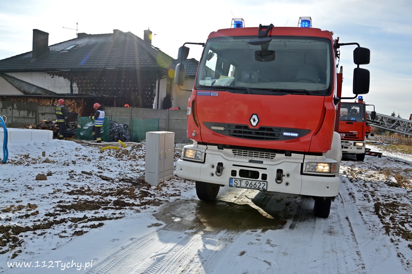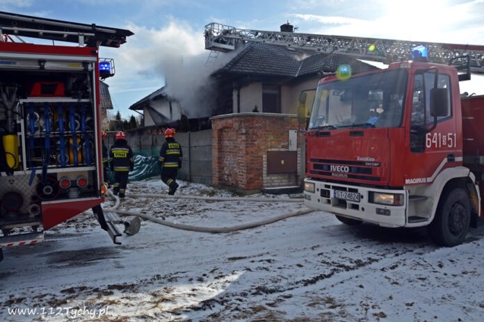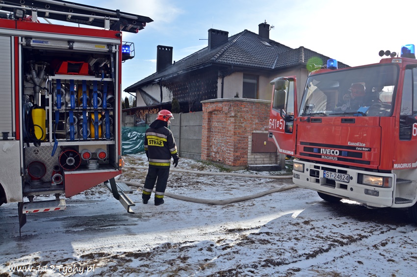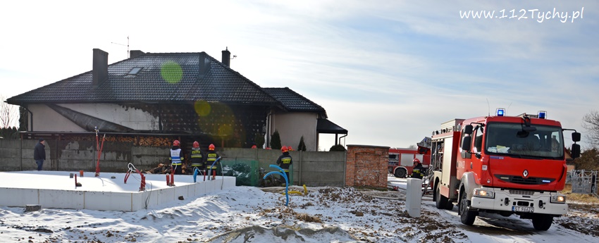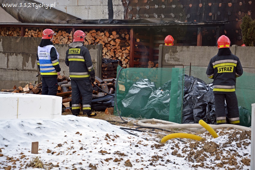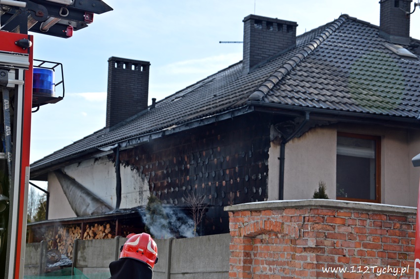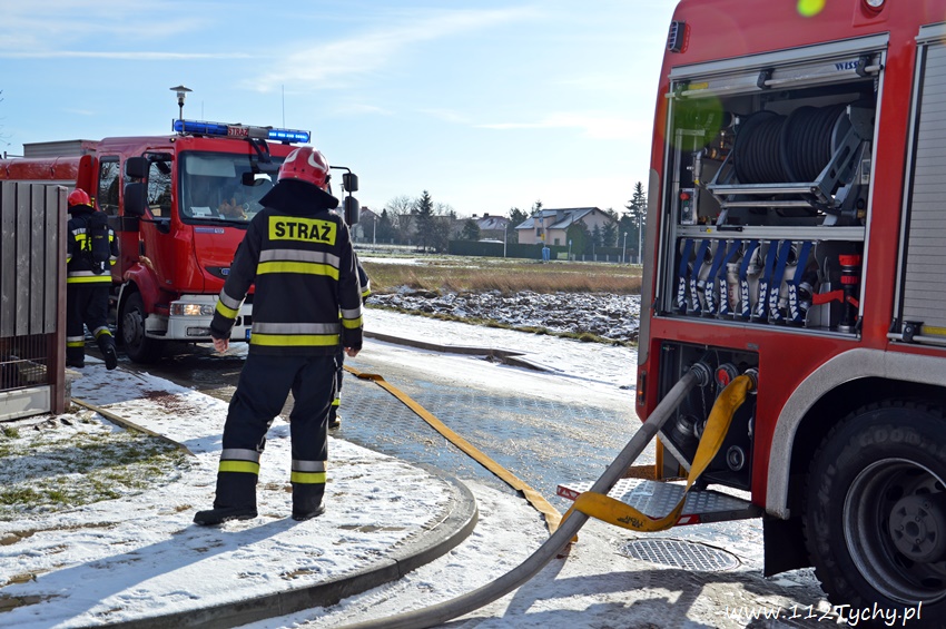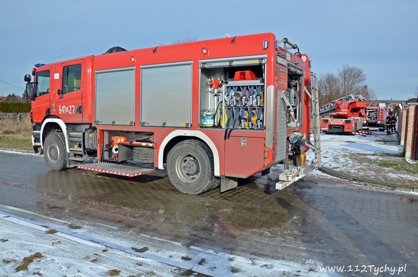 17 stycznia około godziny 10.50 dyżurny SKKM PSP Tychy otrzymał zgłoszenie o pożarze dachu domu jednorodzinnego przy ul. Mąkołowskiej. Ze zgłoszenia wynikało, że poza dachem pożarem objęte jest składowane przy ścianie budynku drewno. Na miejsce natychmiast wysłany został pluton gaśniczy JRG Tychy (GBA, GBA, GCBARt, SD) oraz patrol Policji. Po dotarciu na miejsce zgłoszenie potwierdziło się. Celem ugaszenia pożaru podane zostały prądy wody na palące się drewno oraz podbitkę dachu. Na szczęście dzięki wczesnemu zauważeniu pożaru oraz szybkiej reakcji strażaków pożar udało się szybko opanować i ugasić. Spaleniu częściowo składowane drewno, podbitka dachu oraz około 20m2 ocieplenie budynku. Cały czas sytuacja pożarowa kontrolowana była przy użyciu kamery termowizyjnej. Na miejsce dodatkowo przyjechał dowódca JRG Tychy (SLRr) oraz wezwane zostało pogotowie gazowe. Po około dwóch godzinach działania zostały zakończone i zastępy wróciły do koszar. Przez cały czas trwania działań gaśniczych rejon operacyjny KM PSP Tychy zabezpieczał zastęp OSP Lędziny (GBA).