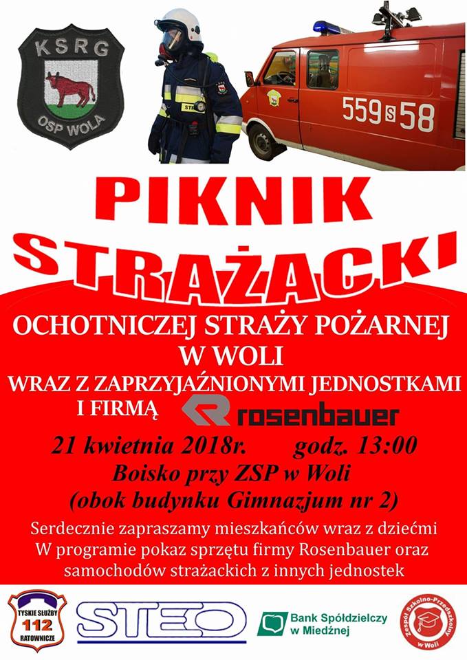 21 kwietnia na terenie Zespołu Szkół w Woli odbył się I Piknik Strażacki zorganizowany przez druhów OSP Wola i reporterów portalu 112Tychy.pl. Główną atrakcją pikniku był pokaz sprzętu ochrony indywidualnej oraz podręcznego sprzętu gaśniczego firmy Rosenbauer. Przedstawiciele firmy zademonstrowali ubrania specjalne Fire Max 3, hełmy Heros Titan , rękawice ochronne, buty, prądownice i lance gaśnicze, a także motopompa Fox, pompa Nautilus oraz najaśnice. Strażacy OSP Wola na piknik zaprosili kilkanaście jednostek OSP, m.in. Miedźna, Gilowice, Brzezinka, Brzeszcze, Brzeszcze Bór, Dankowice, Jankowice, Bojszowy Nowe, Bojszowy, Bieruń Stary, Bieruń Nowy, Chełm Śląski, Mikołów, a także przedstawicieli PSP z Oświęcimia i Tychów. W trakcie pikniku strażacy jak i mieszkańcy Woli mogli zapoznać się ze sprzętem oraz spróbować swoich sił jako strażak. W pikniku wzięli również udział przedstawiciele grupy Spectre Moto Tychy oraz ratownik z Polskiej Grupy Ratowniczej z Chrzanowa, który zaprezentował udzielanie pierwszej pomocy i użycie defibrylatora AED. Dla dzieci zorganizowane zostały liczne atrakcje. Po godzinie 15.30 odbyło się tzw. światełko – wszystkie zgromadzone pojazdy zademonstrowały sygnalizację świetlną i dźwiękową. Zgromadzeni goście mogli spróbować również strażackiej grochówki.