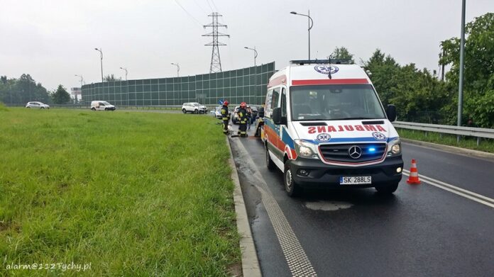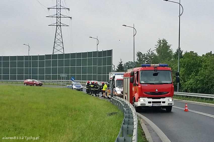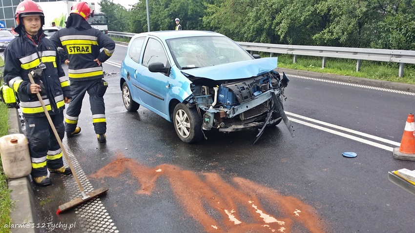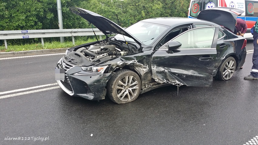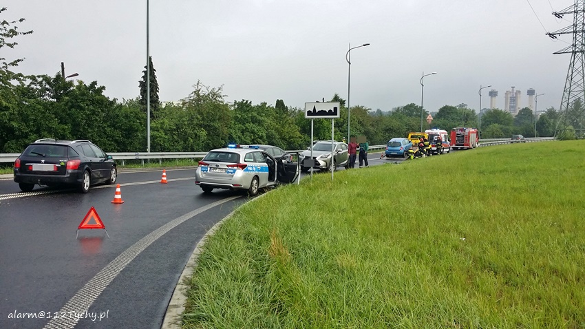12 czerwca około godziny 8 na łączniku ulicy Towarowej z trasa DK1 w kierunku Pszczyny doszło do zdarzenia drogowego. Na miejsce zdarzenia wezwany został ZRM i patrol Policji. Jak się okazało po dotarciu na miejsce doszło do czołowo bocznego zderzenia osobowego Renault i Lexusa. Ze wstępnych ustaleń pracujących na miejscu Policjantów winę za zdarzenie ponosi kierująca osobowym Renault kobieta, która na mokrej nawierzchni utraciła panowanie nad swoim pojazdem i uderzyła w bok nadjeżdżającego z naprzeciwka Lexusa. Na szczęście uczestnikom zdarzenia nic się nie stało. Ze względu na wycieki płynów eksploatacyjnych na miejsce wezwany został zastęp straży pożarnej z JRG Tychy (GBA). Do czasu usunięcia rozbitych pojazdów przez holowniki pomocy drogowej ruch odbywał się wahadłowo. Tyscy Policjanci prowadzą dalsze postępowanie w tej sprawie.