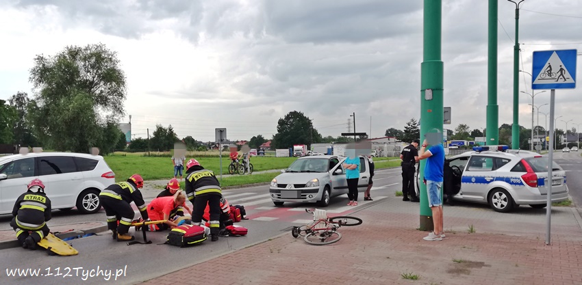 16 czerwca po godzinie 11 dyżurny KMP Tychy otrzymał zgłoszenie o potrąceniu rowerzysty na ulicy Jaśkowickiej. Na miejsce natychmiast zadysponowany został ZRM, patrole Policji oraz zastęp JRG Tychy (GBAPr). Po dotarciu na miejsce zgłoszenie potwierdziło się. Wjazd na rondo „Żwakowskie” (Jaśkowicka – Stoczniowców 70) w kierunku osiedla K został zablokowany. Do zdarzenia doszło na oznakowanym przejściu dla pieszych i przejeżdżania rowerzystów w poprzek drogi (znak D – 6b). Rowerzysta (ok. 60l) doznał urazu stawu skokowego lewej nogi. Został zaopatrzony na miejscu, a następnie został przetransportowany do szpitala na dalszą diagnostykę i leczenie. Jak udało się wstępnie ustalić pracującym na miejscu Policjantom nie doszło do potrącenia. Rowerzysta znajdując się już na przejściu dla pieszych miał się wystraszyć nadjeżdżającego samochodu osobowego i utracił panowanie nad swoim rowerem i upadł opierając się tylko o osobówkę. Kierowca samochodu osobowego był trzeźwy. Utrudnienia w ruchu w miejscu zdarzenia trwały ponad godzinę. W związku z obrażeniami rowerzysty rozstrzygnięciem tego zdarzenia zajmie się sąd. Tyscy Policjanci prowadzą dalsze czynności w tej sprawie.