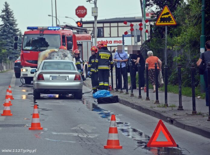 6 lipca około godziny 11 dyżurny SKKM PSP Tychy otrzymał zgłoszenie o pożarze samochodu osobowego na ulicy Burschego w rejonie skrzyżowania z ulicą Mikołowską. Na miejsce zadysponowany został zastęp JRG Tychy (GBA). Po dotarciu na miejsce zgłoszenie potwierdziło się. Strażacy przy użyciu linii szybkiego natarcia szybko ugasili ogień. Spaleniu uległa komora silnika osobówki. W miejscu pożaru występowały utrudnienia w ruchu. Spalony pojazd zostanie odholowany przez pomoc drogową. Przyczyną pożaru najprawdopodobniej było zwarcie instalacji elektrycznej w pojeździe.