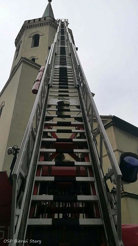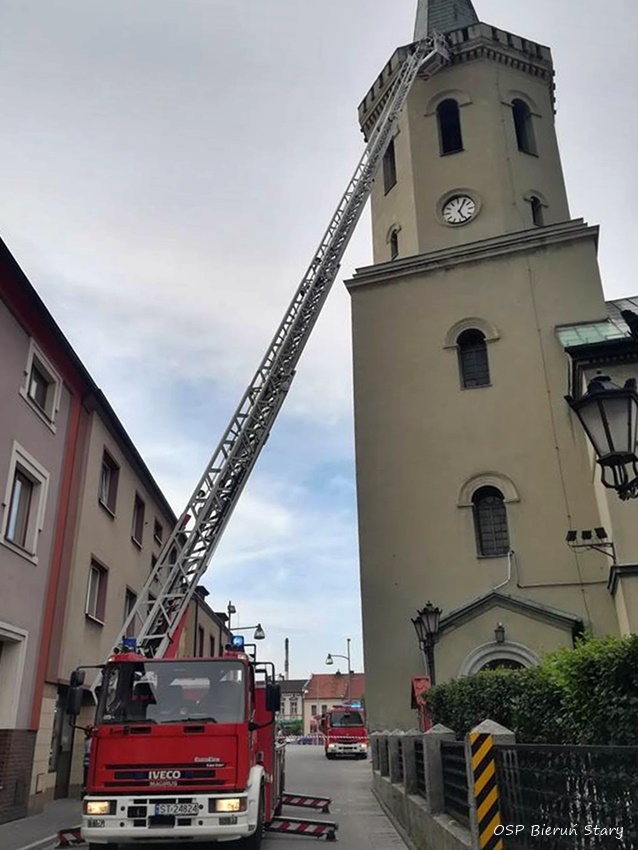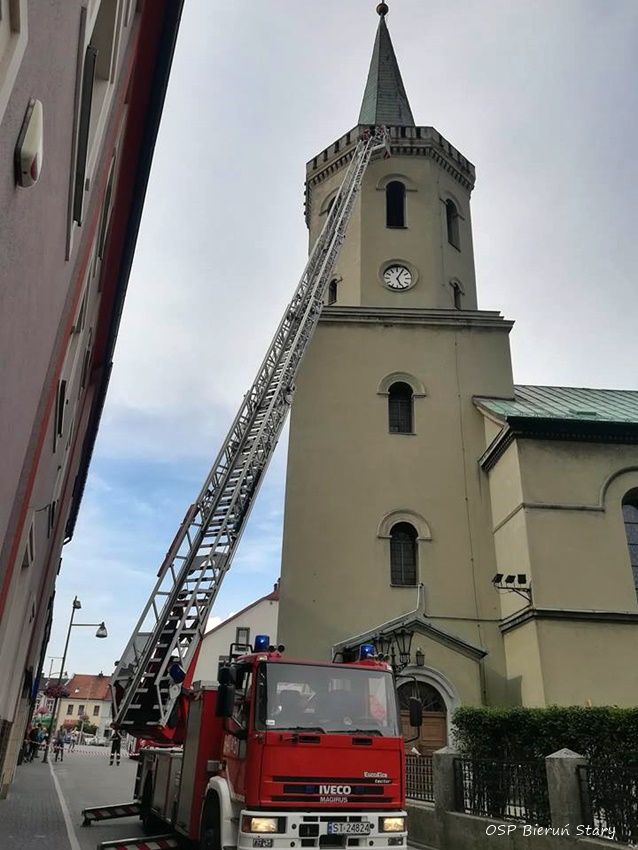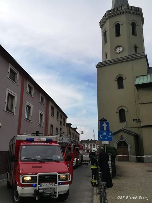 28 lipca po godzinie 17 dyżurny SKKM PSP Tychy otrzymał zgłoszenie od proboszcza parafii pw. św. Bartłomieja Apostoła w Bieruniu Starym o odpadającym tynku z wieży kościoła. Na miejsce zadysponowane zostały zastępy OSP Bieruń Stary (GLBM) i JRG Tychy (GBA, SD). Po przybyciu na miejsce strażacy po sprawieniu drabiny mechanicznej usunęli elementy odpadające ze ściany. Na czas działań ruch na ulicy Krakowskiej w rejonie kościoła został wstrzymany. Po około godzinie działania zostały zakończone i zastępy wróciły do koszar.