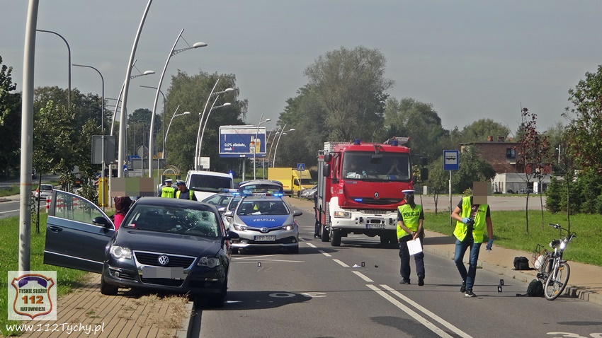 11 września około godziny 12.20 dyżurni KMP Tychy i SKKM PSP Tychy otrzymali zgłoszenie z CPR Katowice o potraceniu rowerzysty na ulicy Cmentarnej w rejonie parkingu przy cmentarzu komunalnym na Wartogłowcu. Na miejsce natychmiast zadysponowane zostały zastępy JRG Tychy (GBA, SCRt), patrol drogówki oraz ZRM. Po dotarciu na miejsce pierwszych ratowników okazało się, że sytuacja jest bardzo poważna. Na miejsce wezwane zostały kolejne patrole Policji, a ratownicy medyczni podjęli decyzje o konieczności wezwania na miejsce latającej karetki. W wyniku zderzenie rowerzysta (65 letni mężczyzna) doznał rozległych obrażeń, m.in. urazu głowy, klatki piersiowej oraz kończyn. Kierowca osobowego VW w chwili zdarzenia był trzeźwy. Na miejsce wezwany został policyjny technik kryminalistyki celem wykonania pełnej dokumentacji ze zdarzenia. Dodatkowo na miejsce przybył oficer operacyjny z KM PSP Tychy (SOp). Będący na miejscu strażacy poza udzieleniem rowerzyście pierwszej pomocy wyznaczyli i zabezpieczyli na pobliskim parkingu lądowisko dla śmigłowca LPR – Ratownik 4 z bazy w Gliwicach. Rowerzysta w stanie ciężkim zagrażającym jego życiu (nieprzytomny) został przetransportowany do szpitala w Sosnowcu. Przez blisko trzy godziny ruch na ulicy Cmentarnej w miejscu zdarzenia był całkowicie wstrzymany. Ze wstępnych ustaleń pracujących na miejscu Policjantów wynika, że kierujący jednośladem jadąc ulicą Cmentarną w kierunku ulicy Oświęcimskiej z niewyjaśnionych przyczyn utracił panowanie nad swoim rowerem i zjechał na przeciwległy pas zderzając się z jadącym z naprzeciwka VW kierowanym przez 61 letniego mężczyznę. Kierowca VW próbował uniknąć zderzenia zjeżdżając na chodnik niestety bezskutecznie. Tyscy Policjanci prowadzą dalsze postępowanie w sprawie tego nieszczęśliwego zdarzenia.