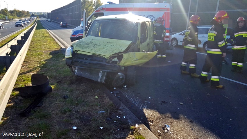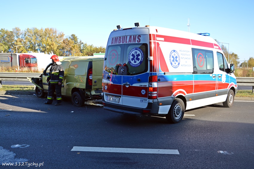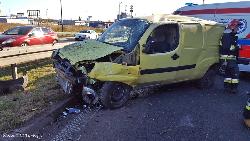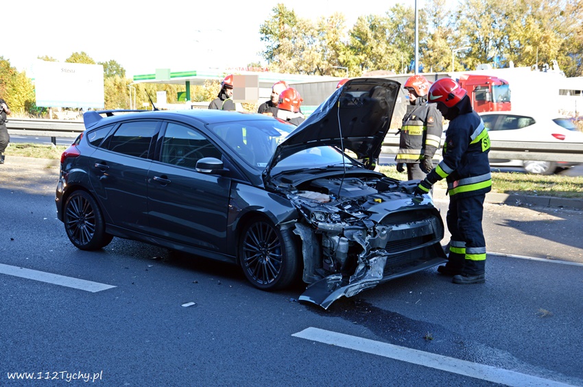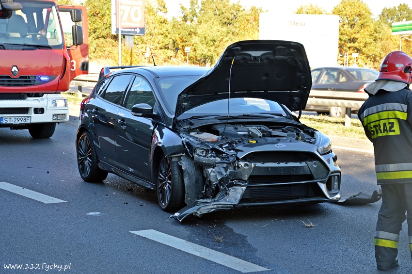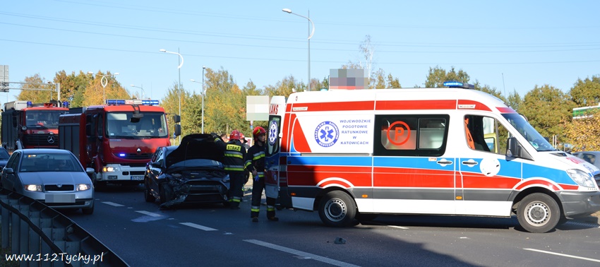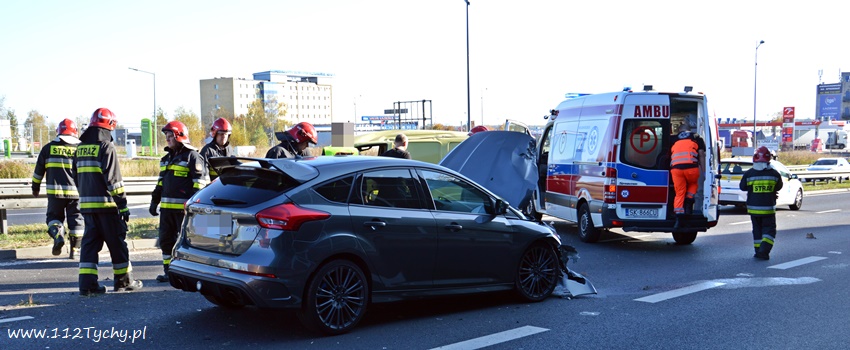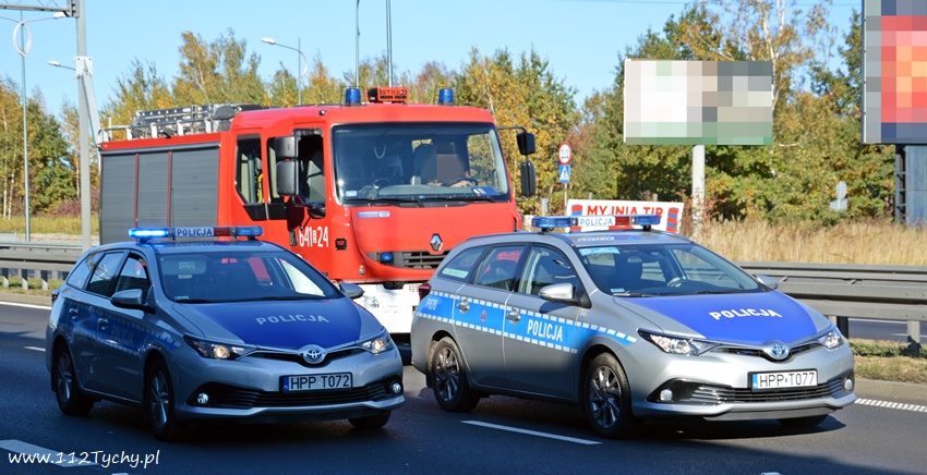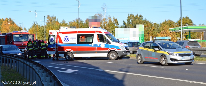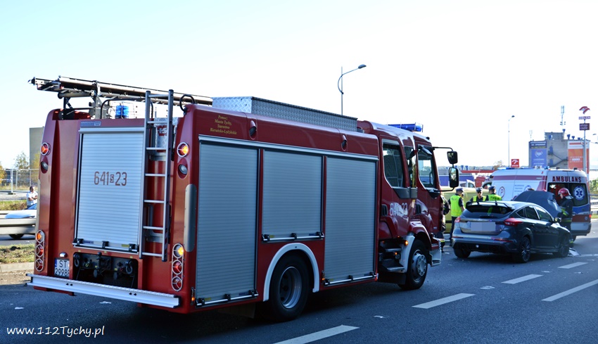 14 października kilka minut po godzinie 15 dyżurni KMP Tychy i SKKM PSP Tychy otrzymali zgłoszenie o zderzeniu dwóch pojazdów na ulicy Beskidzkiej (DK 1) tuż przed zjazdem na ulicę Towarową na pasach w kierunku Pszczyny. Ze zgłoszenia wynikało, że w wyniku tego zdarzenia jeden z pojazdów dachował. Na miejsce natychmiast zadysponowane zostały patrole WRD KMP Tychy, ZRM oraz zastępy JRG Tychy (GBA, GBAPr, SCRt). Po dotarciu na miejsce zgłoszenie potwierdziło się. Pierwszej pomocy najbardziej poszkodowanemu kierowcy Fiata udzielali już pracownicy jednej z tyskich firm ochroniarskich, którzy zatrzymali się w miejscu zdarzenia. Dwa pasy w kierunku Pszczyny zostały zablokowane, a ruch został skierowany na pas do skrętu w prawo. Z ustaleń pracujących ma miejscu Policjantów wynika, że do zdarzenia doszło podczas, gdy kierowca Fiata ( 47 letni mężczyzna) wykonywał manewr zmiany pasa ruchu z prawego na lewy i zahaczył tyłem swojego pojazdu o jadącego lewym pasem Forda ( kierowany przez 23 letniego mężczyznę). W wyniku kontaktu pojazdów Fiat dachował. Kierowca Fiata trafił pod opiekę ratowników medycznych. Obydwaj kierujący byli trzeźwi. Około godziny 16.30 uszkodzone pojazdy zostały odholowane, a droga uprzątnięta. Kierowca Fiata został ukarany mandatem karnym.